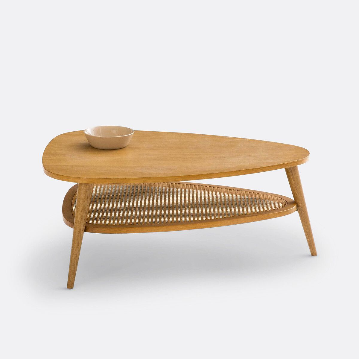 Декоративный журнальный столик Quilda отличается дизайном в винтажном стиле и сочетает дуб и плетеный ротанг, натуральные цвета и две столешницы.