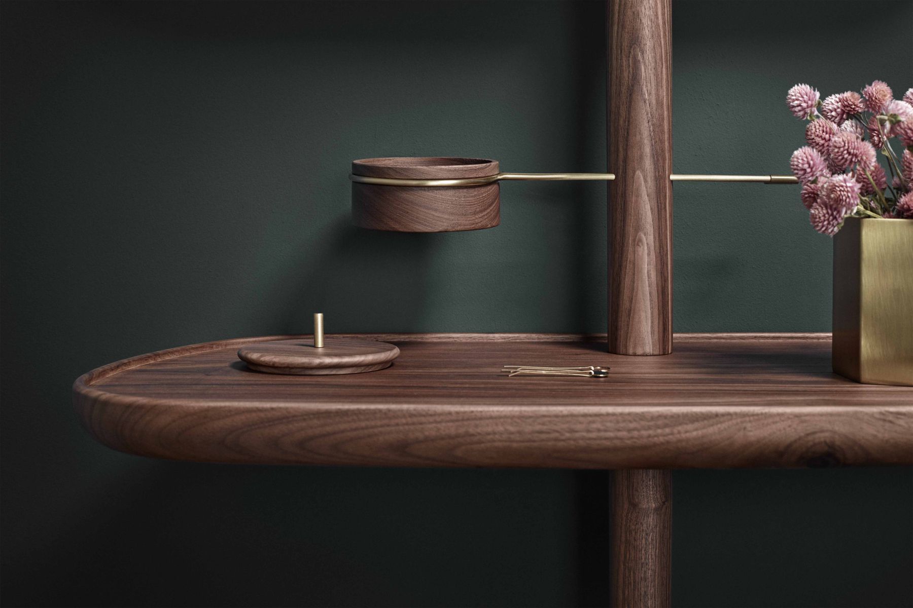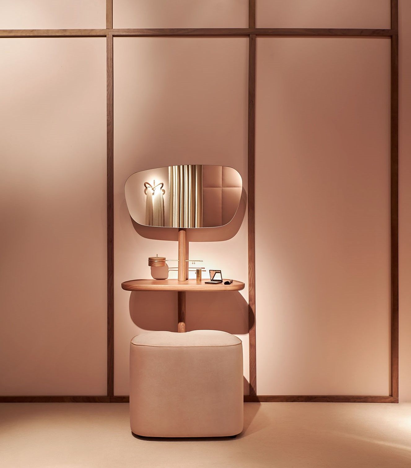 Во время проектирования столика Momentos в Nomon держали в уме образ чувствительной современной женщины, крайне требовательной к эстетике и функции окружающих её вещей. Вот почему этот туалетный столик сразу выделяется из ряда подобной мебели мягкостью линий, совершенством материалов и продуманностью конструкции.Когда пуф не нужен, его можно задвинуть под столик, в тёплые объятия опоры из массива грецкого ореха. Часть «секретов очарования» можно спрятать в деревянный ящичек, остальное вольготно расположится на широкой столешнице.