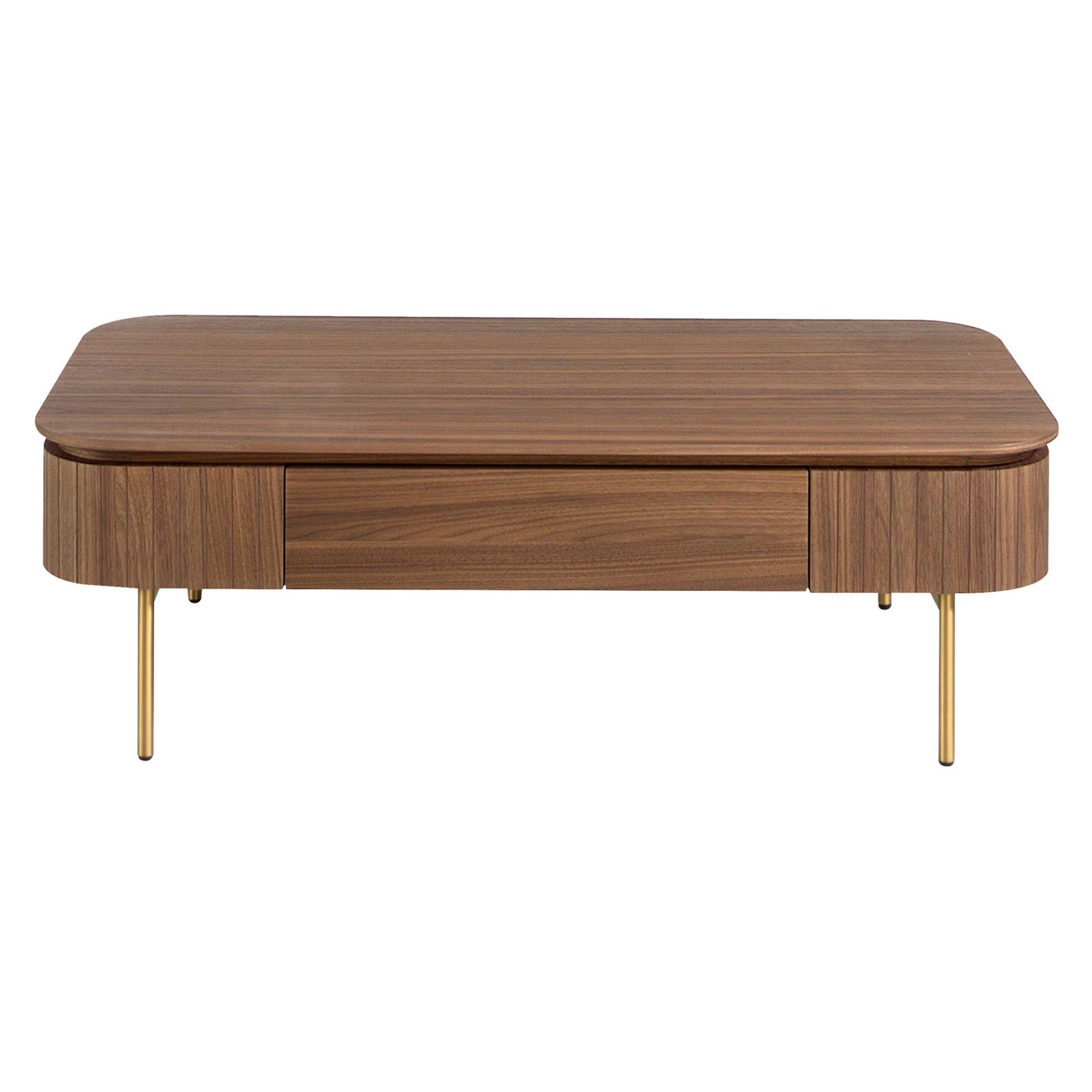 Прямоугольный журнальный столик из шпона ореха с одним выдвижным ящиком. Структура ножек из позолоченной нержавеющей стали.