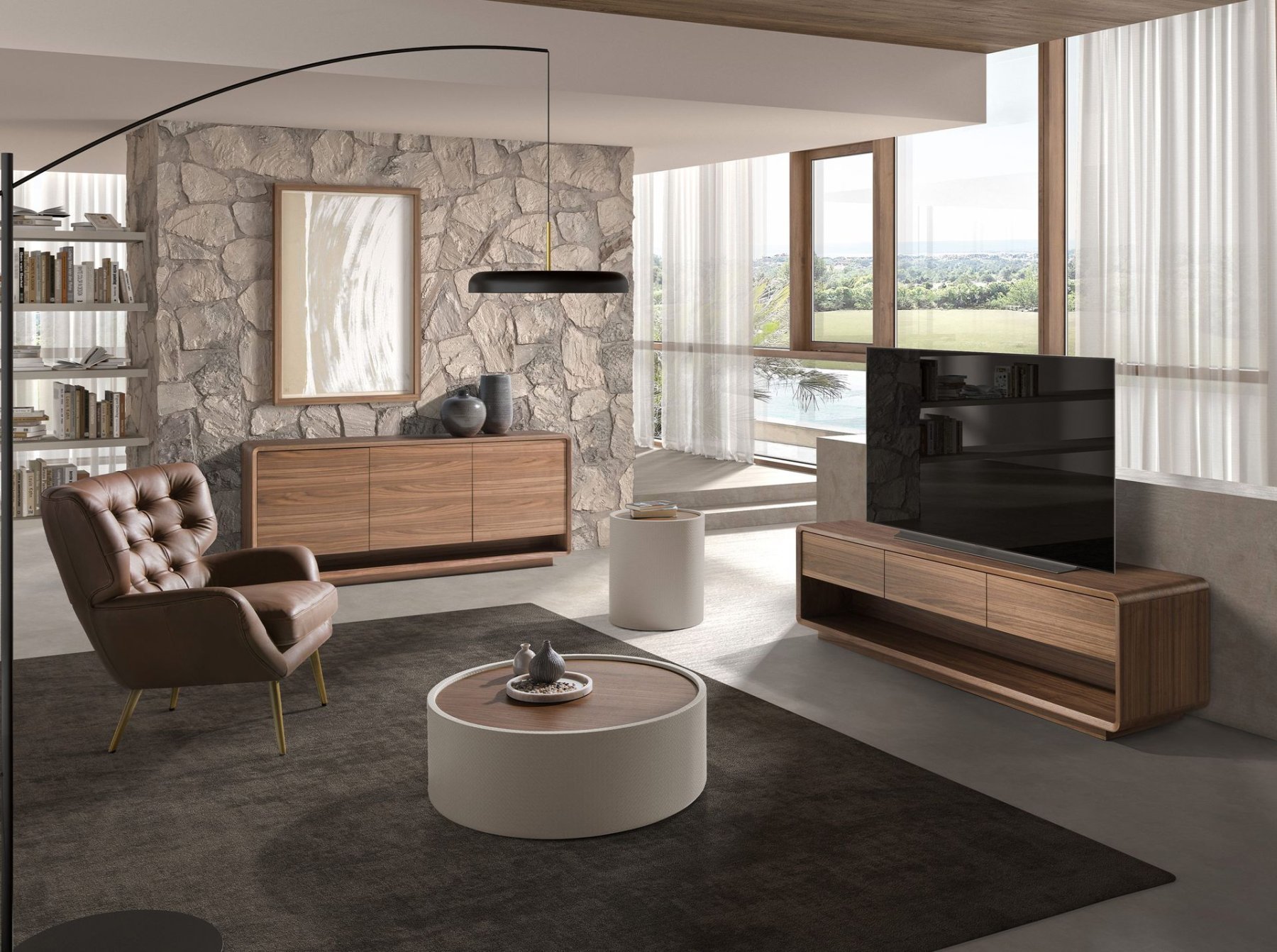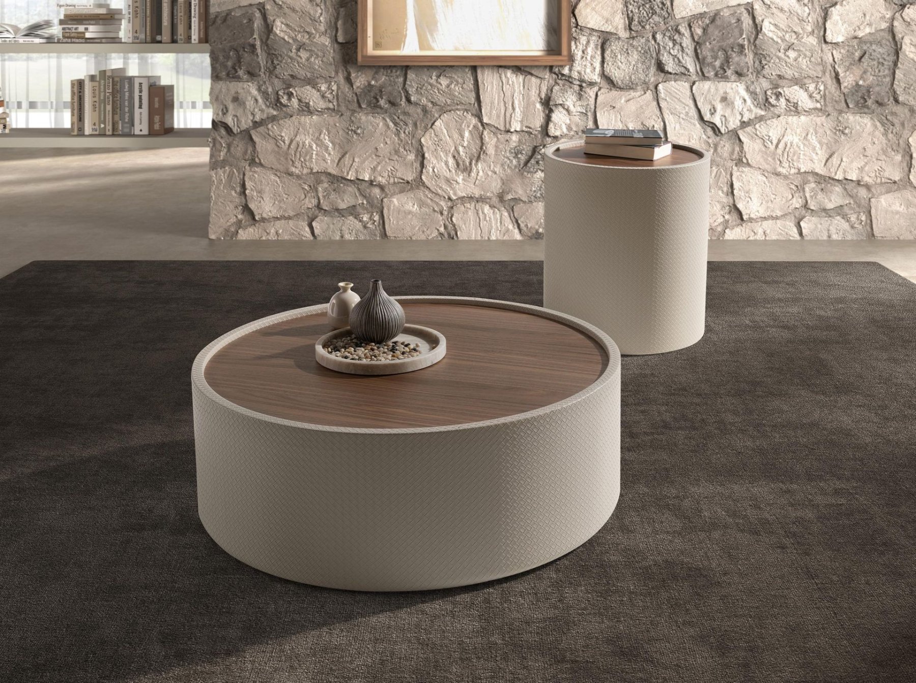 Современный круглый журнальный столик со столешницей из натурального орехового шпона и оригинальными деревянными ножками, обитыми искусственной кожей песочного цвета. Простой, но оригинальный дизайн, который добавит вашему интерьеру неповторимый и индивидуальный шарм.