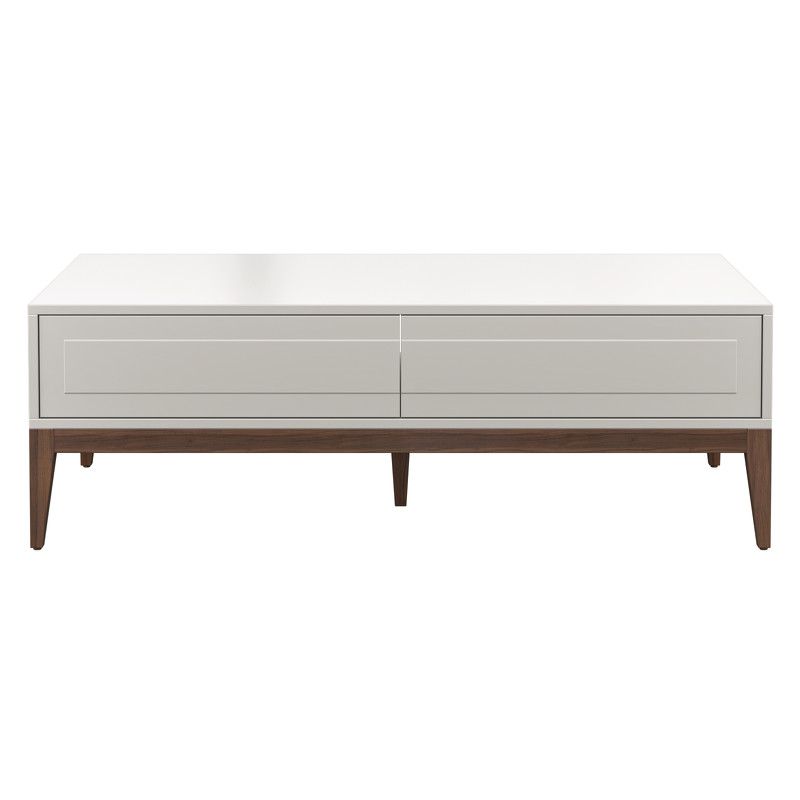Журнальный стол с двумя большими ящиками на высоких ножках из коллекции Marbella от бренда MOD Interiors. Дизайнерская фрезеровка фасадов в лаконичном стиле придает ему завершенный вид.