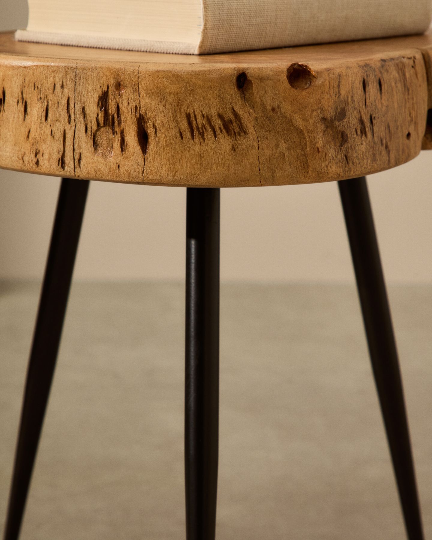 Столик Rousy CC0407M43 от фабрики La Forma – сруб акации на металлических ножках. Столик Rousy в полной мере продемонстрирует всю красоту и уникальность массива акации у вас дома. Минималистичный дизайн и поверхностная обработка древесины сделали свое дело – столик будет ярким элементов вашего интереьра. А стойкость к высоким весовым нагрузкам позволит использовать изделие и в качестве табурета. Столик круглый, состоит из трех ножек и столешницы. Столешница сделана из цельного массива акации, который покрыт лаком для защиты от влаги и загрязнений. Дерево прошло минимальную обработку, поэтому фактура отличается естественными неровностями, натуральной тональностью зерен и вершин, есть щели. Толщина столешницы составляет 6 см. Ножки сделаны из металла, который покрыт черной порошковой краской. Они имеют конусную форму с плавным сужением к низу – с 2 до 1 см. Для защиты напольного покрытия от повреждений, предусмотрены специальные наконечники. Максимально допустимая нагрузка на столик не должна превышать 80 кг. Размеры: ширина – 35 см, высота – 54 см. Вес – 8 кг. Потребуется минимальная сборка.