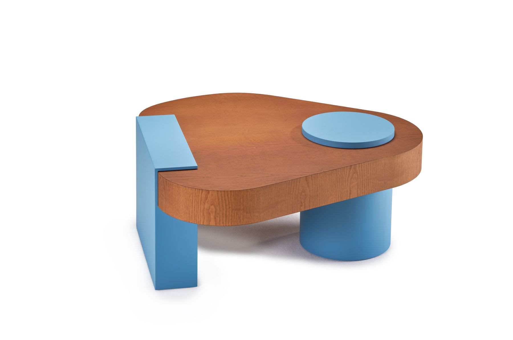 Bold - это стол смелых форм и размеров XL, разработанный студией Studiopepe. Столешница отличается увеличенным профилем и неправильными очертаниями, в то время как из нее выделяются три основные геометрические формы (прямоугольник, круг и треугольник), создавая динамичную визуальную игру, поскольку каждая из них проявляется на своем уровне. Эти элементарные формы на самом деле являются ножками, которые появляются на поверхности, через которую они проходят.