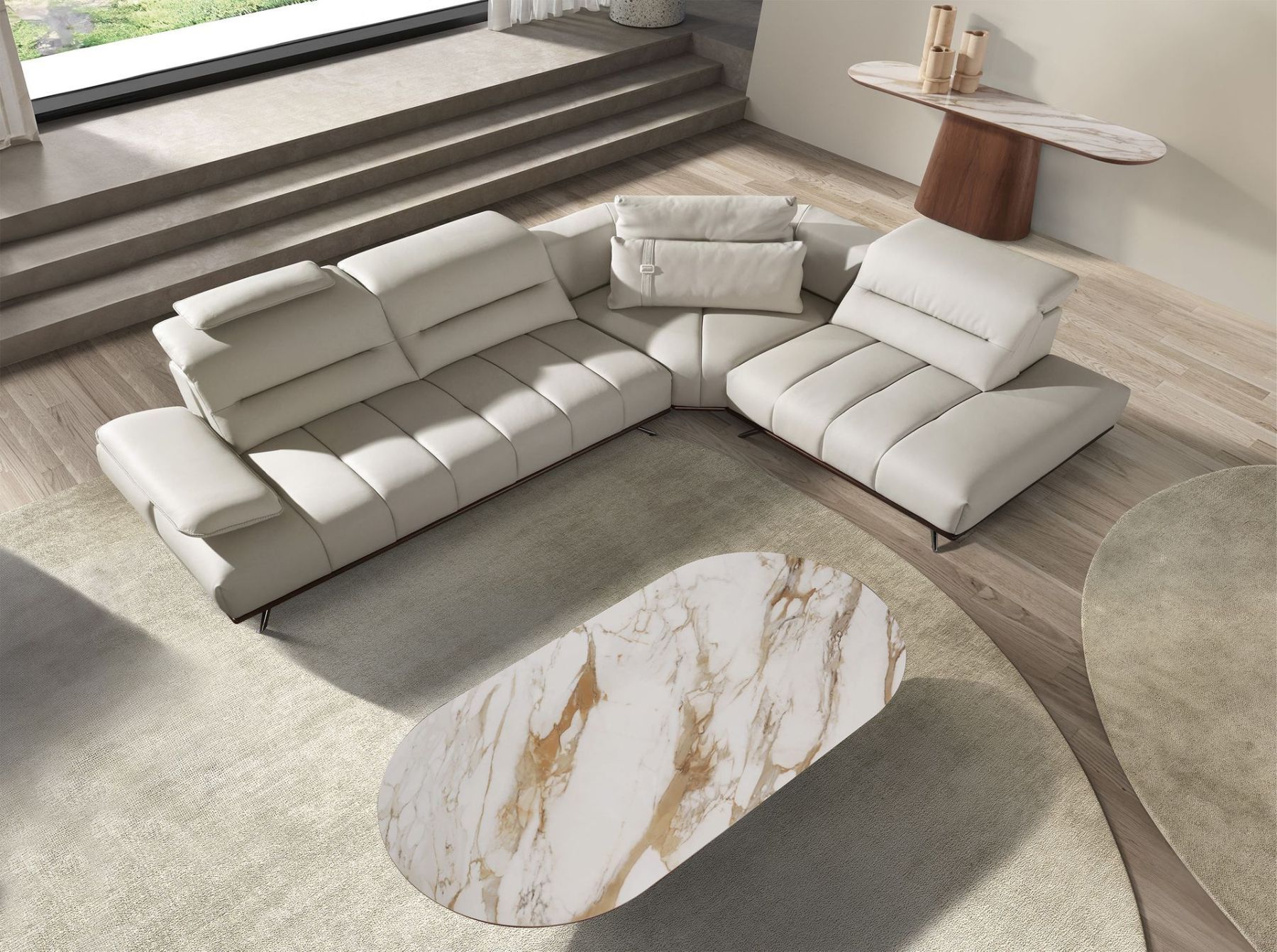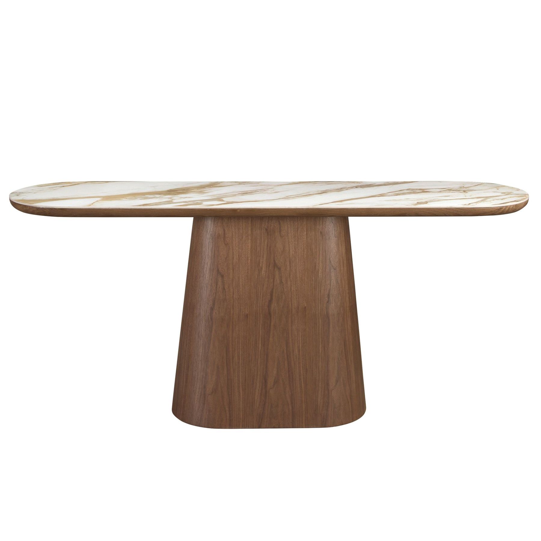 Современный овальный консольный столик со столешницей из белого фарфорового мрамора с прожилками земляного оттенка в глянцевой отделке и оригинальными деревянными ножками, покрытыми натуральным ореховым шпоном. Простой, но оригинальный дизайн добавит вашему интерьеру индивидуальности и неповторимости.