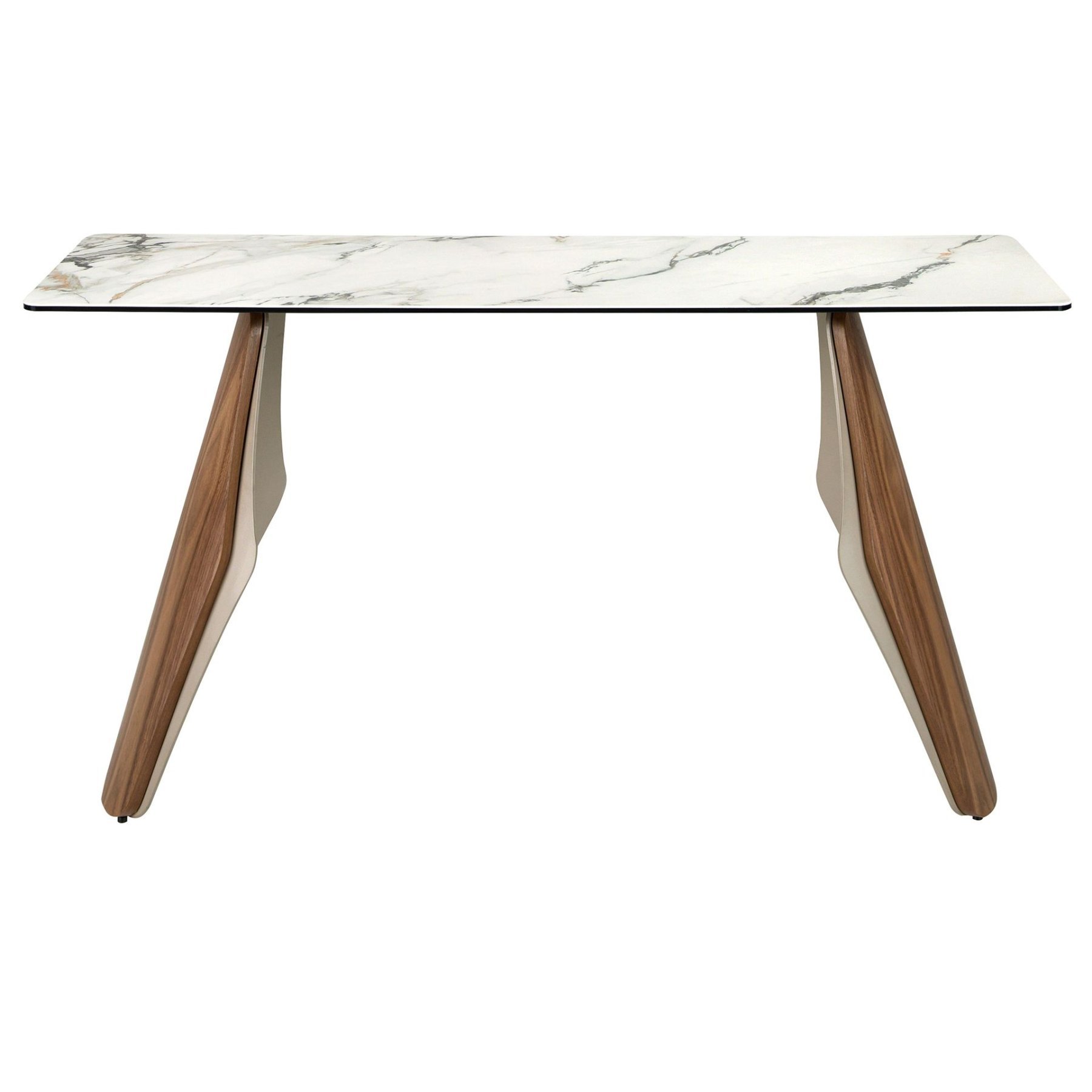 Прямоугольный современный консольный столик с белой столешницей из фарфорового мрамора с серыми и коричневыми прожилками на матовой поверхности. Оригинальные ножки из нержавеющей стали с металлическим эффектом песочного цвета и натурального орехового шпона толщиной 0,5 мм. Предмет мебели с простым, но оригинальным дизайном, который добавит вашему интерьеру неповторимый и индивидуальный шарм.