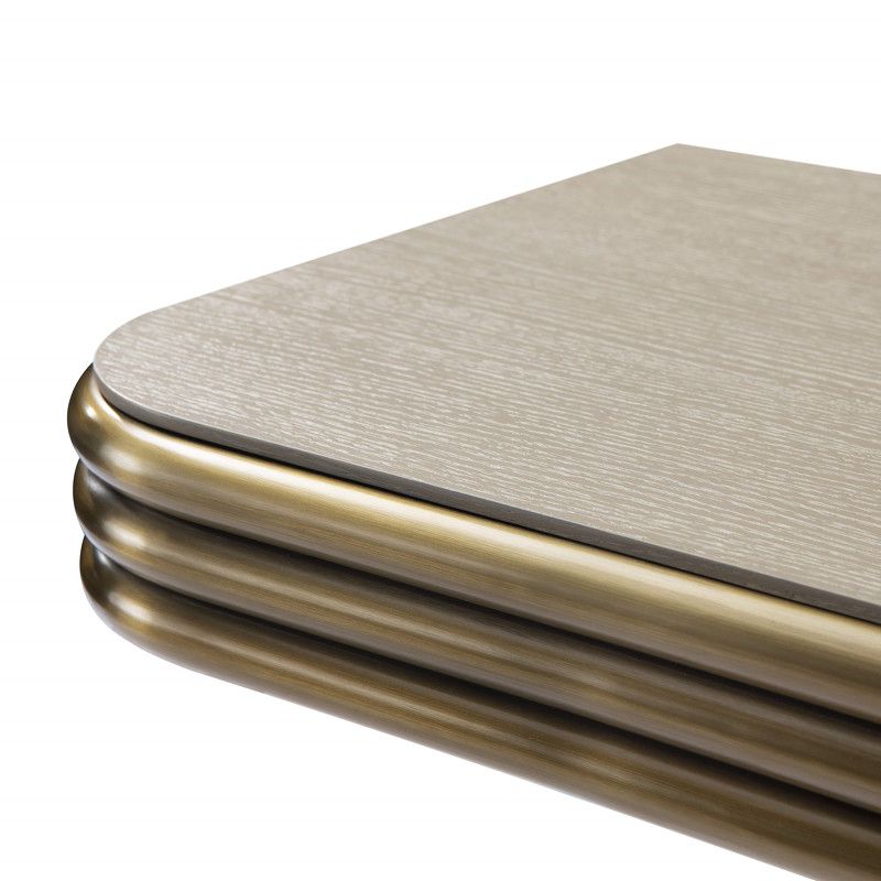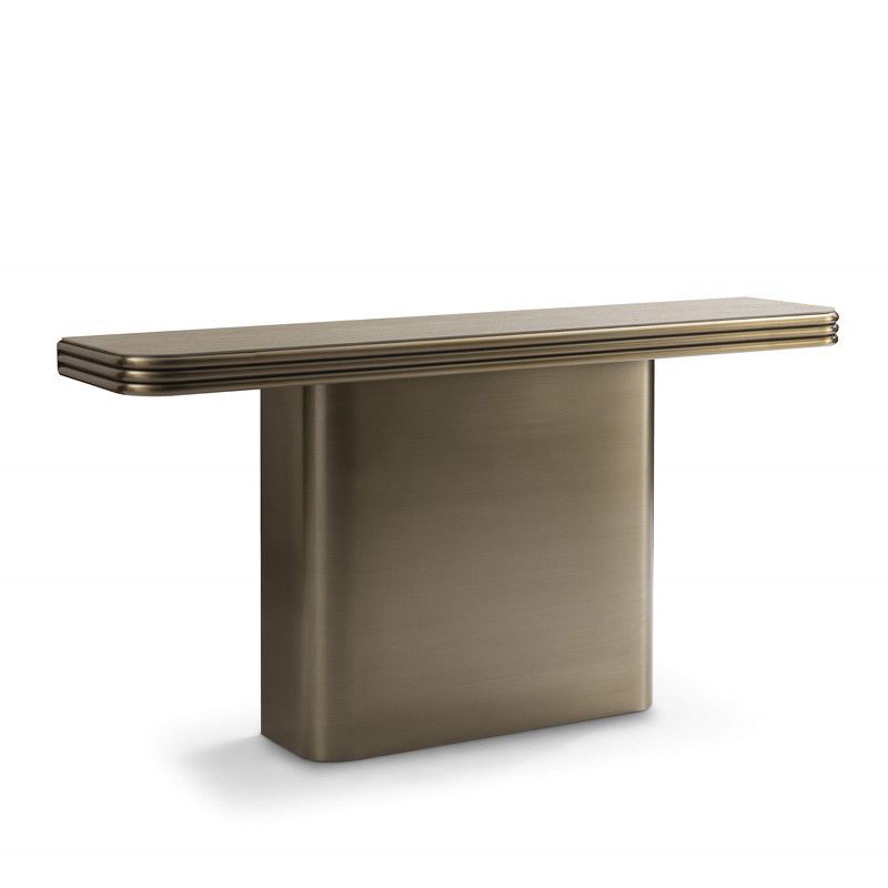 Консоль выполнена из высококачественного МДФ высокой плотности. Отделка всего корпуса из нержавеющей стали в цвете бронза. Столешница стеклянная с закругленными краями, что делает ее атравматичной.