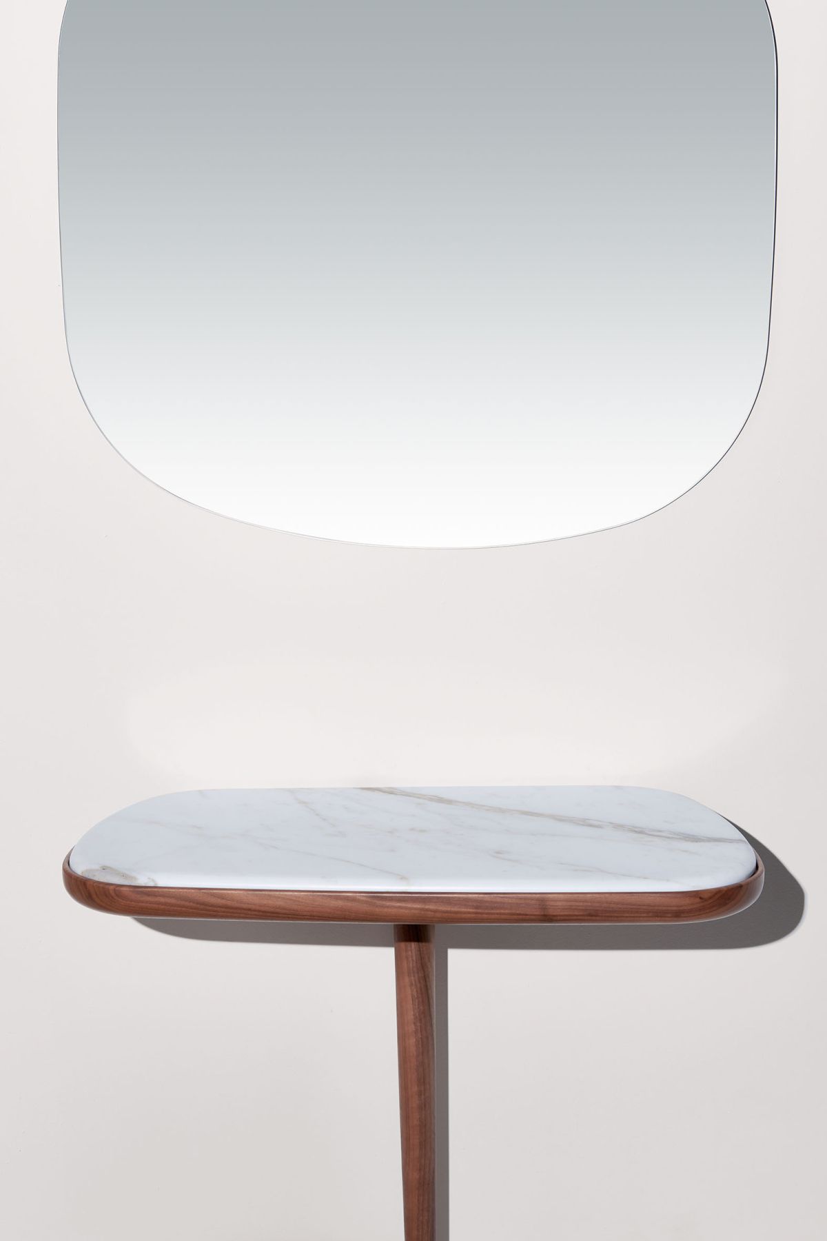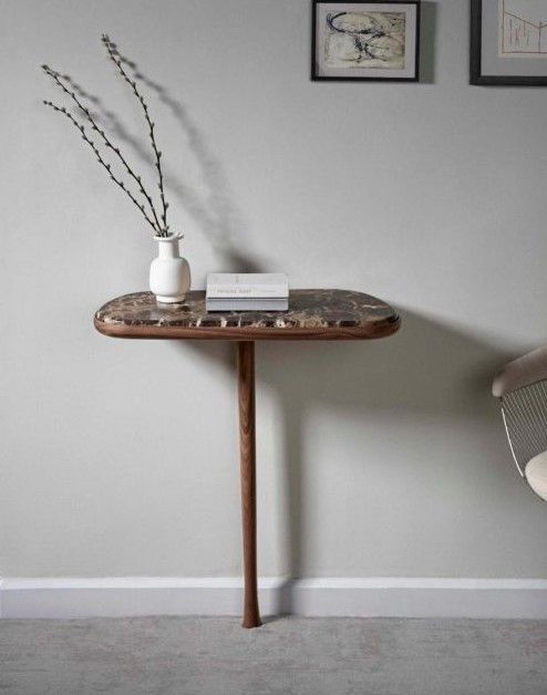 Его смелый дизайн характеризуется использованием одной ножки. Деталь скрывает невидимый анкер в стене, создавая забавную игру, которая на первый взгляд бросает вызов физике.
