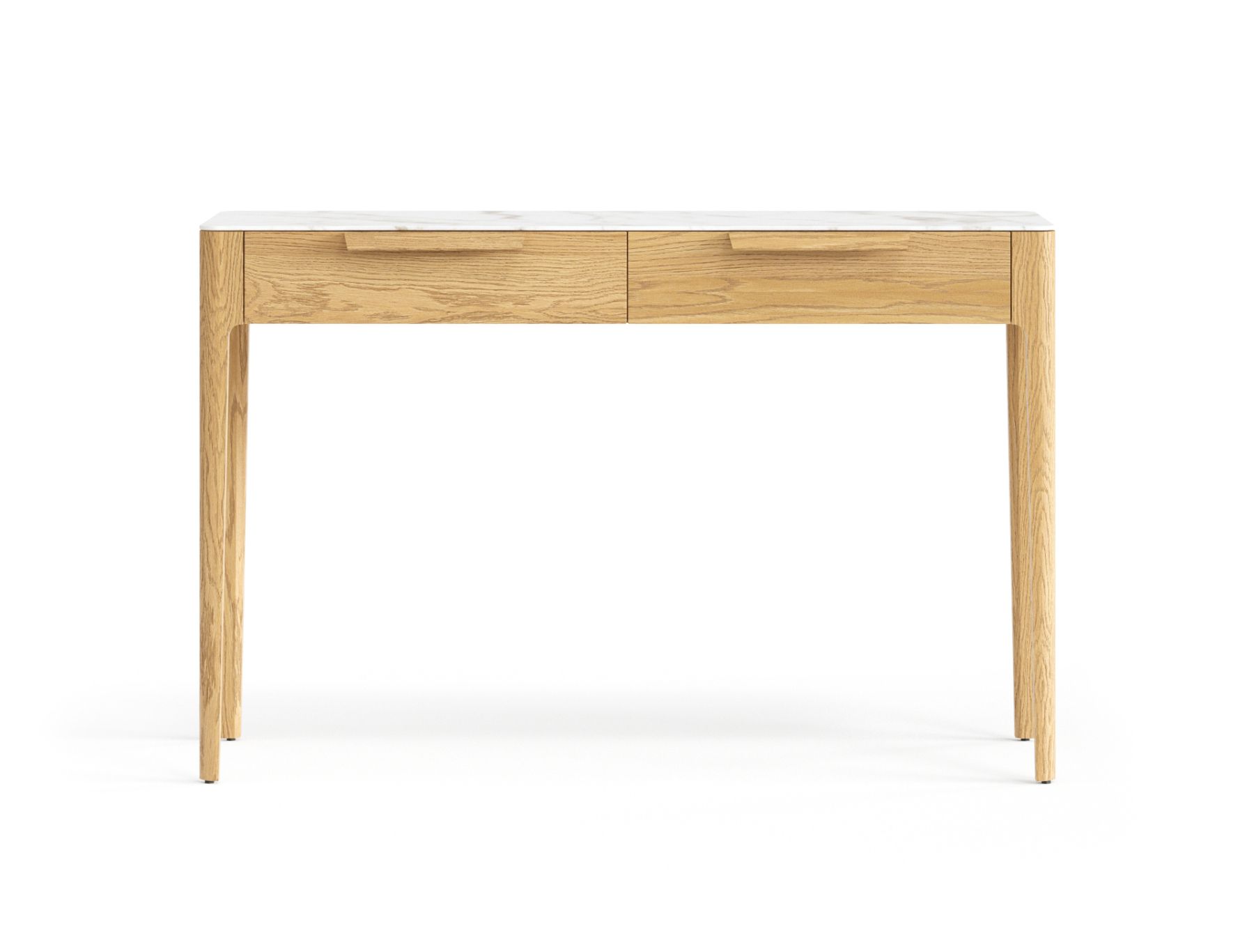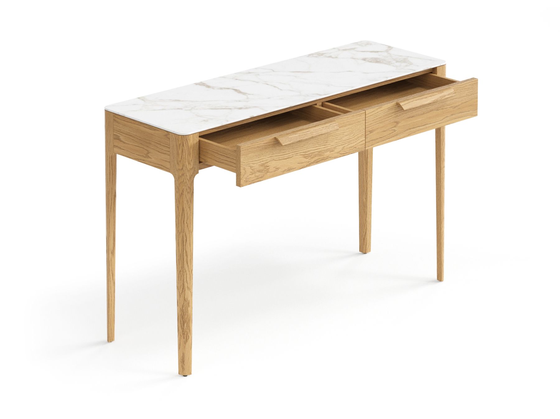 Консоль с двумя выдвижными ящиками на высоких элегантных опорах идеально впишется в любое помещение вашего дома и сделает его особенным. Изысканно сглаженные формы подчёркивают теплоту дерева, наполняют пространство природной гармонией.
