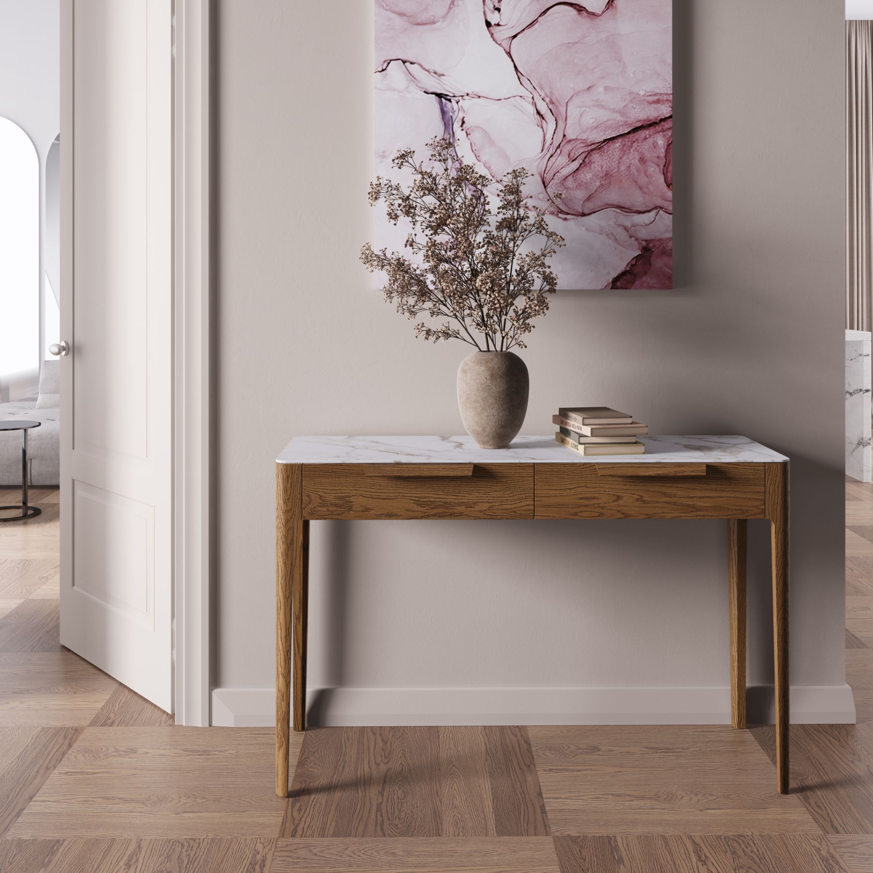 Столешница выполнена из керамогранита, крепкая поверхность приятна на вид и на ощупь. Ваза с букетом свежих цветов, любимые сборники литературы и тёплый торшер на консоли создадут истинный уют.