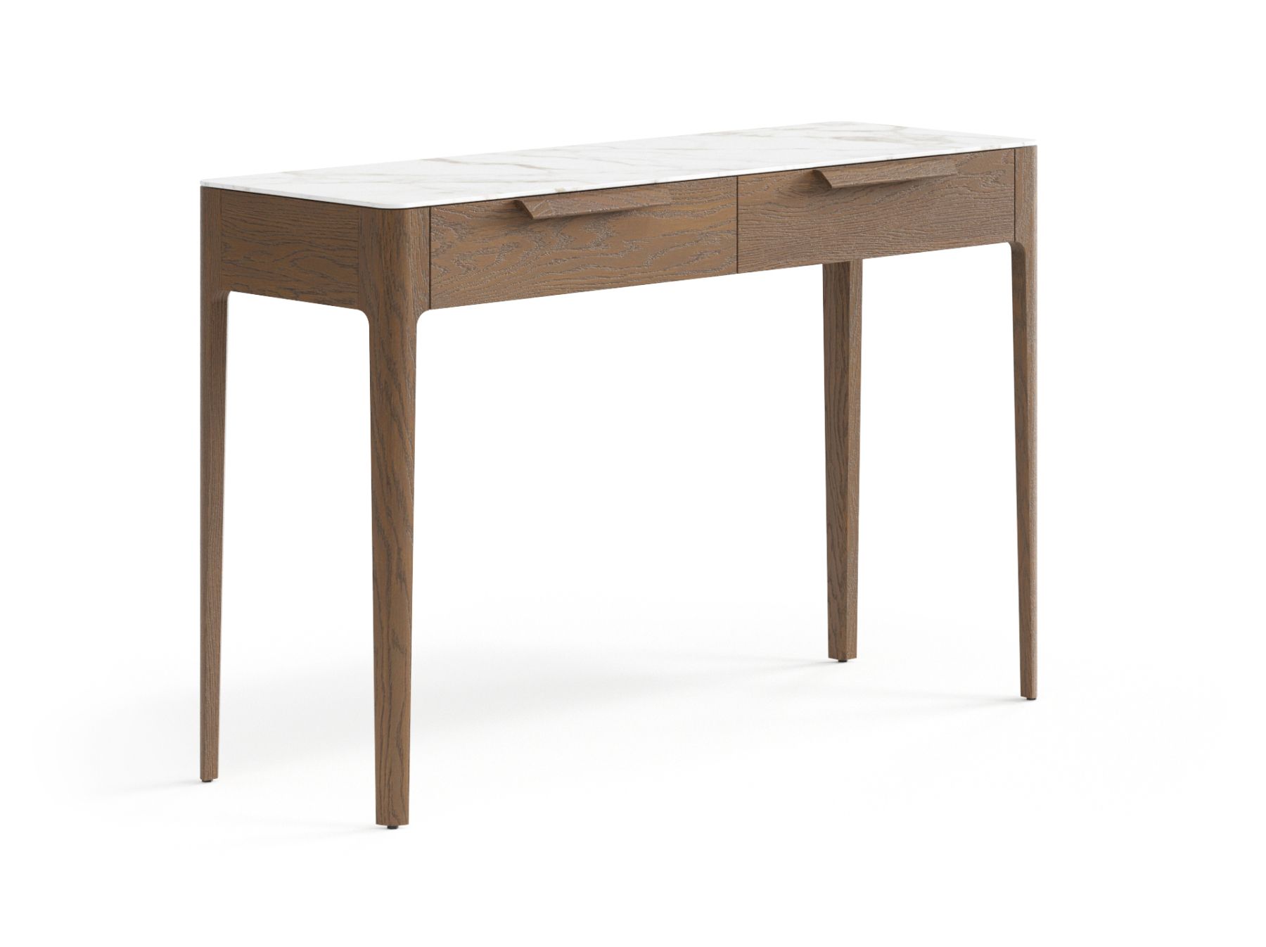 Консоль с двумя выдвижными ящиками на высоких элегантных опорах идеально впишется в любое помещение вашего дома и сделает его особенным. Изысканно сглаженные формы подчёркивают теплоту дерева, наполняют пространство природной гармонией.