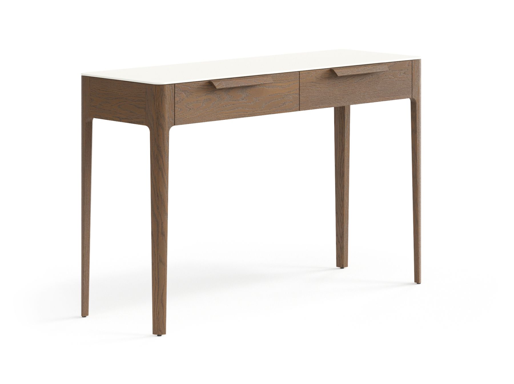 Консоль с двумя выдвижными ящиками на высоких элегантных опорах идеально впишется в любое помещение вашего дома и сделает его особенным. Изысканно сглаженные формы подчёркивают теплоту дерева, наполняют пространство природной гармонией.