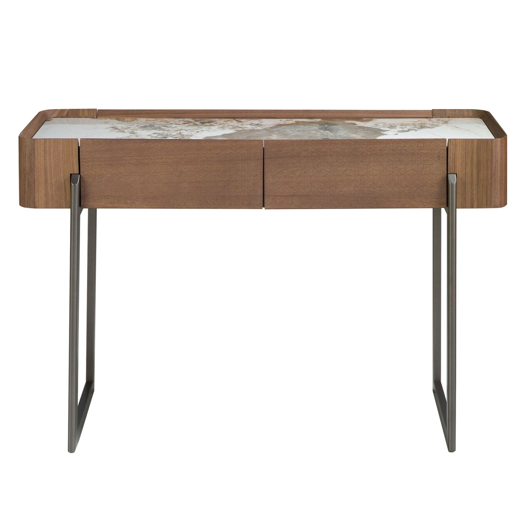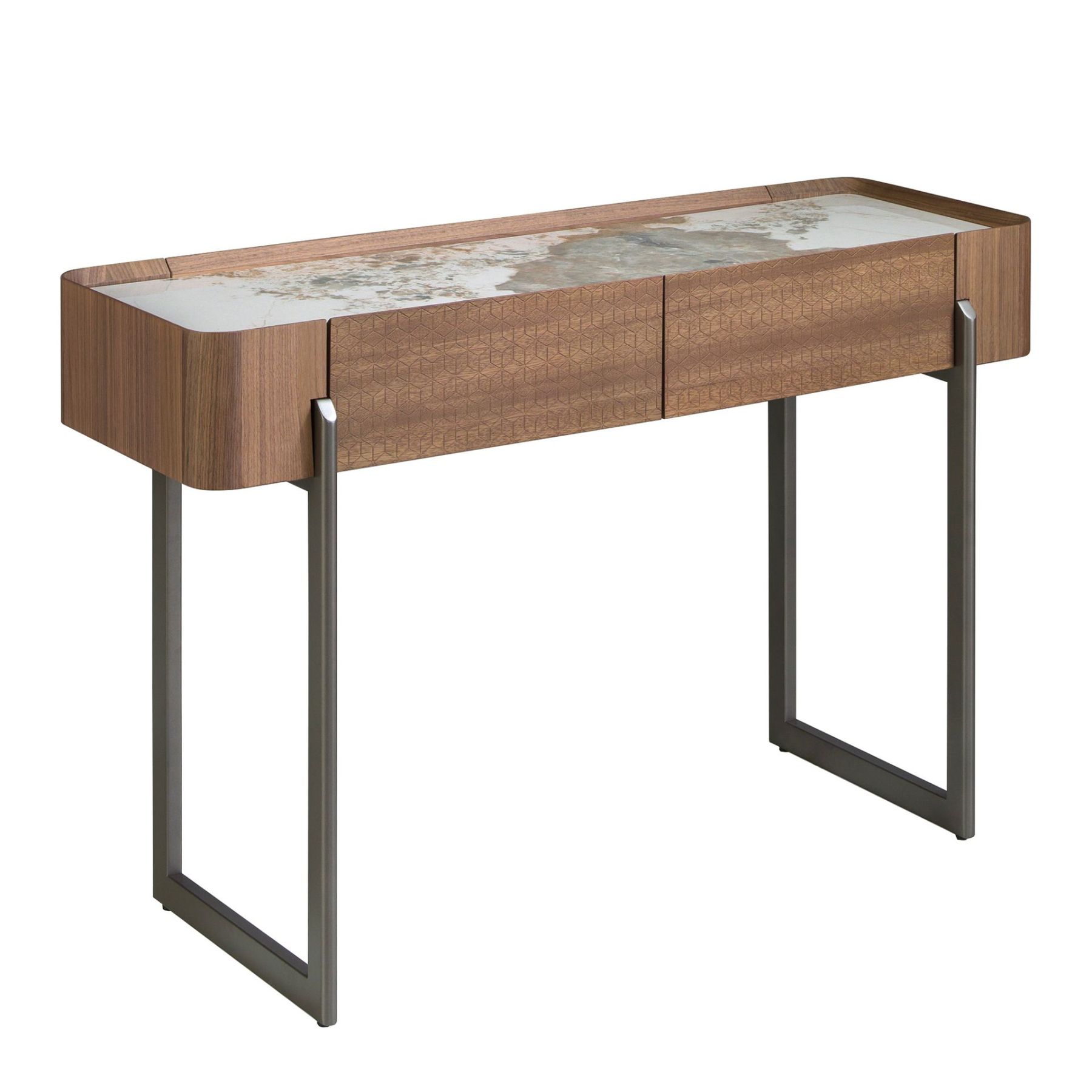 Прямоугольный консольный столик современного дизайна из натурального шпона ореха и элегантной столешницей из белого фарфорового мрамора с прожилками землистого тона с глянцевой отделкой. Его конструкция из темных металлических ножек из нержавеющей стали придает современный и авангардный вид, который вы ищете в своем доме. Он имеет достаточно места для хранения вещей с 2 ящиками с системой плавного закрывания.