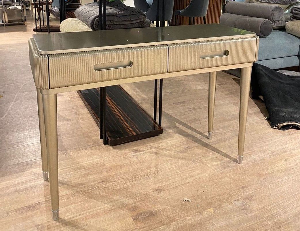 Дизайнерская консоль от итальянского бренда Fratelli Barri. Закругленная форма и рифленые фасады выглядят очень актуально. Ножки прямые круглые, зауженные к низу. На ножках металлические колпачки. У консоли 2 ящика. Ручка - выемка на фасаде.