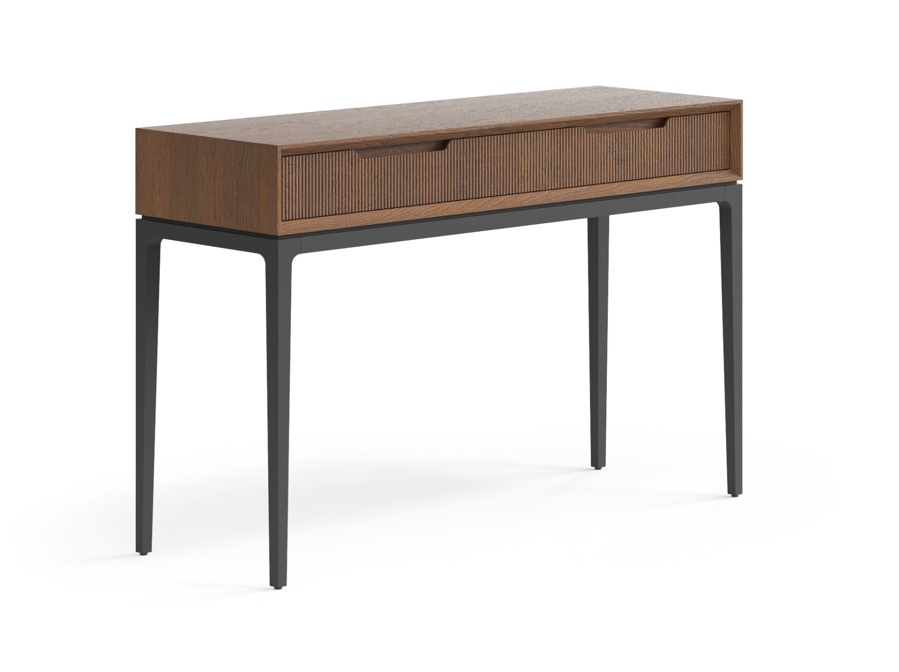 Рифлёная поверхность фасада подчёркивает изысканный вид изделия и приятна на ощупь. А скрытые направляющие ящиков с доводчиками и фрезерованные ручки делают пользование консолью мягким, уверенным и максимально комфортным. Ваза с букетом свежих цветов, любимые сборники литературы и тёплый торшер на консоли создадут истинный уют.