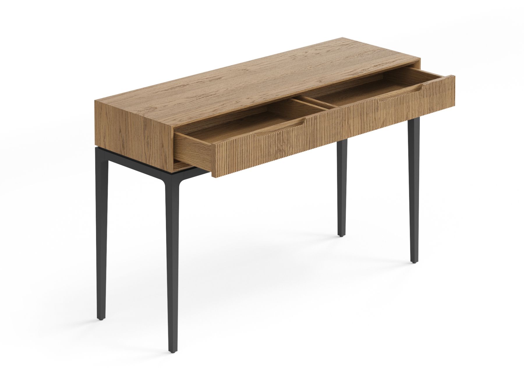 Рифлёная поверхность фасада подчёркивает изысканный вид изделия и приятна на ощупь. А скрытые направляющие ящиков с доводчиками и фрезерованные ручки делают пользование консолью мягким, уверенным и максимально комфортным. Ваза с букетом свежих цветов, любимые сборники литературы и тёплый торшер на консоли создадут истинный уют.