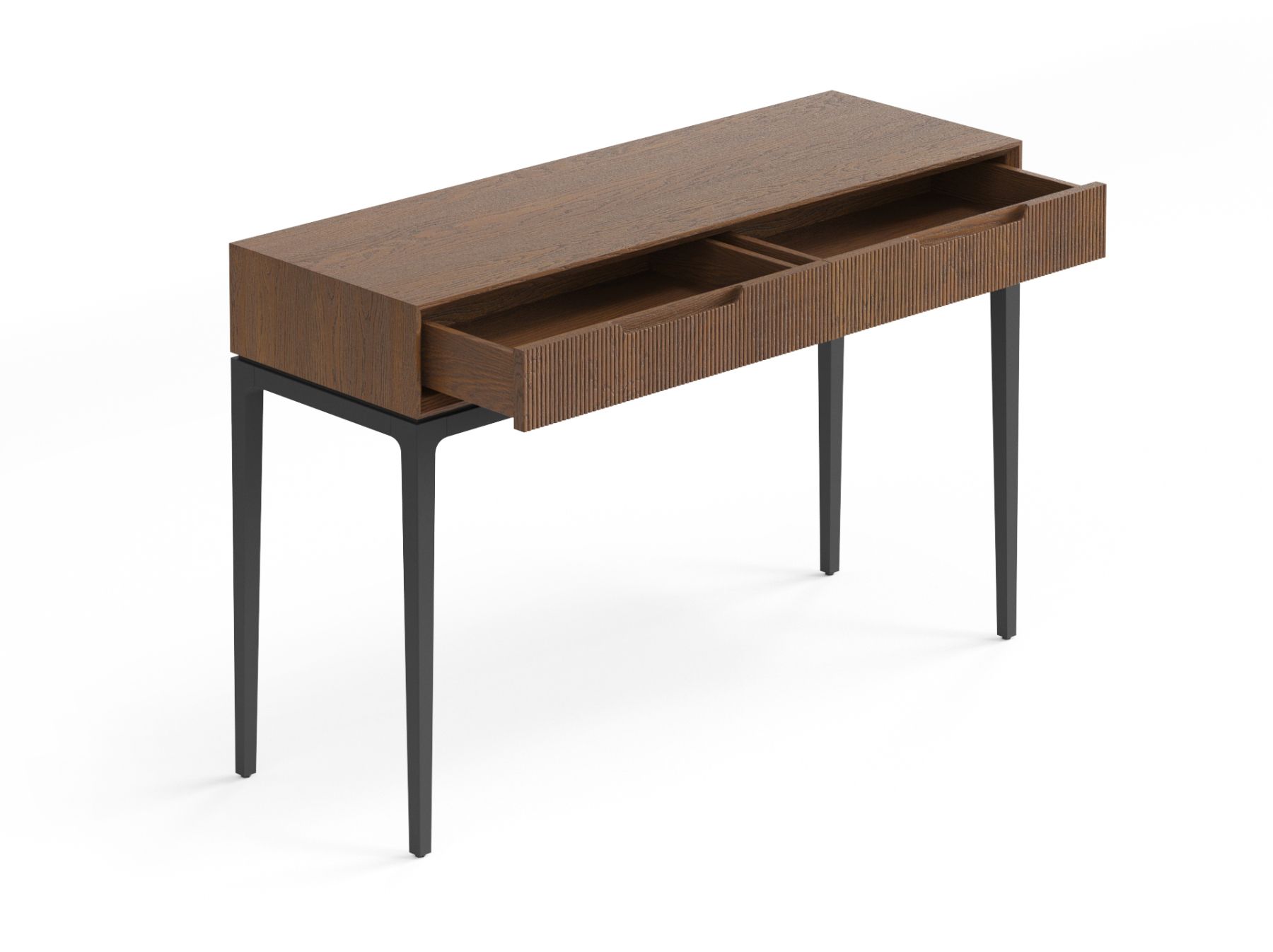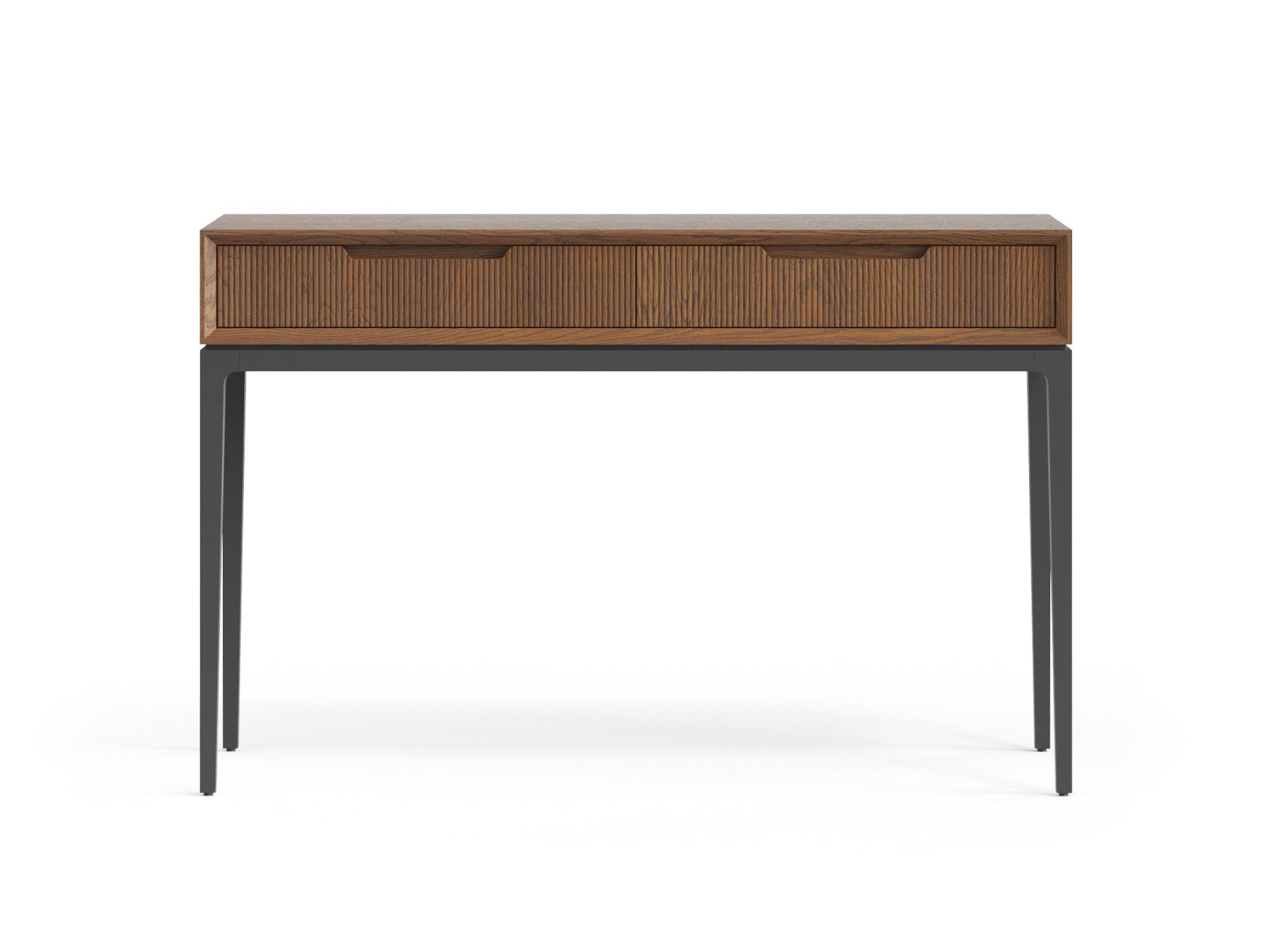 Рифлёная поверхность фасада подчёркивает изысканный вид изделия и приятна на ощупь. А скрытые направляющие ящиков с доводчиками и фрезерованные ручки делают пользование консолью мягким, уверенным и максимально комфортным. Ваза с букетом свежих цветов, любимые сборники литературы и тёплый торшер на консоли создадут истинный уют.