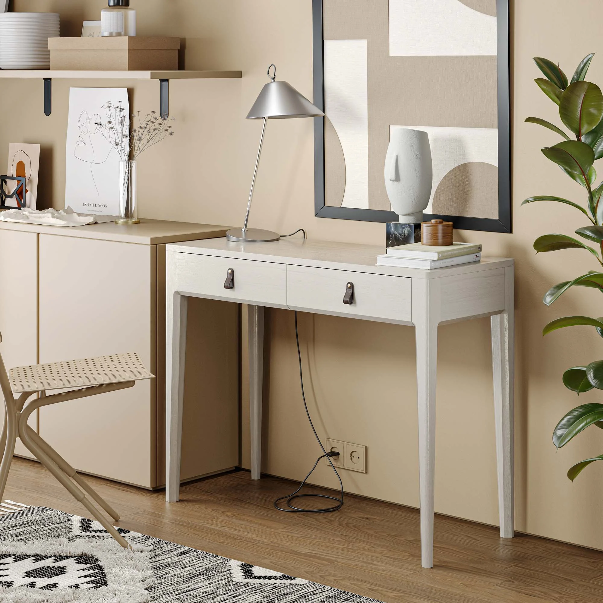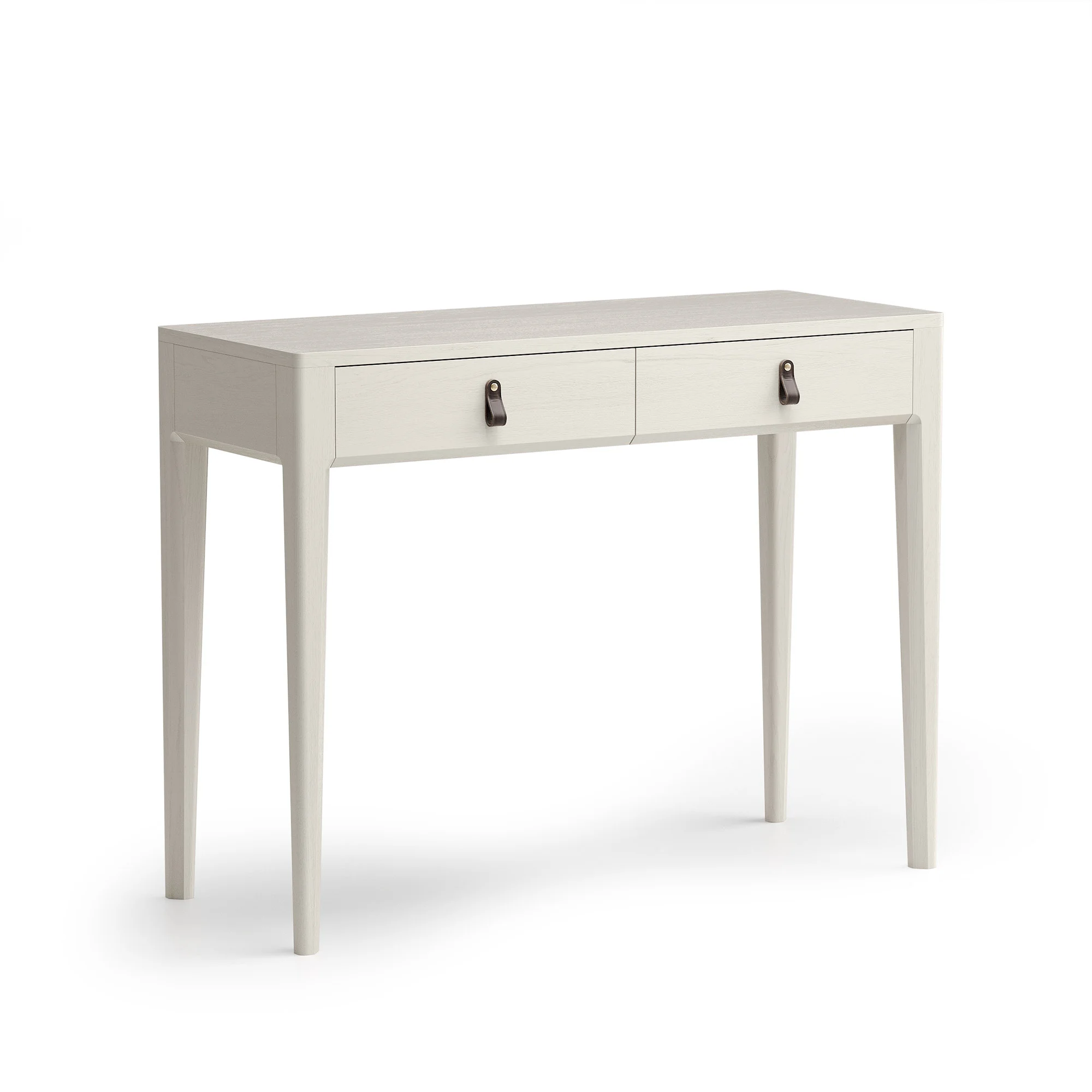 Этот стол уверенно выполнит функцию косметического столика. Компактные габариты позволяют использовать его в узком холле или небольшой комнате, а утонченный образ модели поддерживается оригинальной фрезеровкой ножек и ручками из натуральной кожи, выполненными вручную мастерами The IDEA.