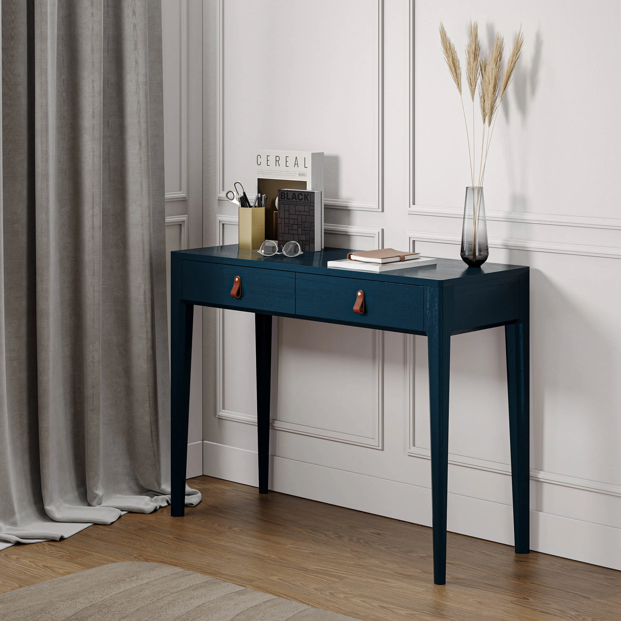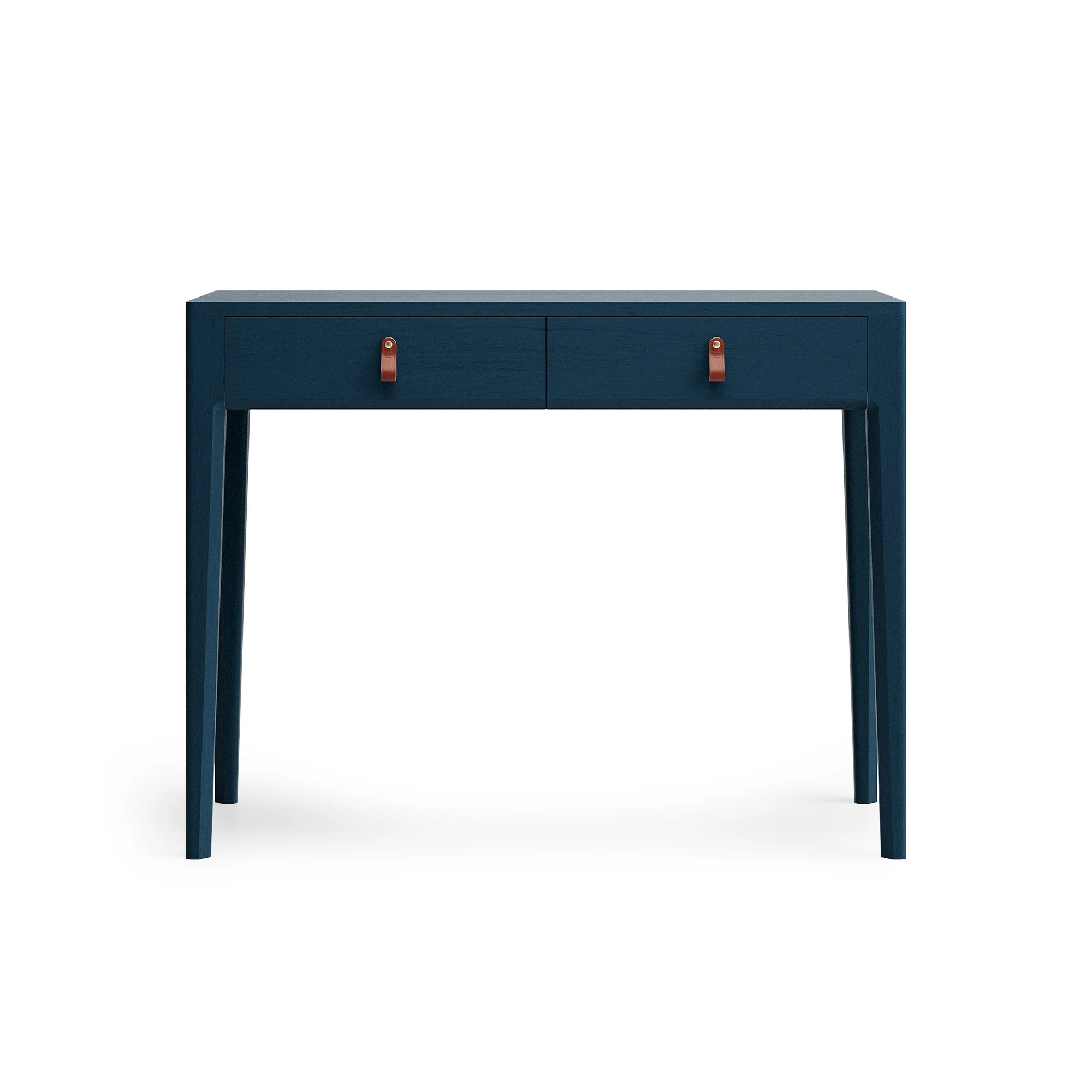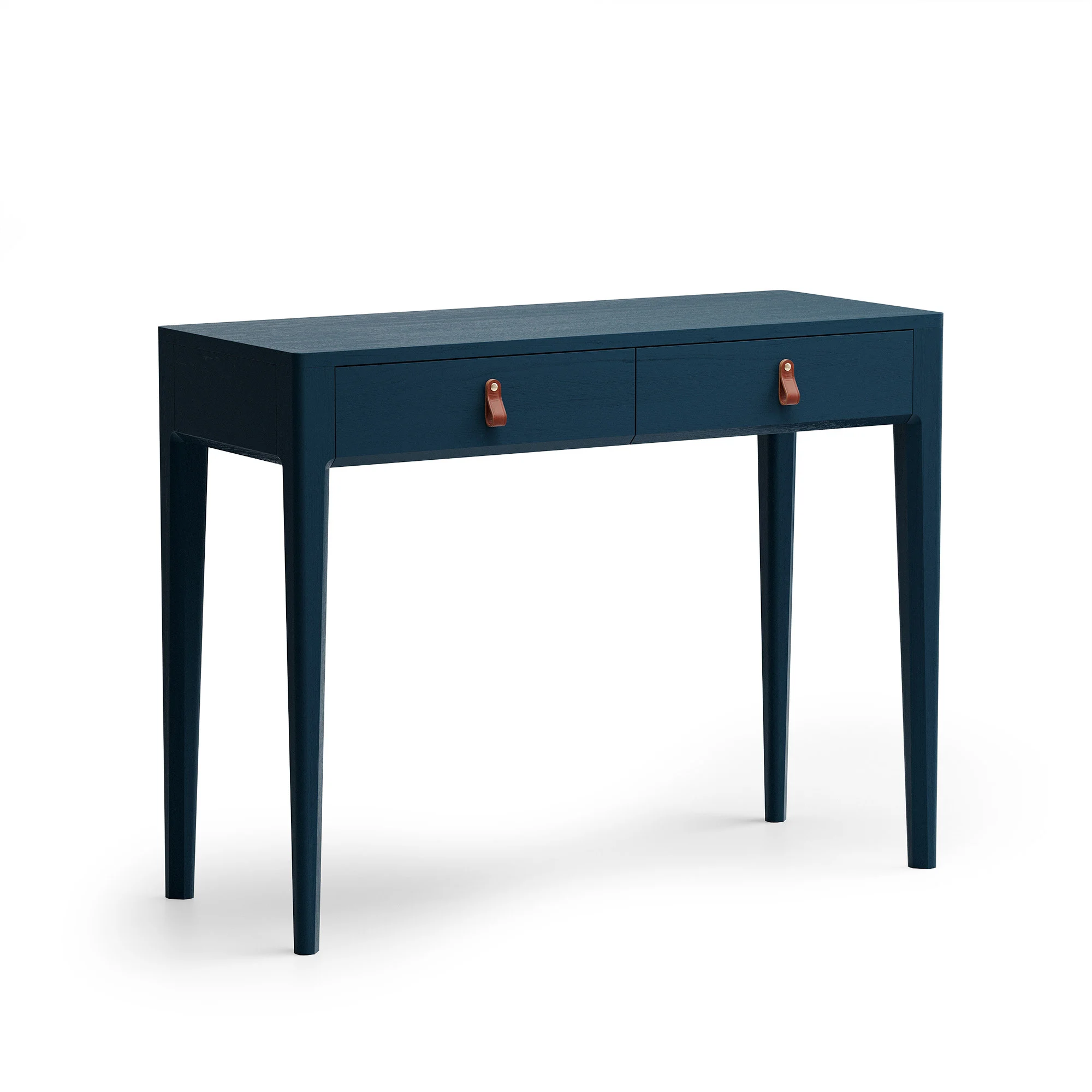Этот универсальный консольный стол уверенно выполнит функцию косметического столика. Компактные габариты позволяют использовать его в узком холле или небольшой комнате, а утонченный образ модели поддерживается оригинальной фрезеровкой ножек и ручками из натуральной кожи, выполненными вручную мастерами The IDEA.