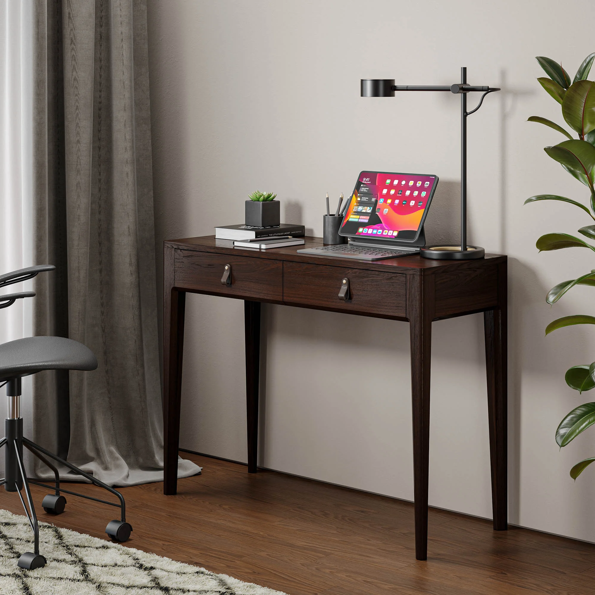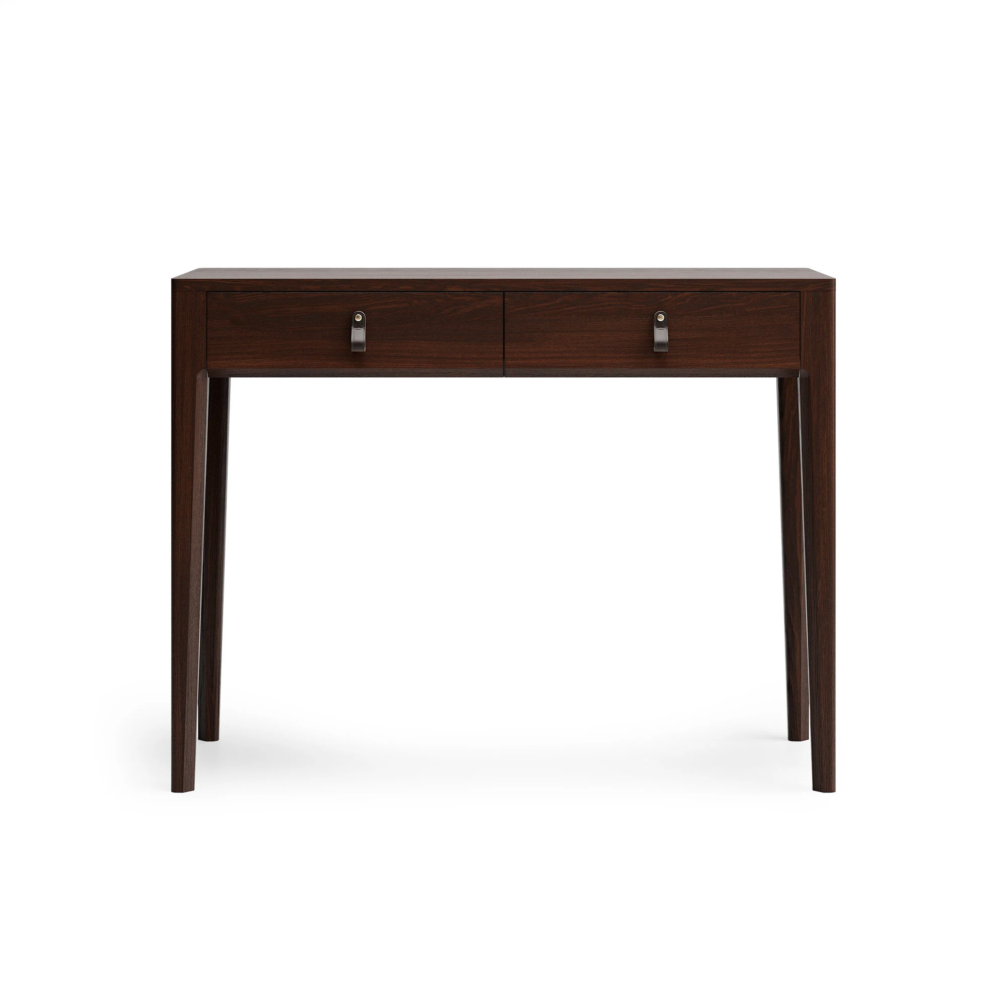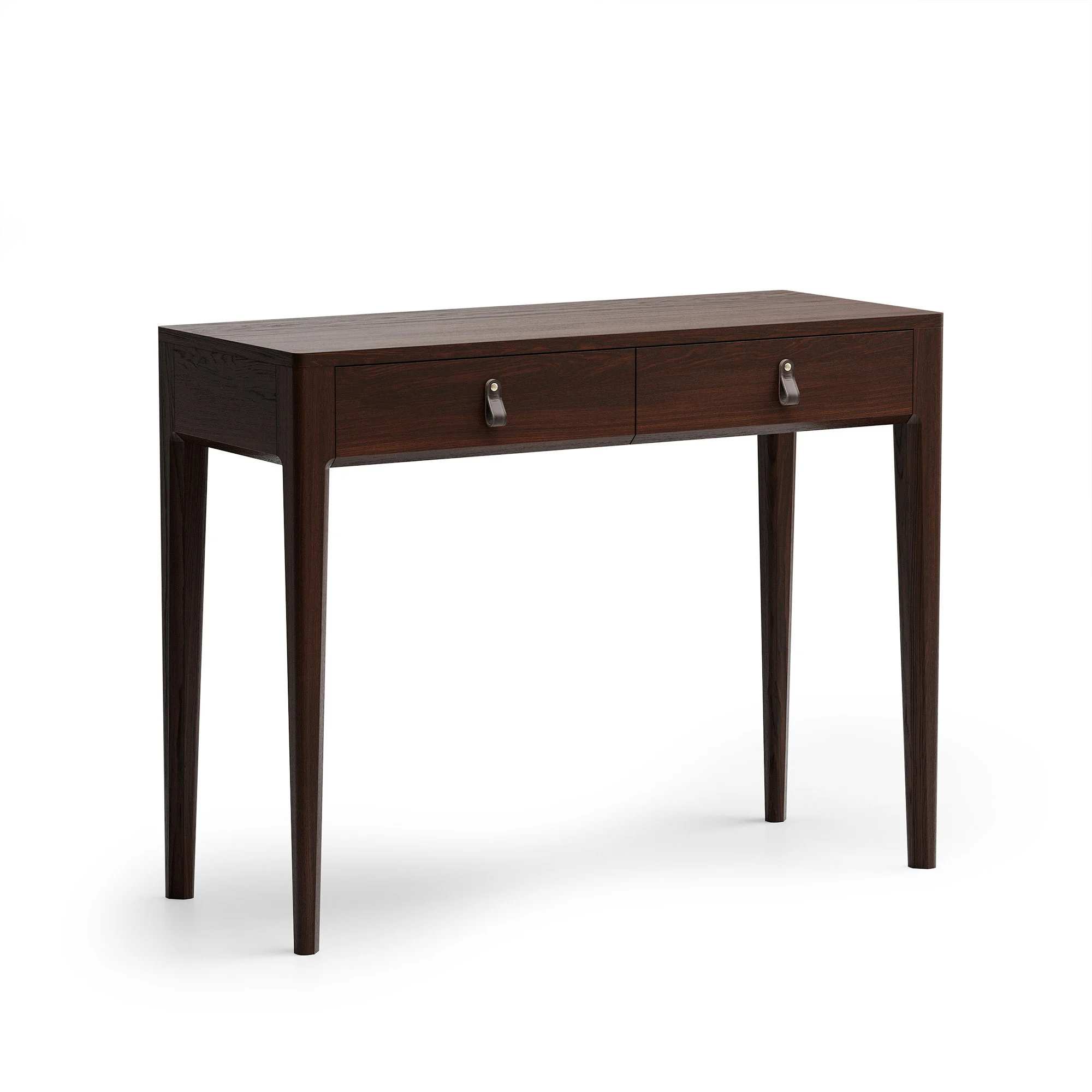 Этот уверенно выполнит функцию косметического столика. Компактные габариты позволяют использовать стол в узком холле или небольшой комнате, а утонченный образ модели поддержан оригинальной фрезеровкой ножек и ручками из натуральной кожи, выполненными вручную мастерами TheIDEA.