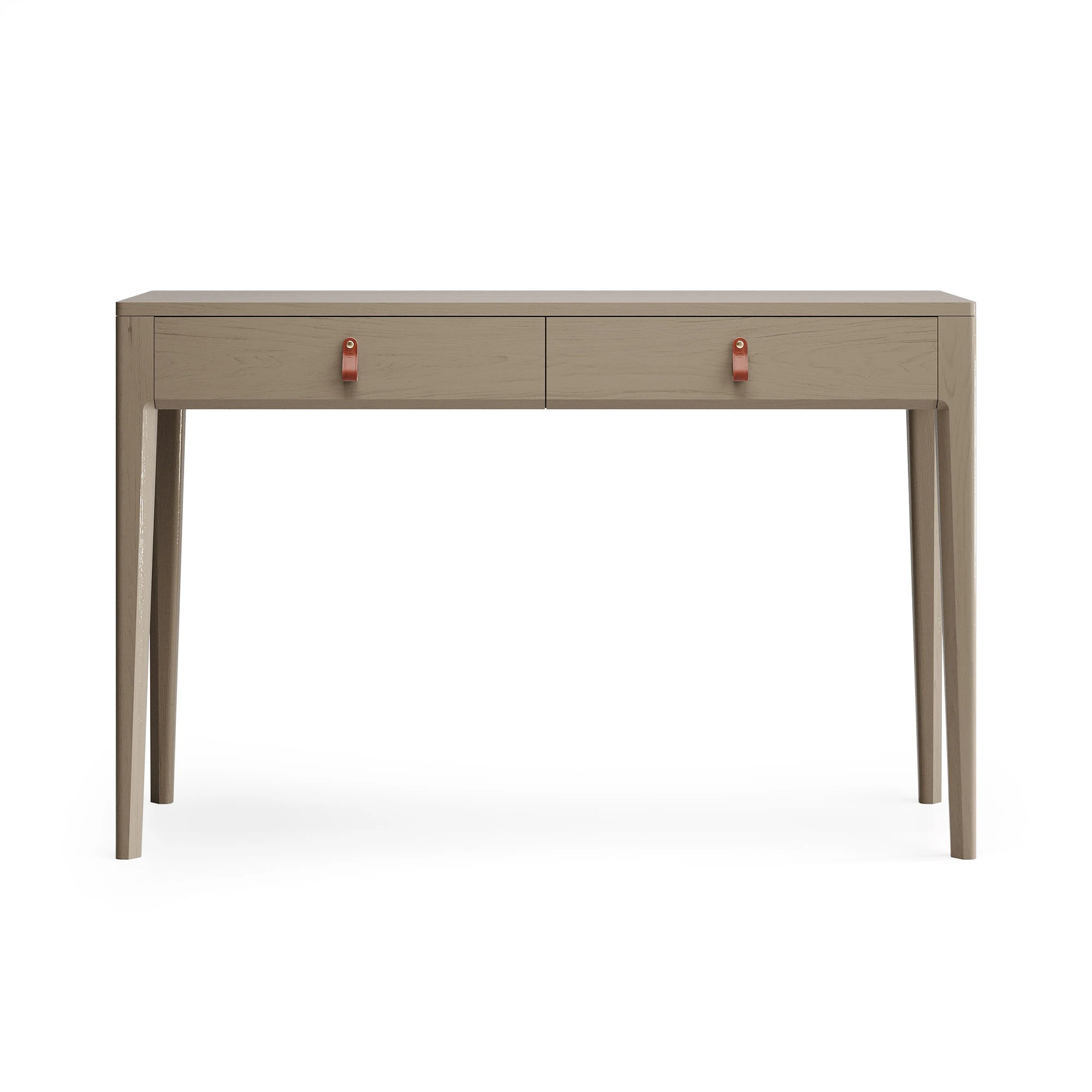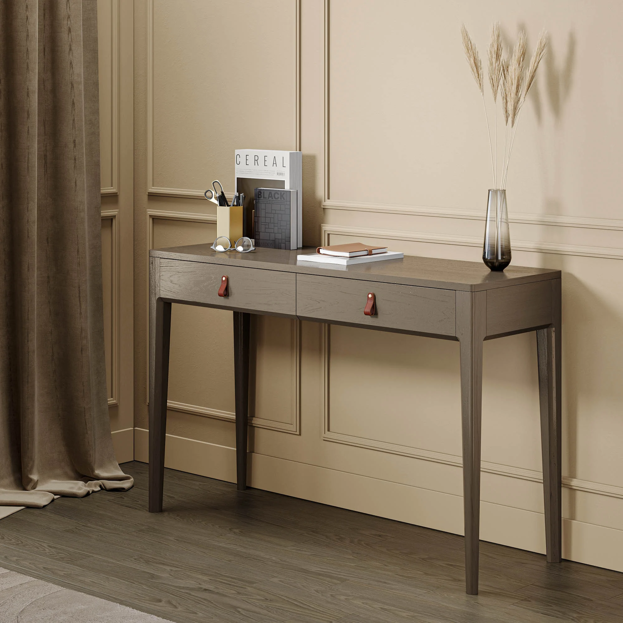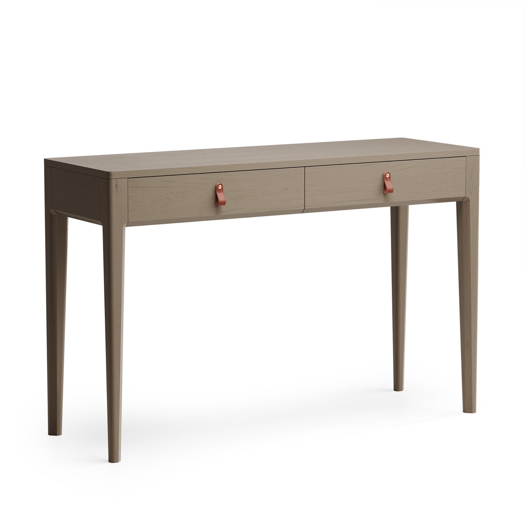 Компактные габариты позволяют использовать стол в узком холле или небольшой комнате, а утонченный образ модели поддержан оригинальной фрезеровкой ножек и ручками из натуральной кожи, выполненными вручную мастерами The IDEA.
