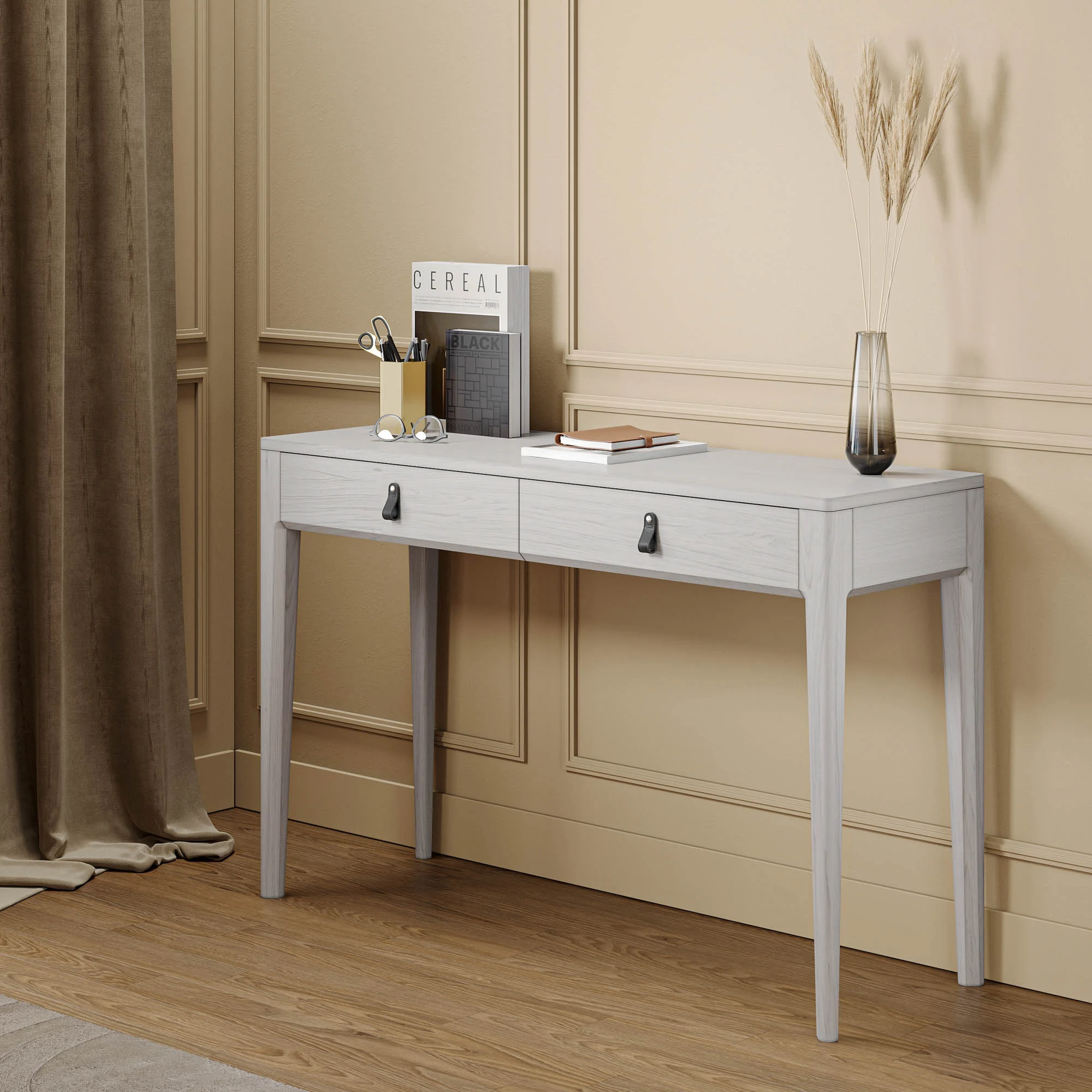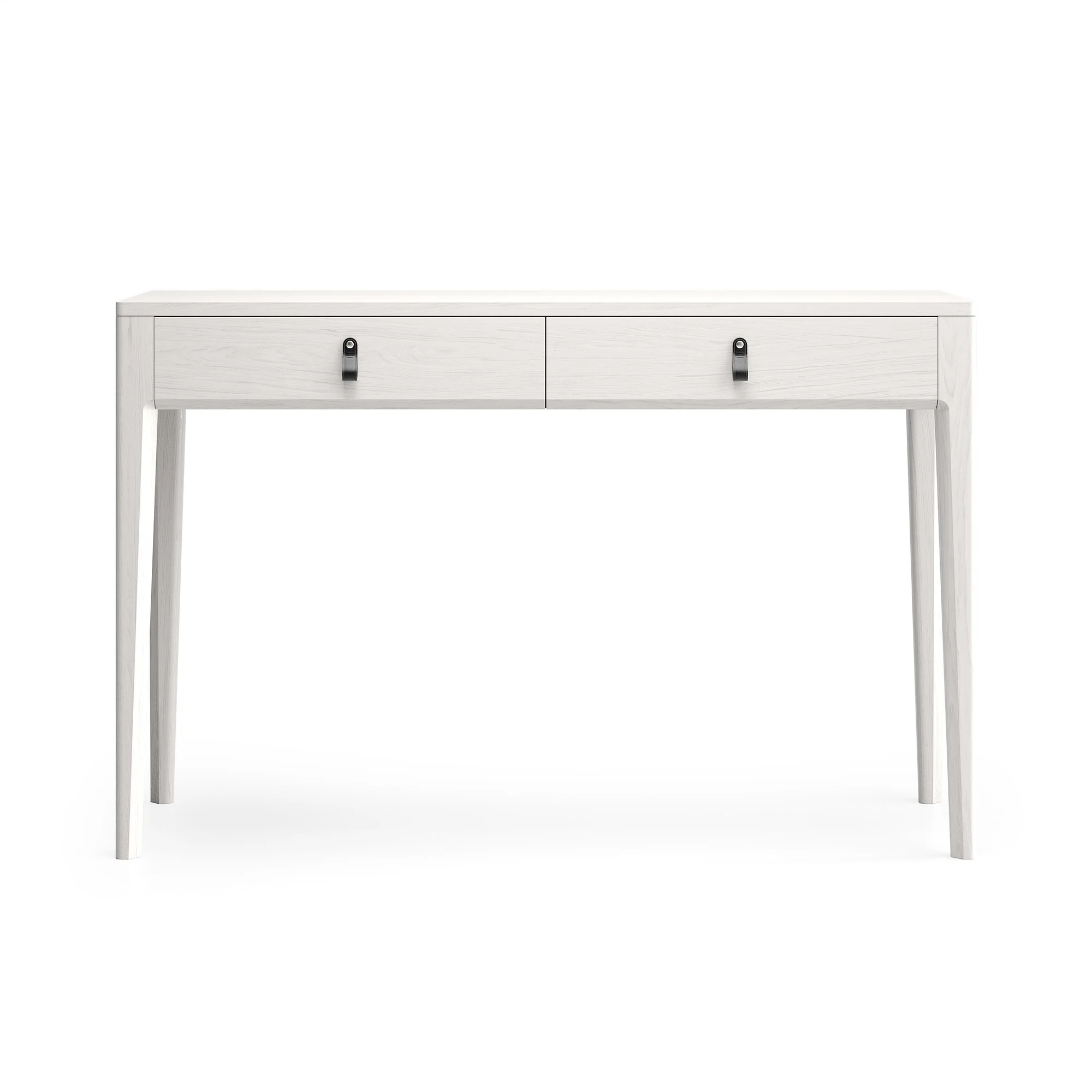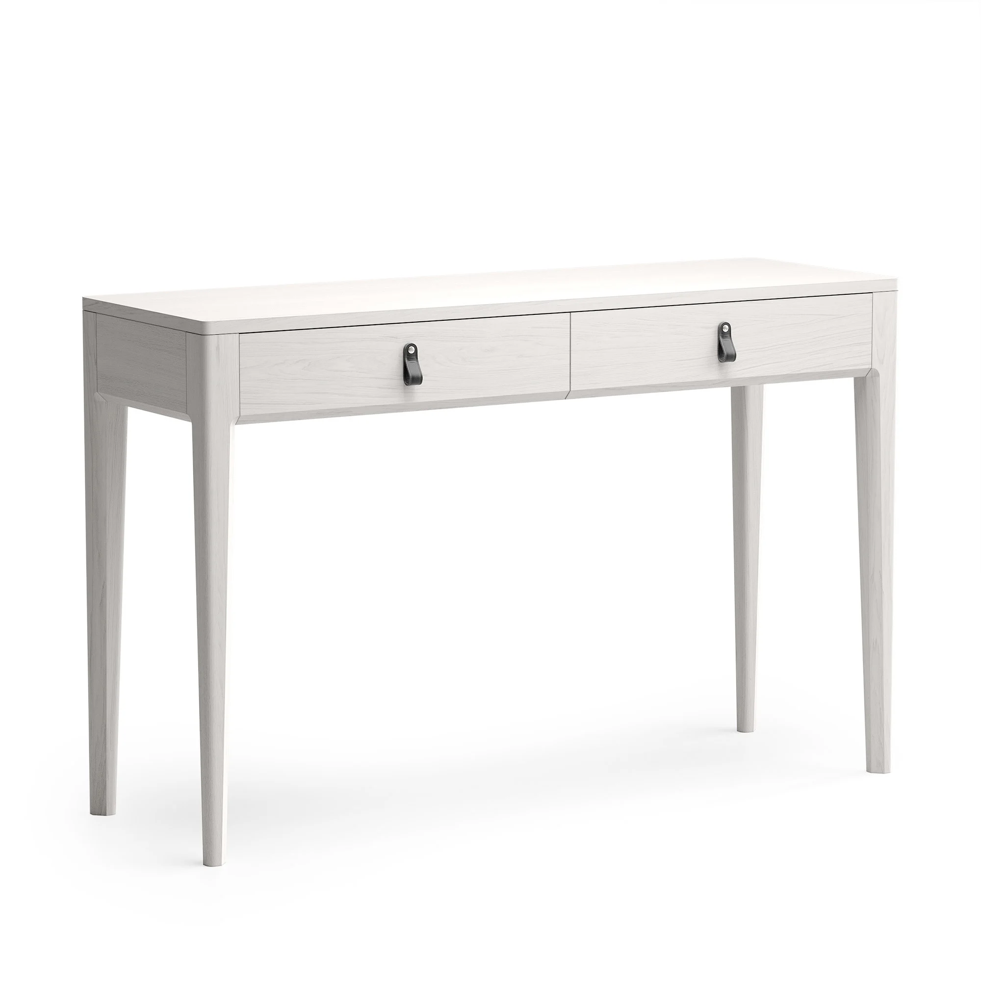 Этот компактный консольный стол уверенно выполнит функцию косметического столика. Компактные габариты позволяют использовать его в узком холле или небольшой комнате, а утонченный образ модели поддерживается оригинальной фрезеровкой ножек и ручками из натуральной кожи, выполненными вручную мастерами The IDEA.