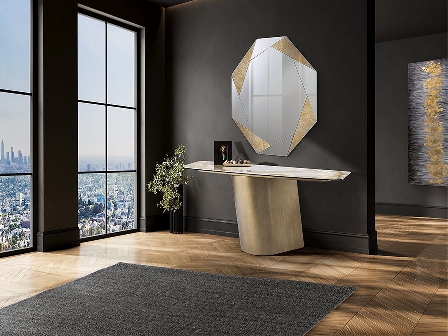 Консольный столик из металла с отделкой из матовой латуни. Столешница из ламинированного фарфора и стекла с декором из прожилок мрамора.