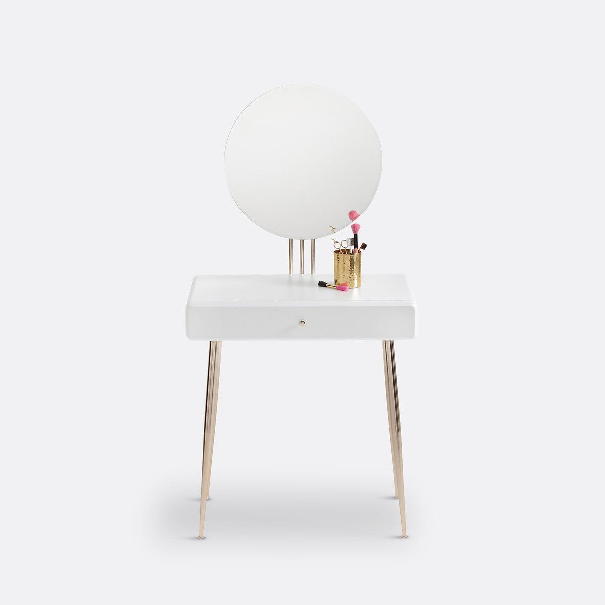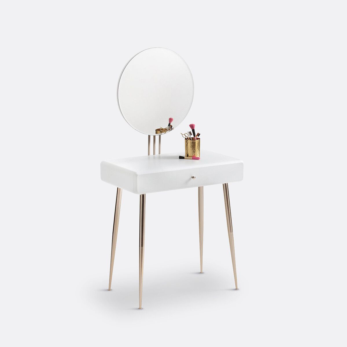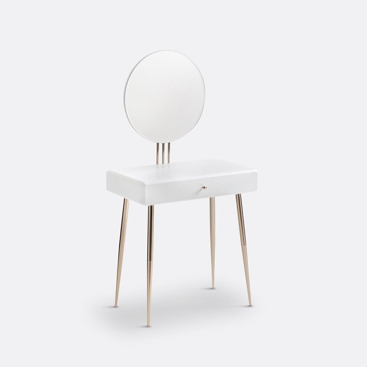 Невесомое и утонченное решение для вашего будуара. Модель с аккуратным круглым зеркалом, утонченной белой столешницей и изящными сияющими ножками из латуни гармонично дополнит интерьер вашей спальни. Просторный туалетный столик разместит все необходимое от украшений до косметических средств. Окружите себя красотой и роскошью, начните своё идеальное утро вместе с Topim.