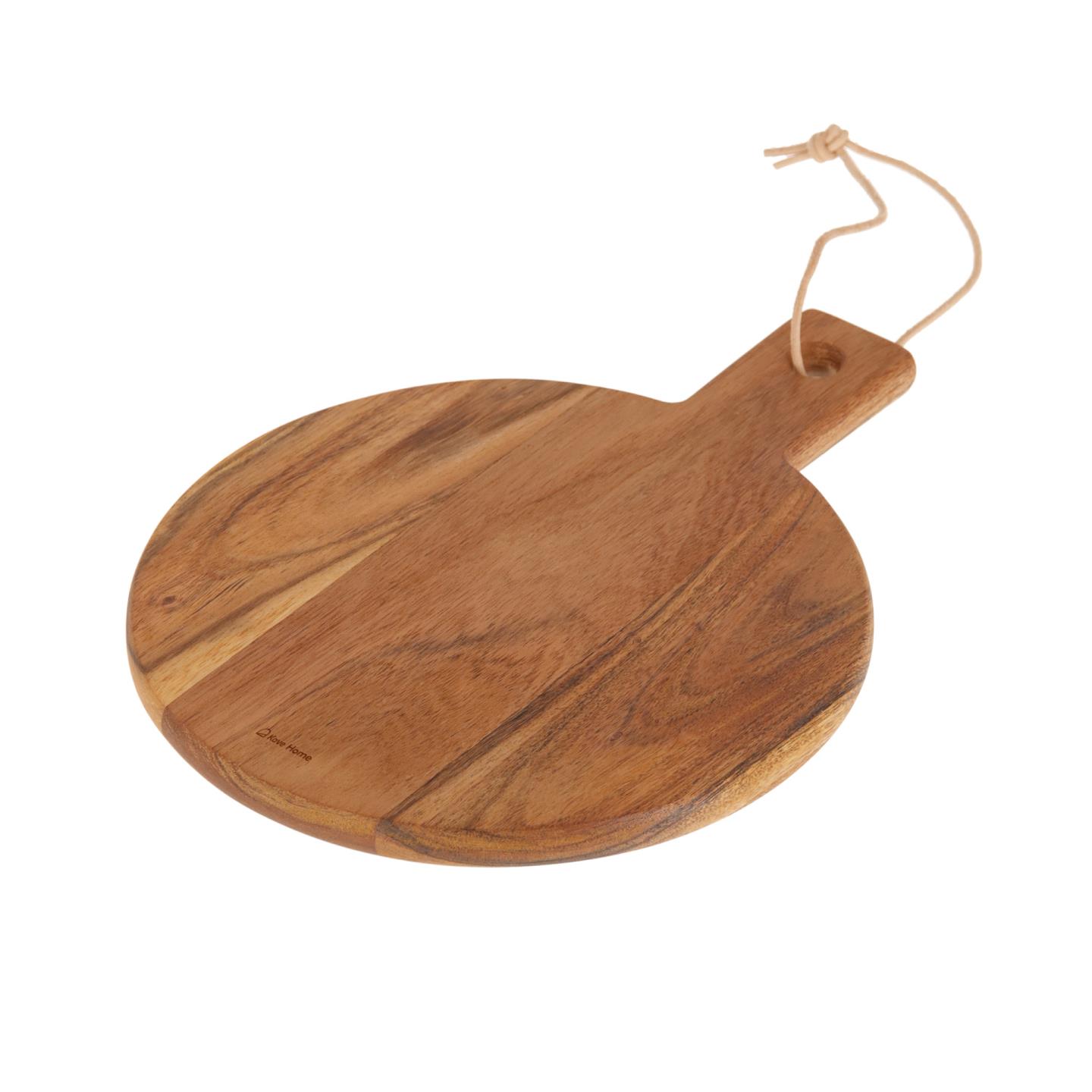 Сервировочная доска Salina, круглая по форме, полностью изготовлена из древесины акации. Будучи цельным материалом, каждая часть имеет свои уникальные и неповторимые полосы и оттенки, что делает каждую доску уникальной. Для этого натурального дерева мы рекомендуем не помещать его в посудомоечную машину и мыть вручную. Длительное воздействие воды (особенно горячей) может негативно сказаться на кухонной утвари из дерева. Вода смывает защитный, масляный слой этих природных материалов, что чревато появлению на них мелких трещин, началу гниения и разрушения их состава. Все эти предметы лучше держать подальше от посудомоечной машины. И, поскольку мы думаем обо всем, мы добавили в ручку шнур из натуральной кожи, чтобы повесить его.