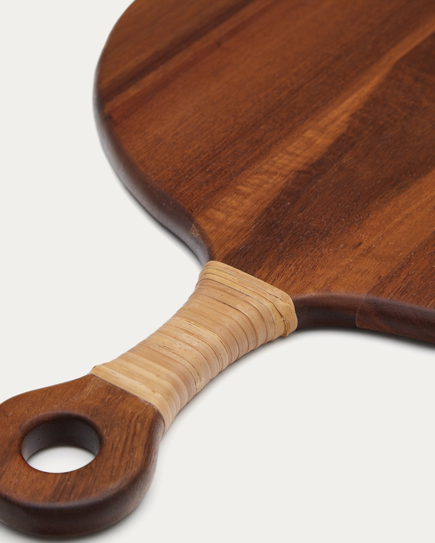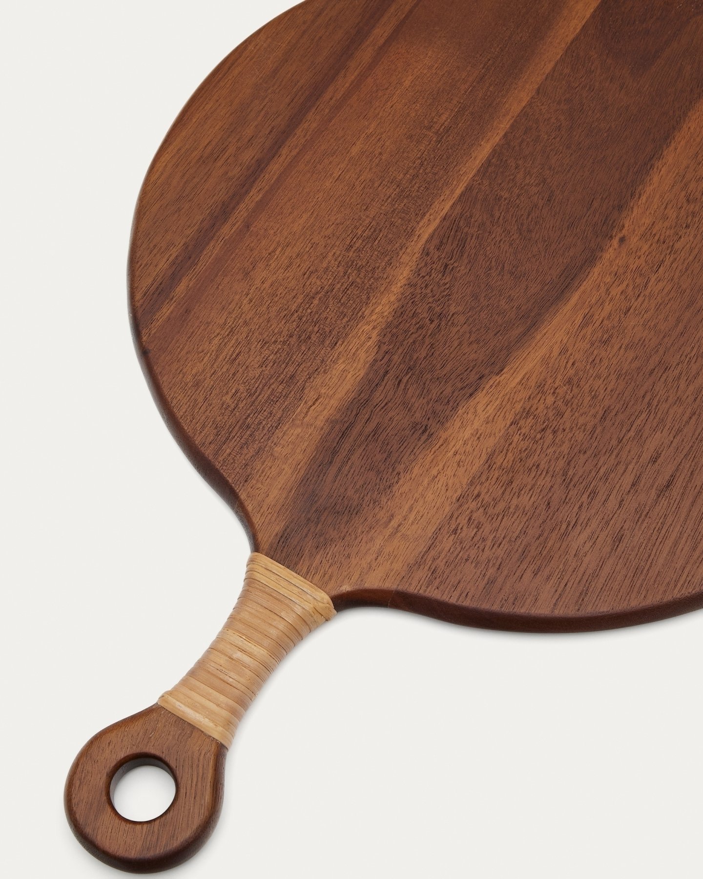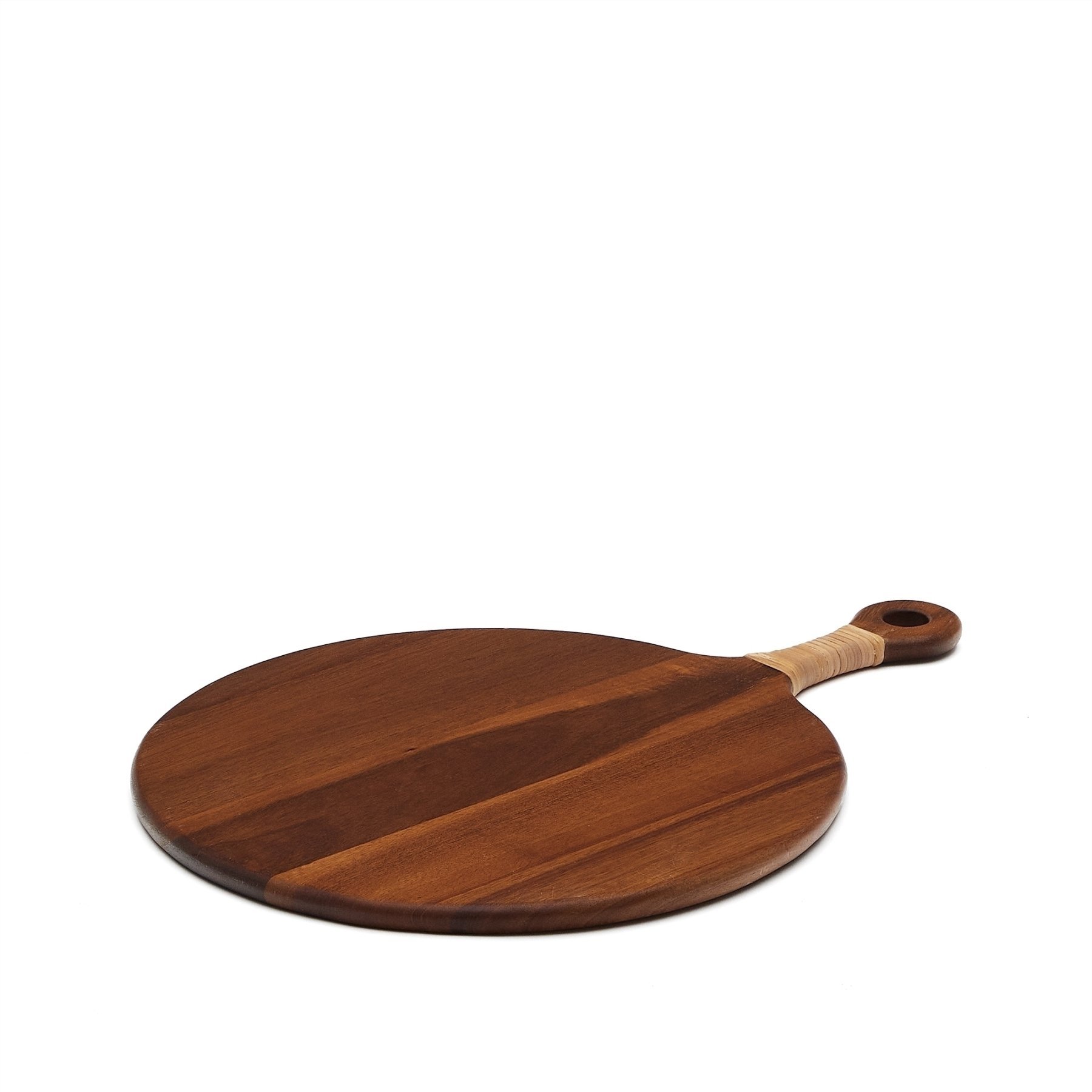 Доска имеет круглую форму. Она полностью изготовлена из древесин акации, а рукоятка окантована ротангом. Сверху полиуретановое покрытие, которое защищает изделие от негативного воздействия влаги, солнца, облегчает чистку.
