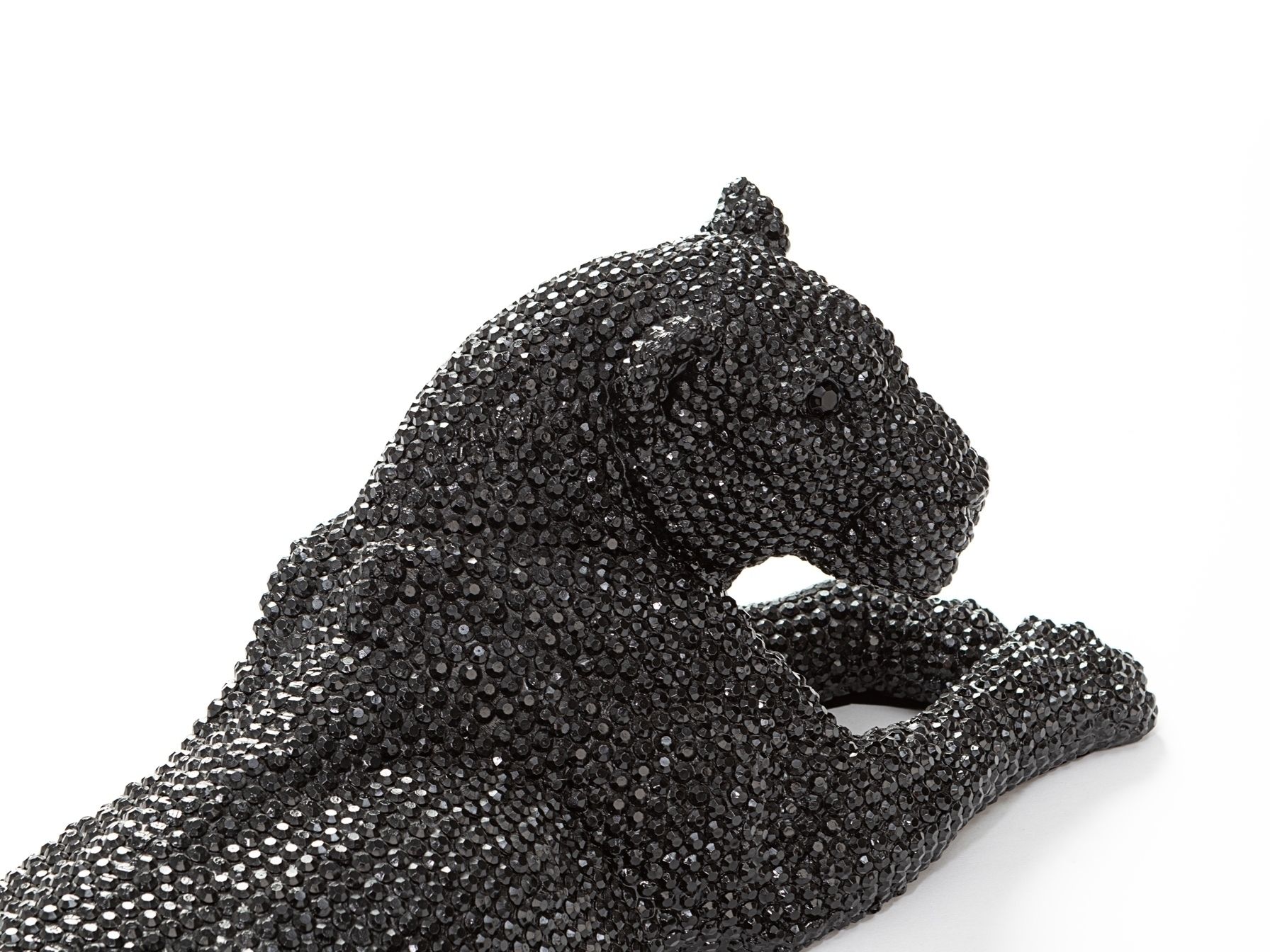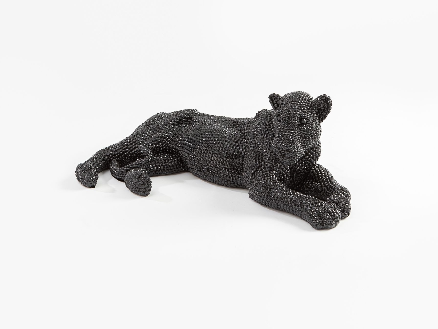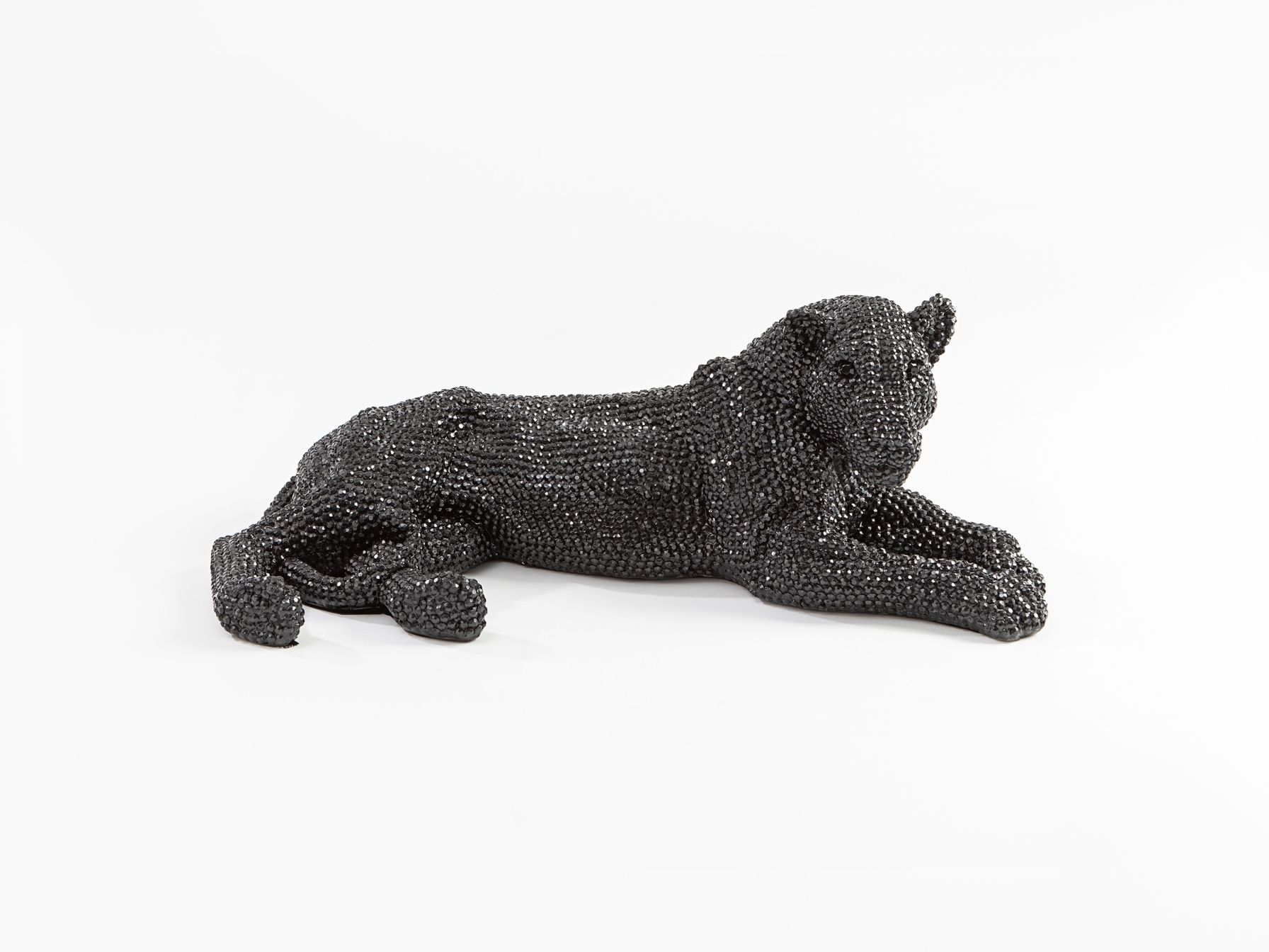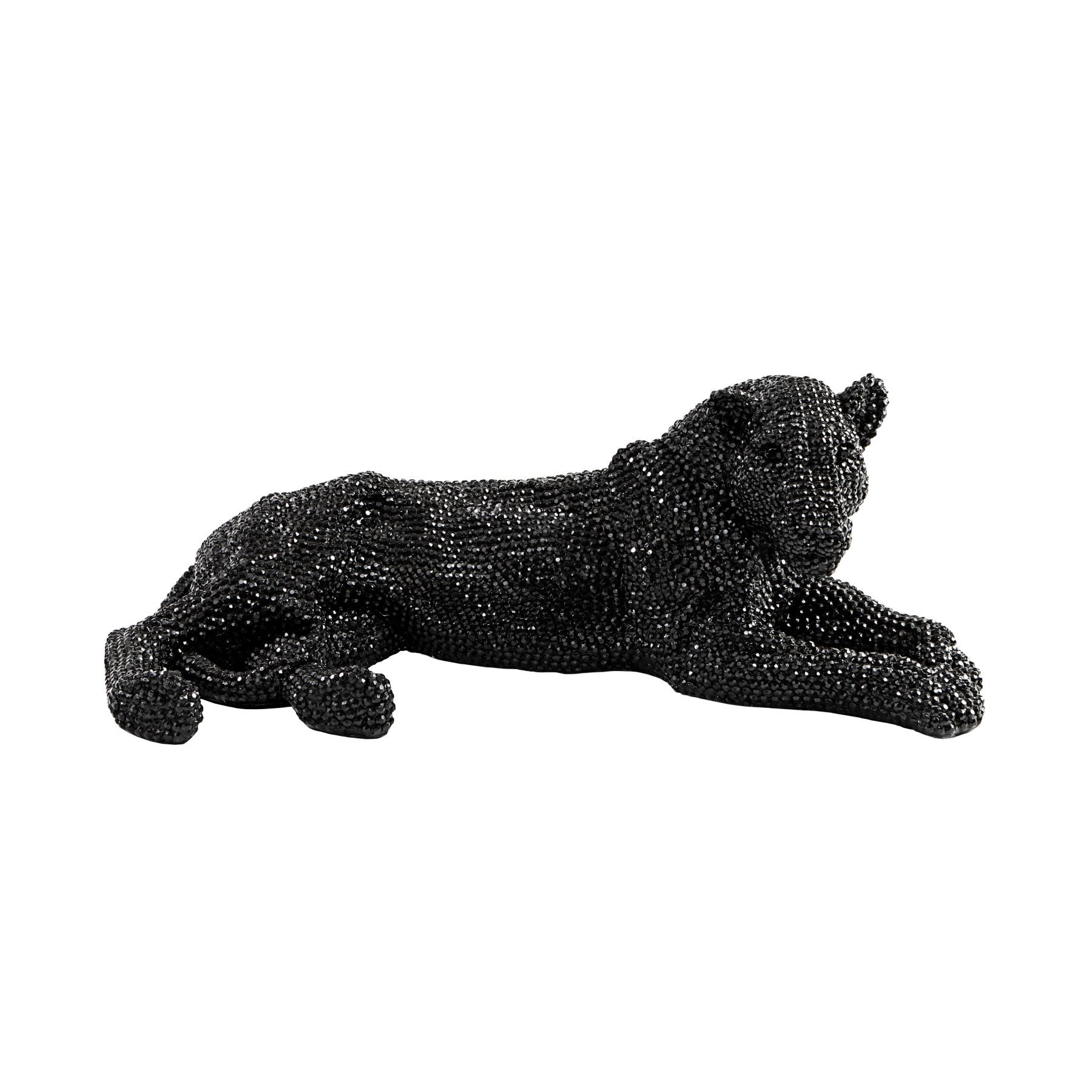 Фигура маленькая лежащей львицы из полирезина с фактурным глянцевым покрытием чёрного цвета, имитирующим инкрустацию стразами.