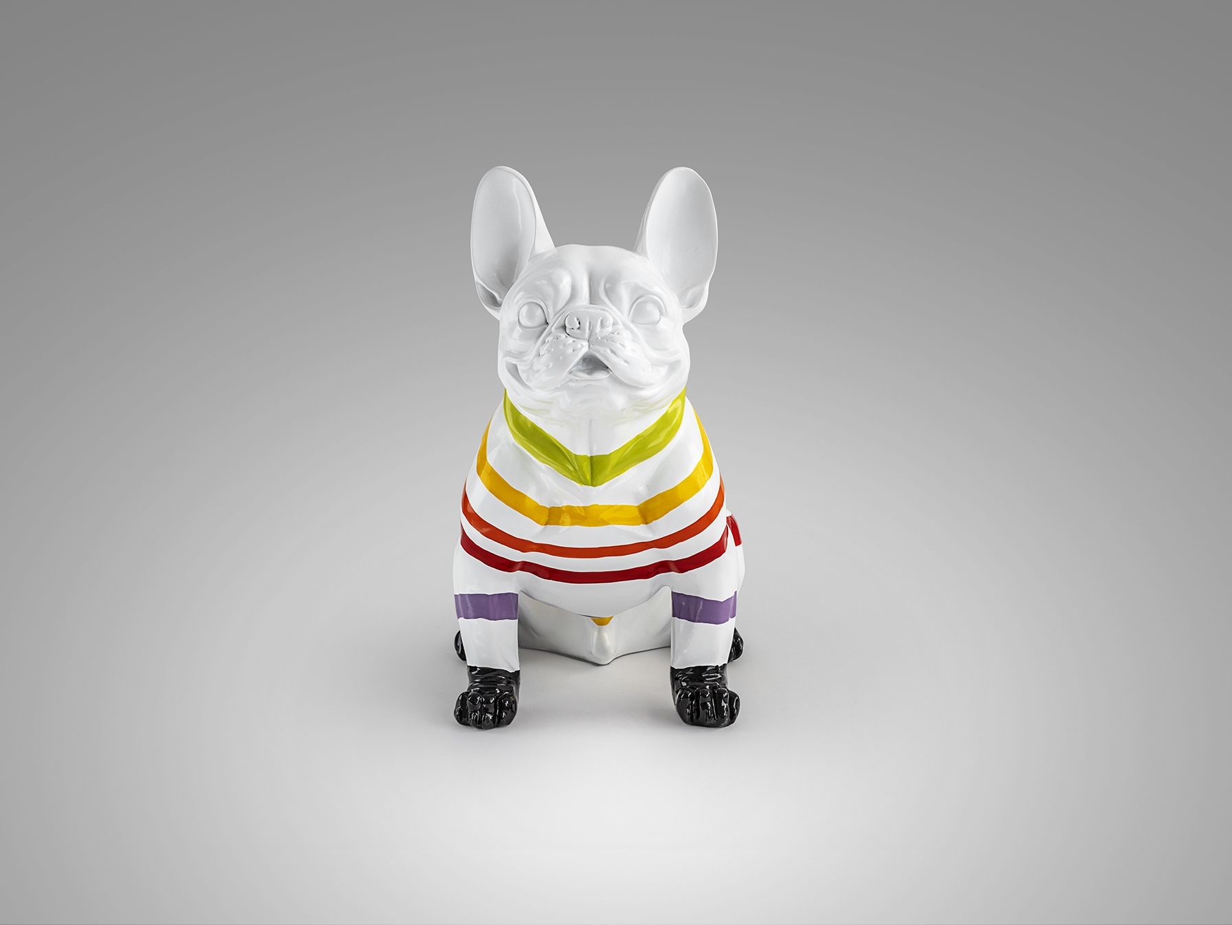 Фигурка французского бульдога небольшого размера, изготовлена из смолы. Оформление: Белая краска с цветными полосками.