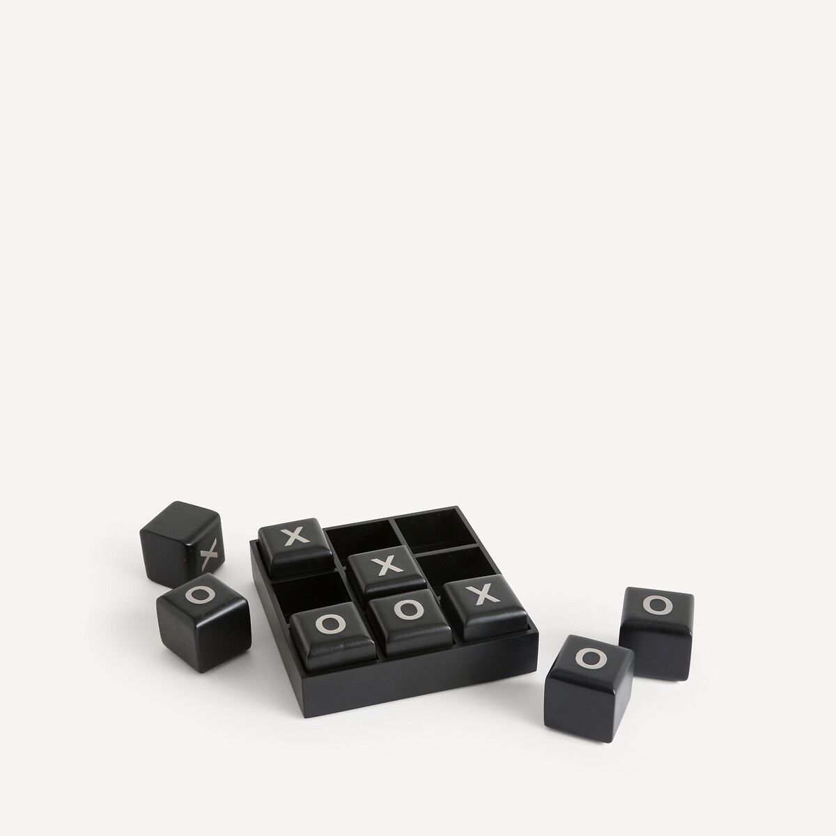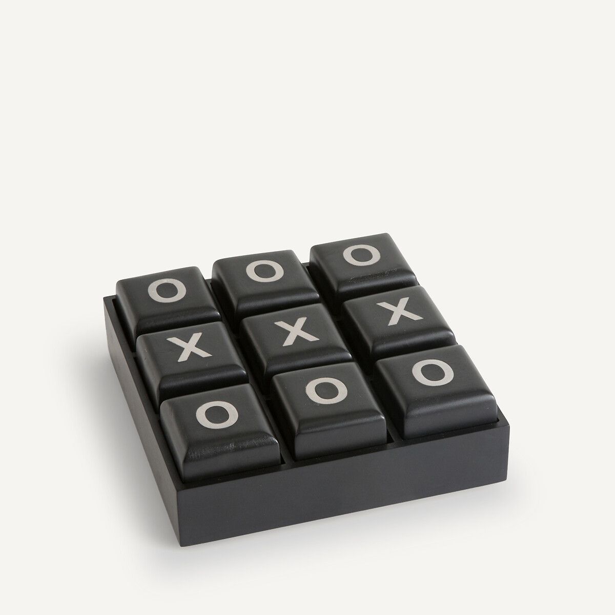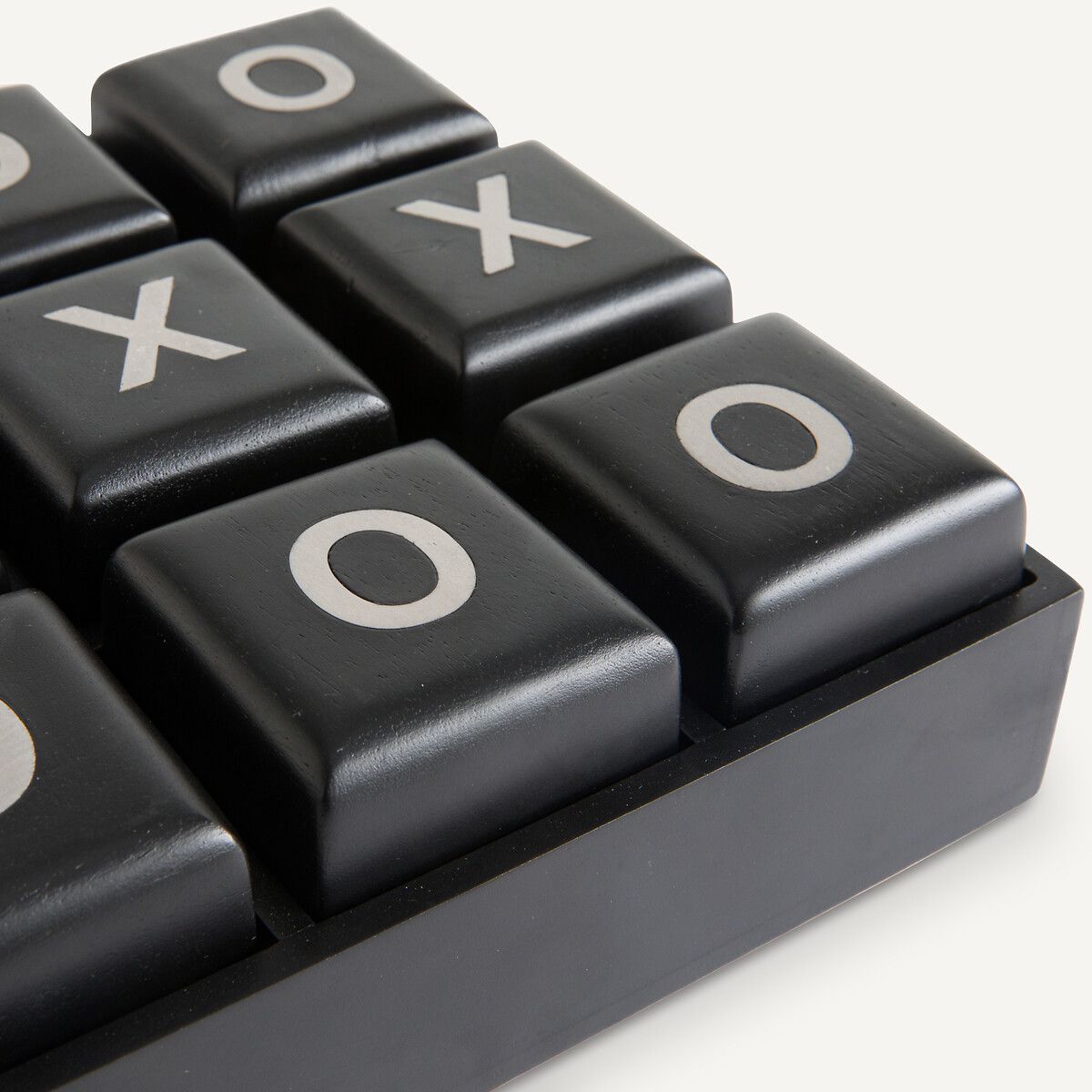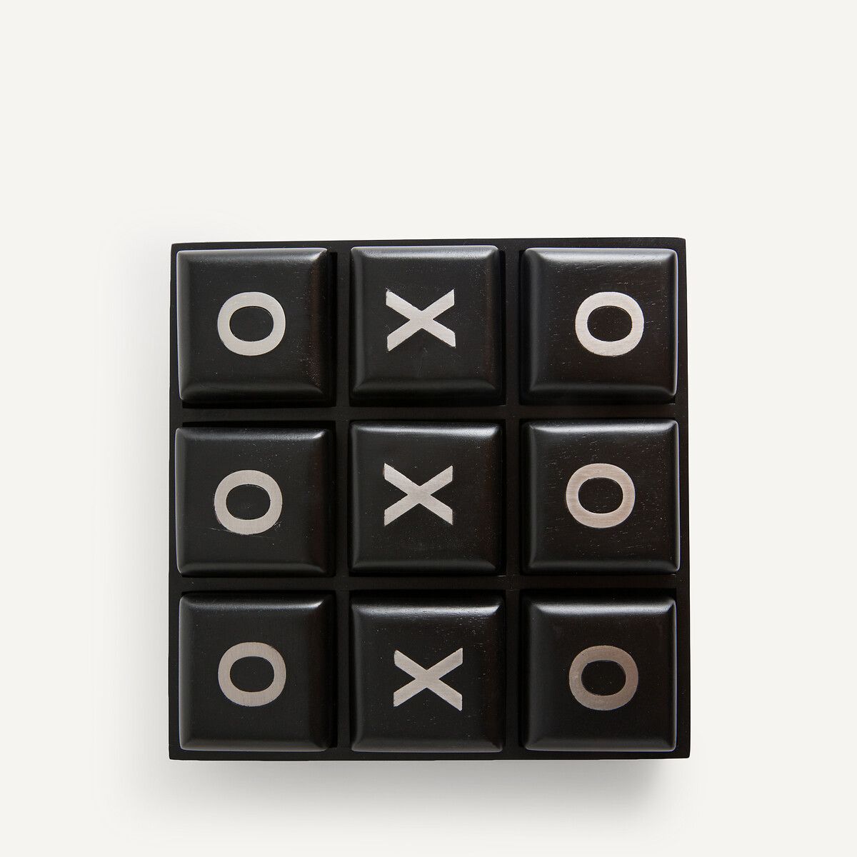 Из массива мангового дерева с черным покрытием и вставки из стали с отделкой под глянцевый никель. Девять съемных кубиков с включением из металла на двух сторонах.