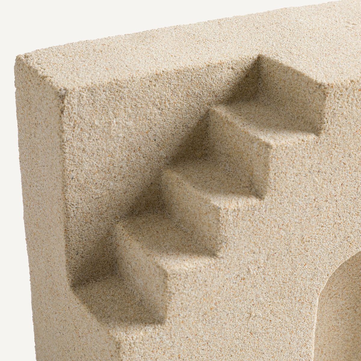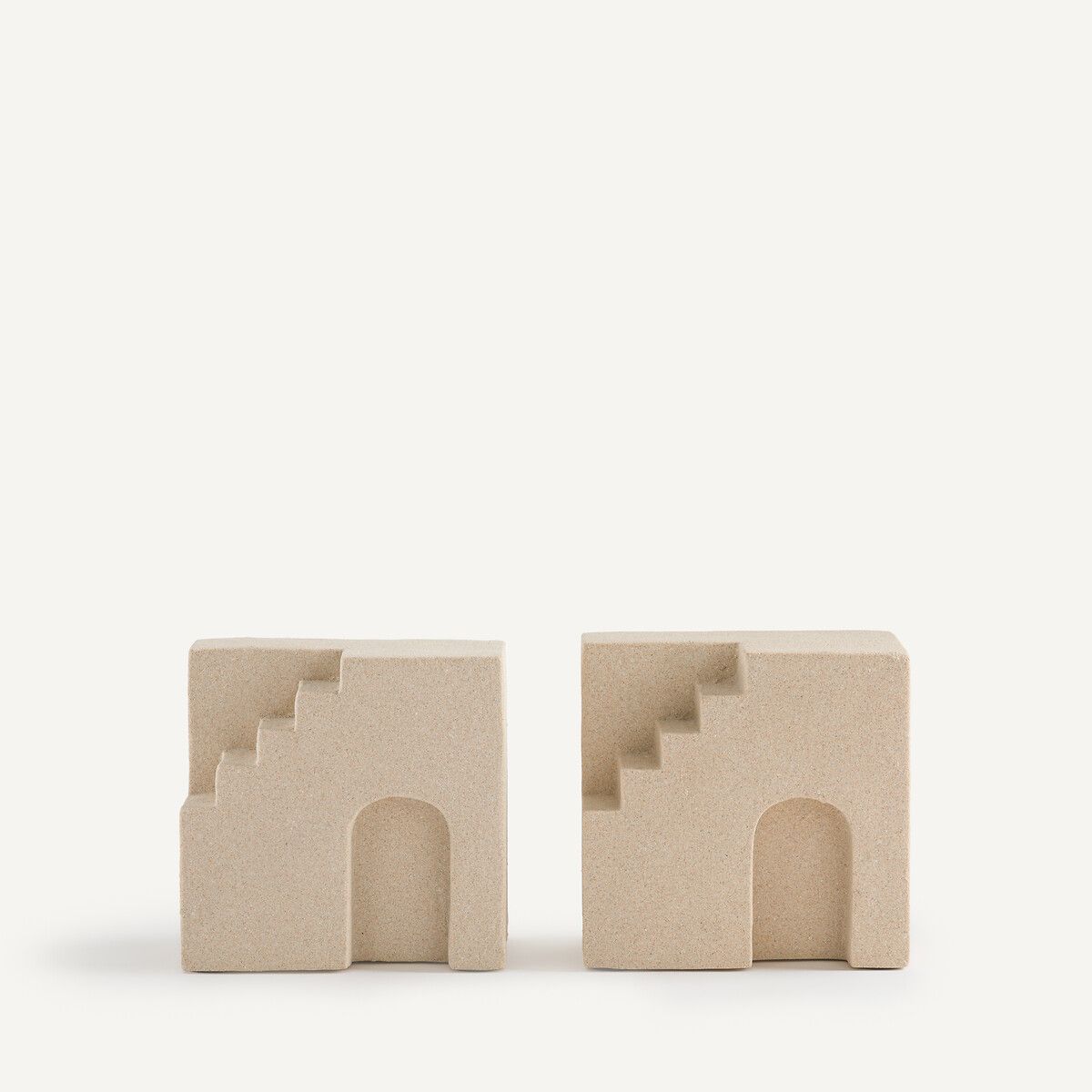 Словно иллюстрация воспоминаний о путешествиях. Две подставки для книг с несколькими прямыми линиями и аркадой, напоминающие жилье на границе пустыни. Гранулированный материал на ощупь напоминает песок. Вдохновляющий минимализм.