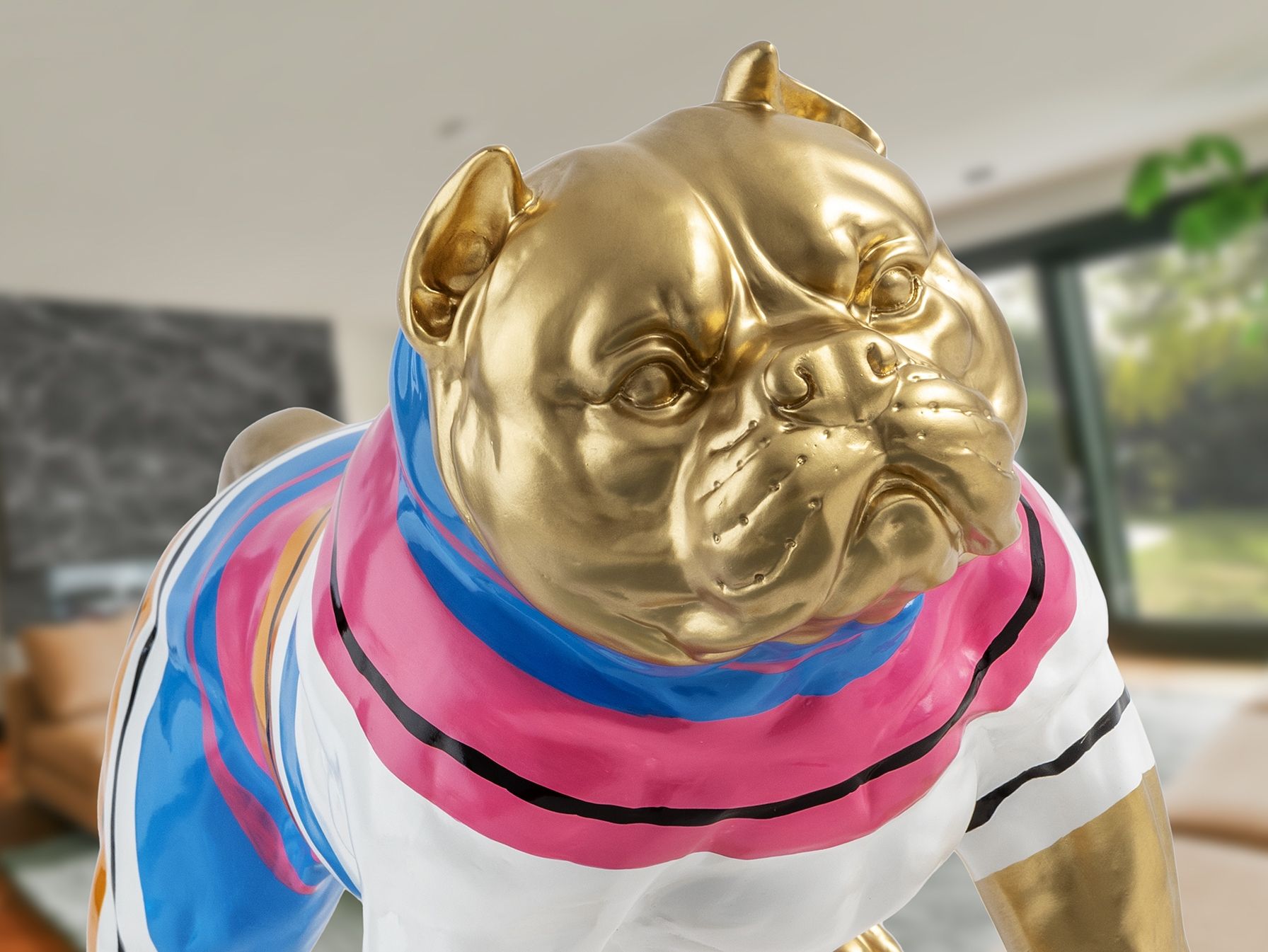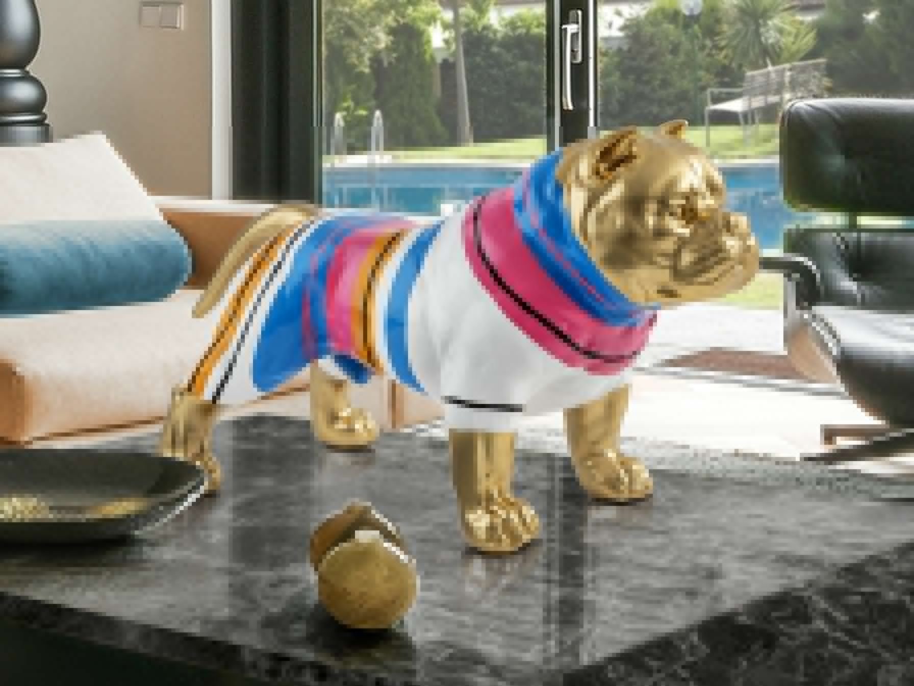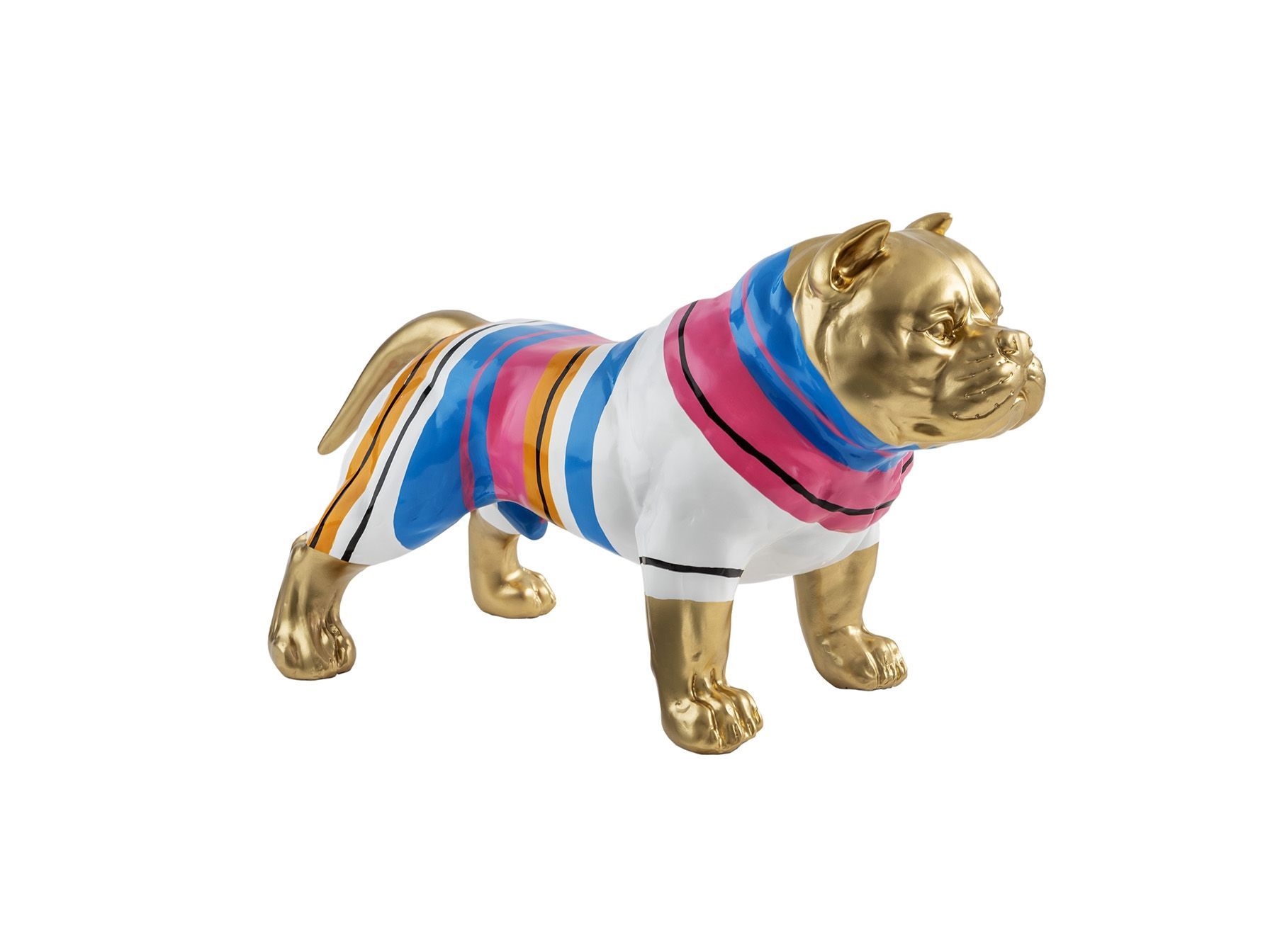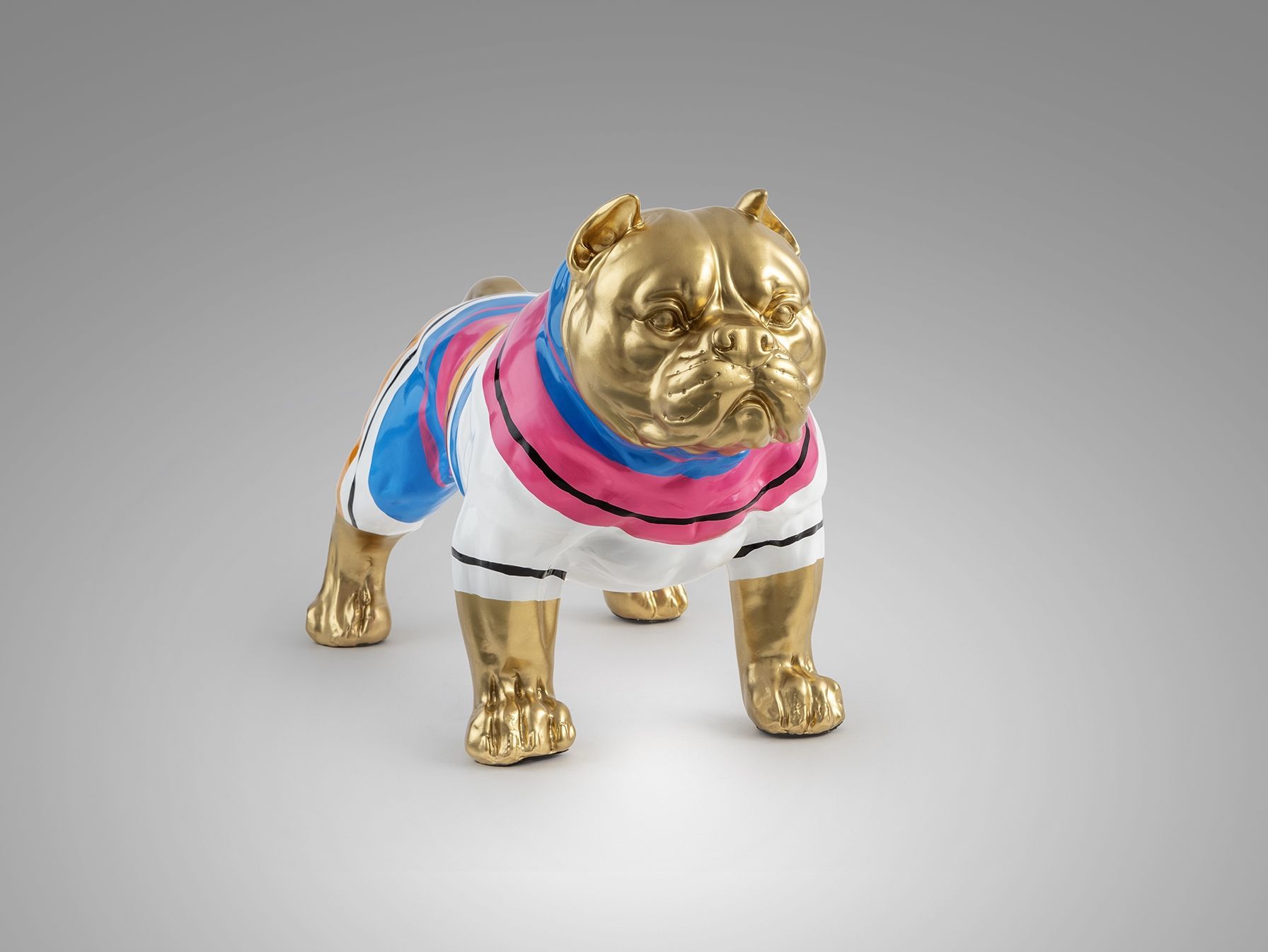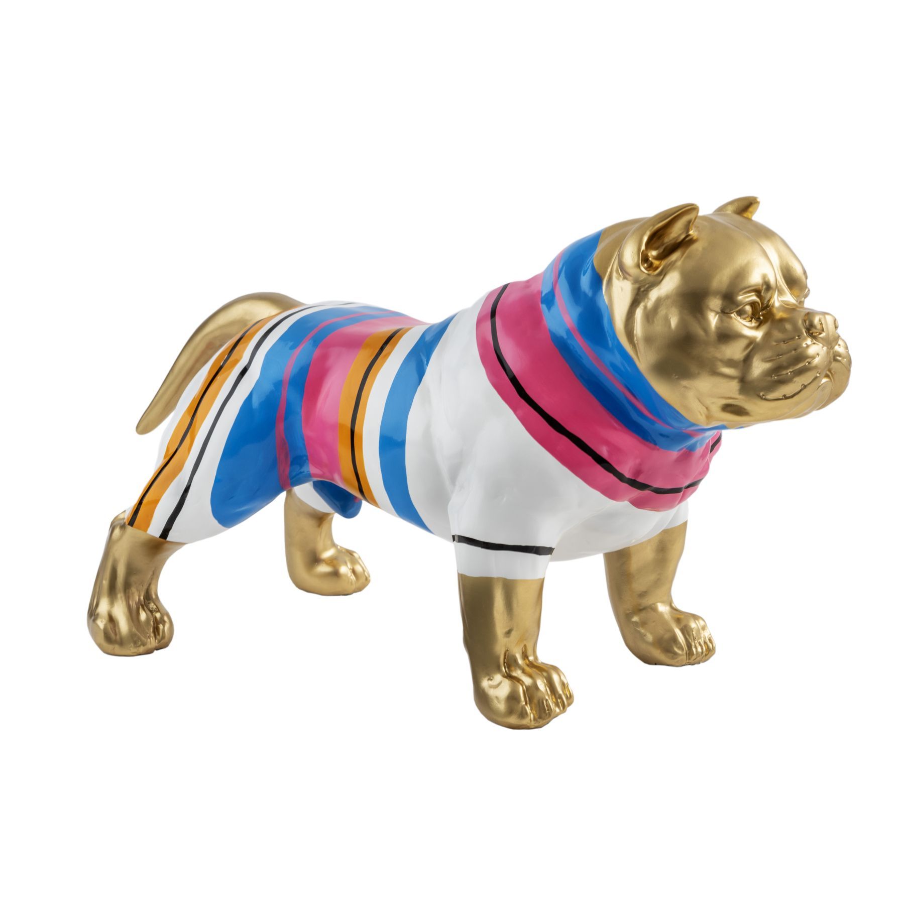 Фигурка Питбуля среднего размера, изготовлена из смолы. Оформление: золотая краска с цветными полосками.
