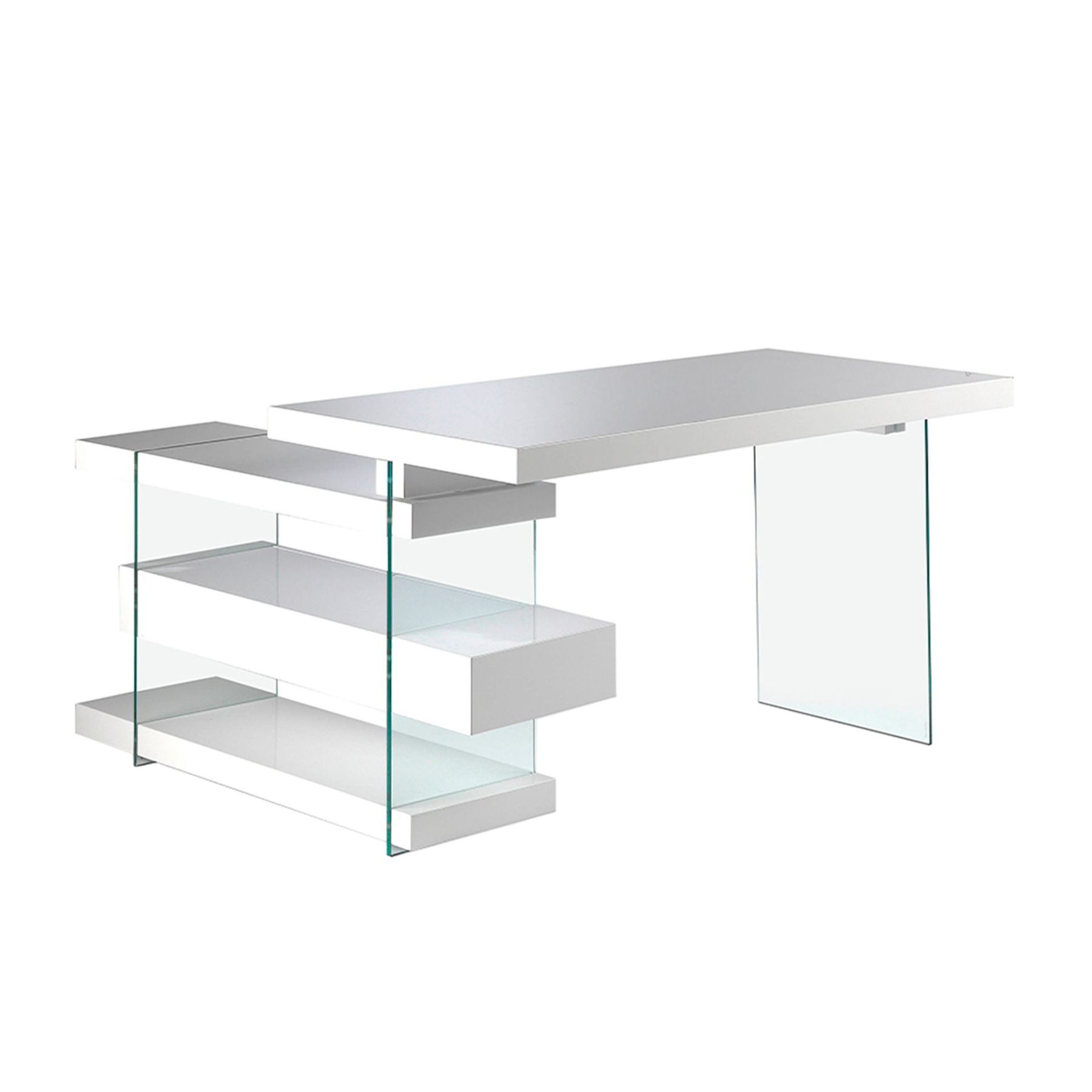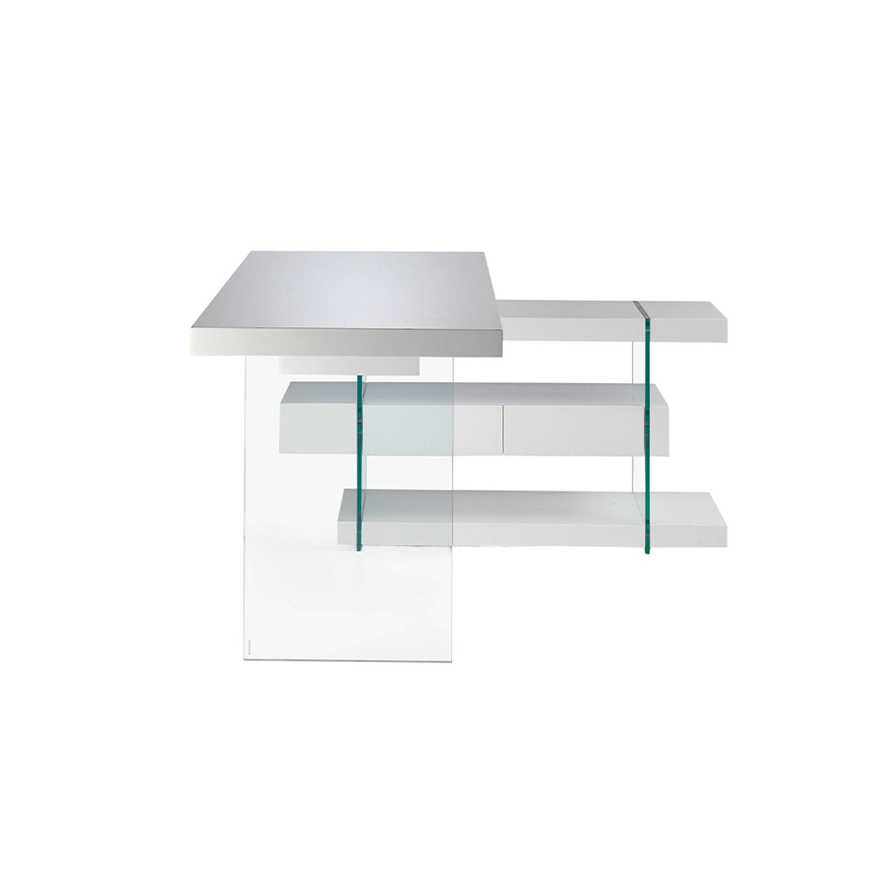 Письменный стол Decora 978OT-BLANCO от Angel Cerda — испанский взгляд на современное обустройство рабочего места. Стол выглядит изумительно. Его угловая конструкция увеличивает площадь рабочей поверхности, облегчает доступ к книгам, документам. Сочетание стекла и полок из МДФ создает удивительное ощущение легкости конструкции. Здесь в каждой детали просматривается дух современности, технологий. Такая модель придется по вкусу всем приверженцам европейского модерна, и, в частности, поклонникам стилей хай-тек, минимализм. Конструкционно стол состоит из четырех панелей прочного МДФ белого глянцевого цвета и двух опор из закаленного стекла. Все комплектующие имеют прямоугольную форму. Столешница с полками расположена перпендикулярно. Полки соединены между собой стеклами, которые буквально пронизывают каждую комплектующую. Всю полочную конструкцию огибает рама из стекла, нижняя грань которой служит основанием для стола. Именно она обеспечивает хорошую устойчивость изделия. Стеклянные опоры прочные, стойкие к ударам твердыми предметами. Поэтому стол выдерживает высокие весовые нагрузки, безопасен при эксплуатации. Размеры изделия: длина — 140 см, глубина — 127 см, высота — 75 см. Потребуется самостоятельная сборка. Инструкция и крепеж входят в комплектацию.