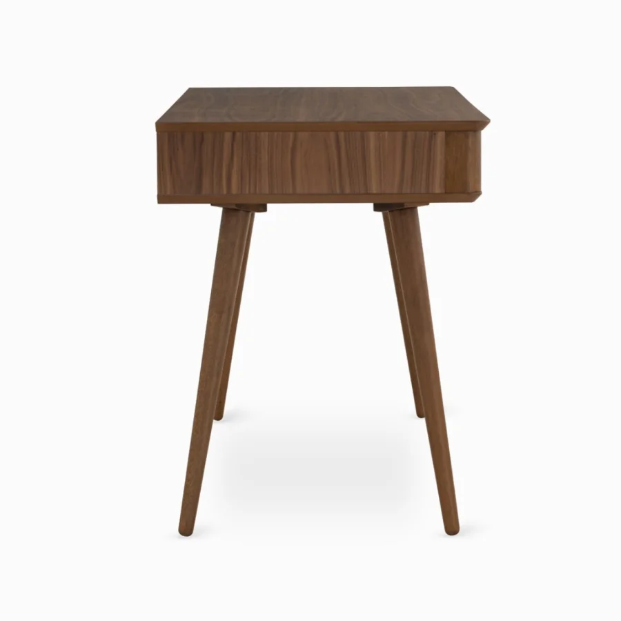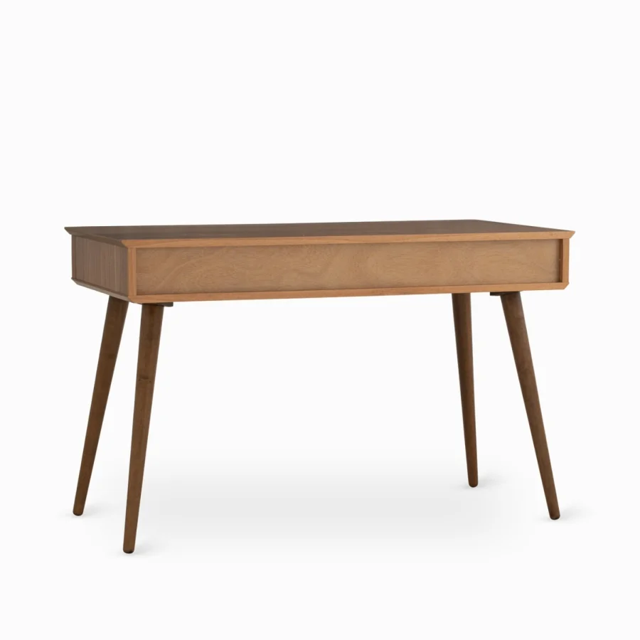 Столешница из МДФ с шпоновой отделкой ореха в коричневом цвете создает теплую и уютную атмосферу, придавая столу характерный вид, который отлично вписывается в индустриальный стиль.