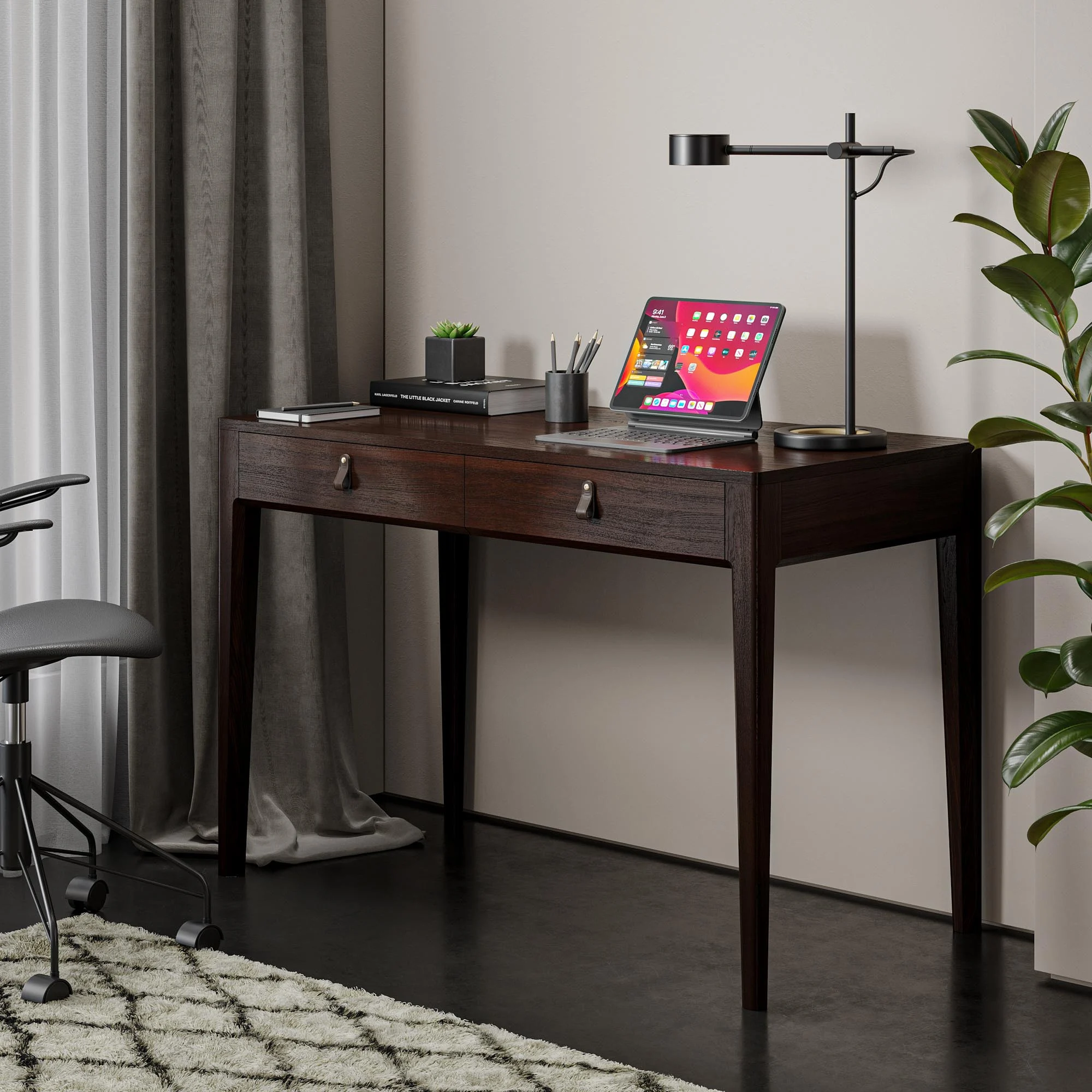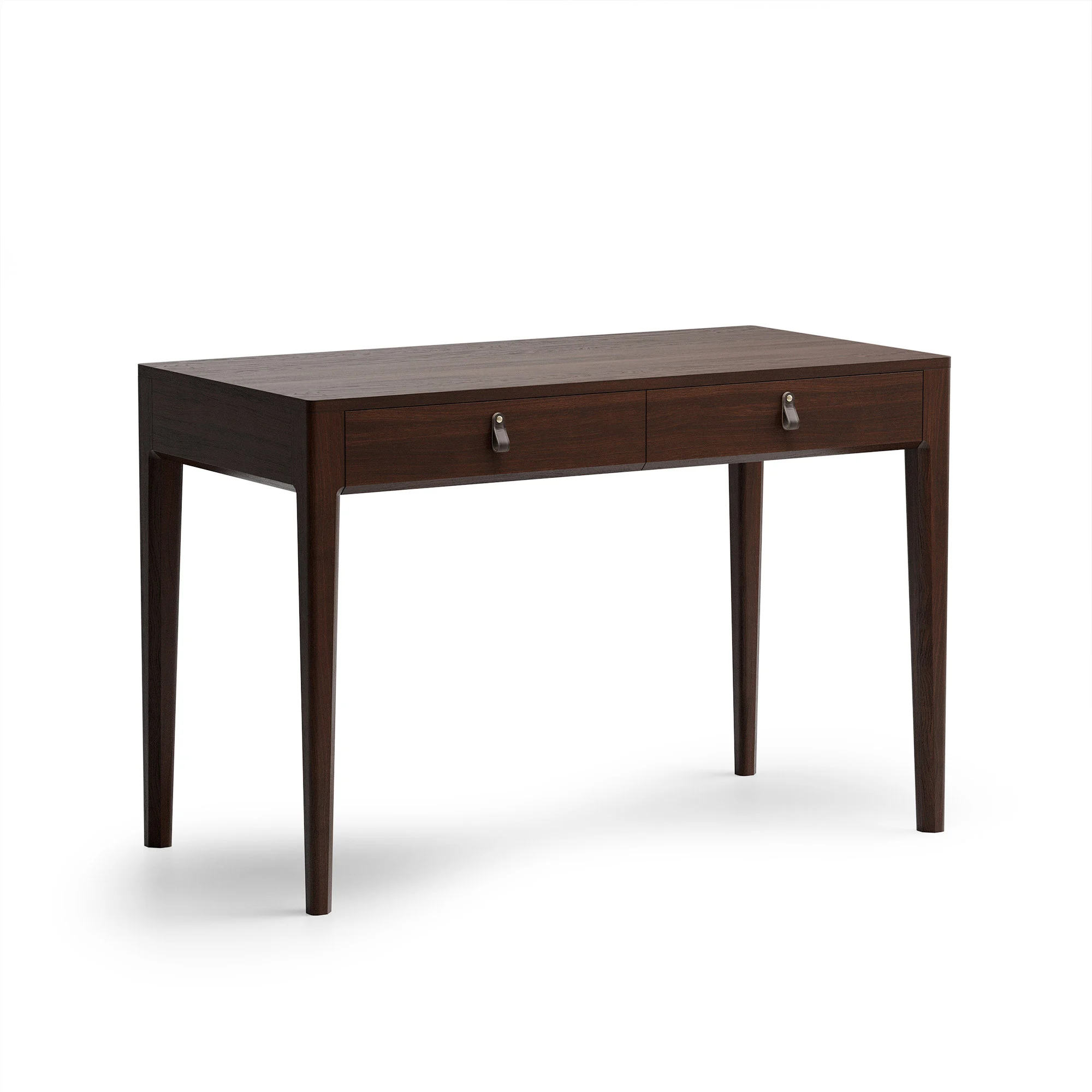 Основательный стол для организации рабочего места. Это стол с правильной прямоугольной формой и двумя вместительными ящиками для бумаг, оригинальными ручками The IDEA из натуральной кожи и неповторимой текстурой дуба, которая просматривается под эмалью.