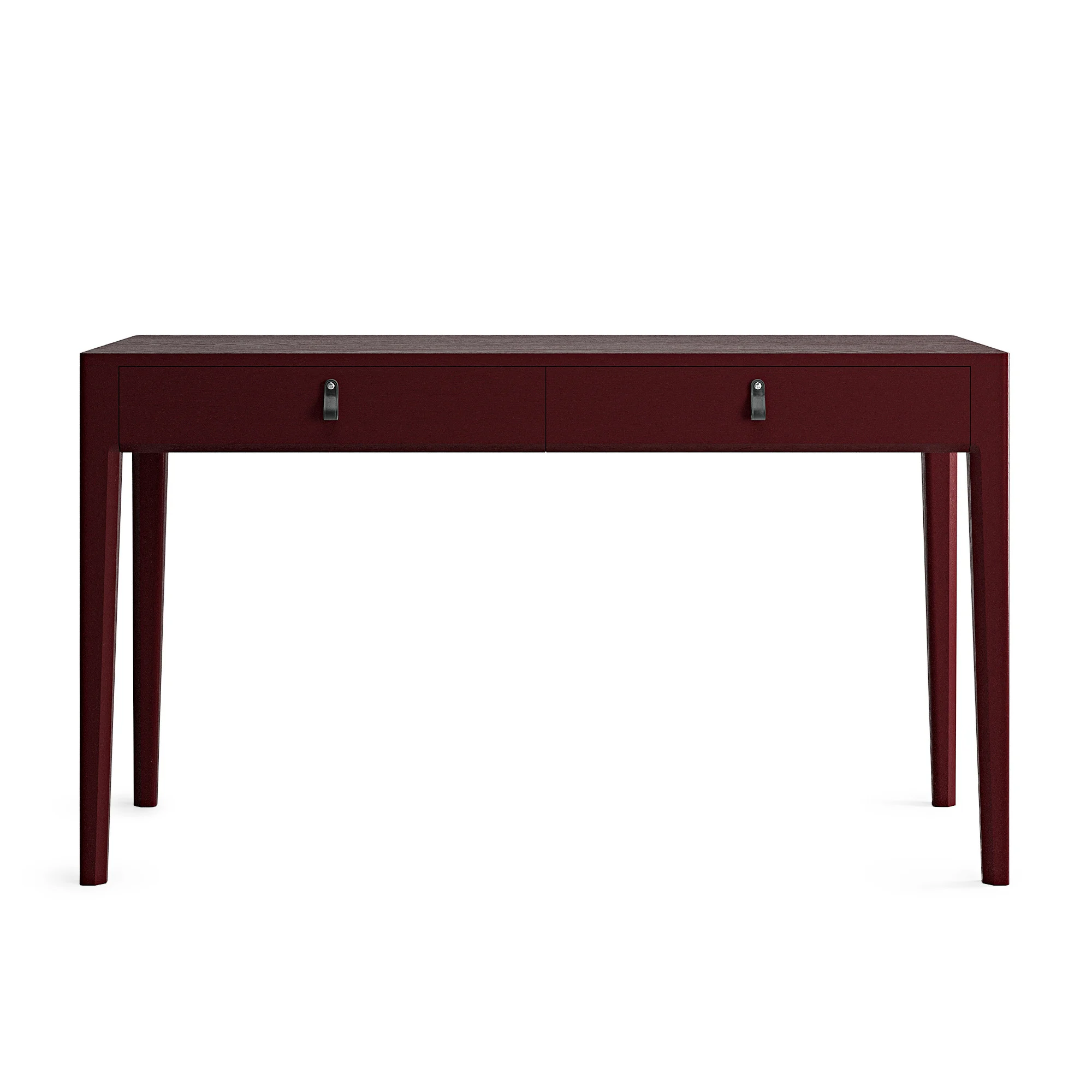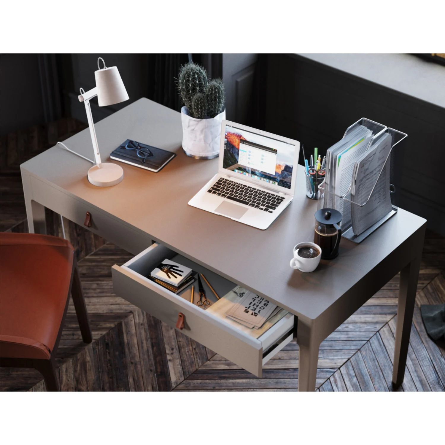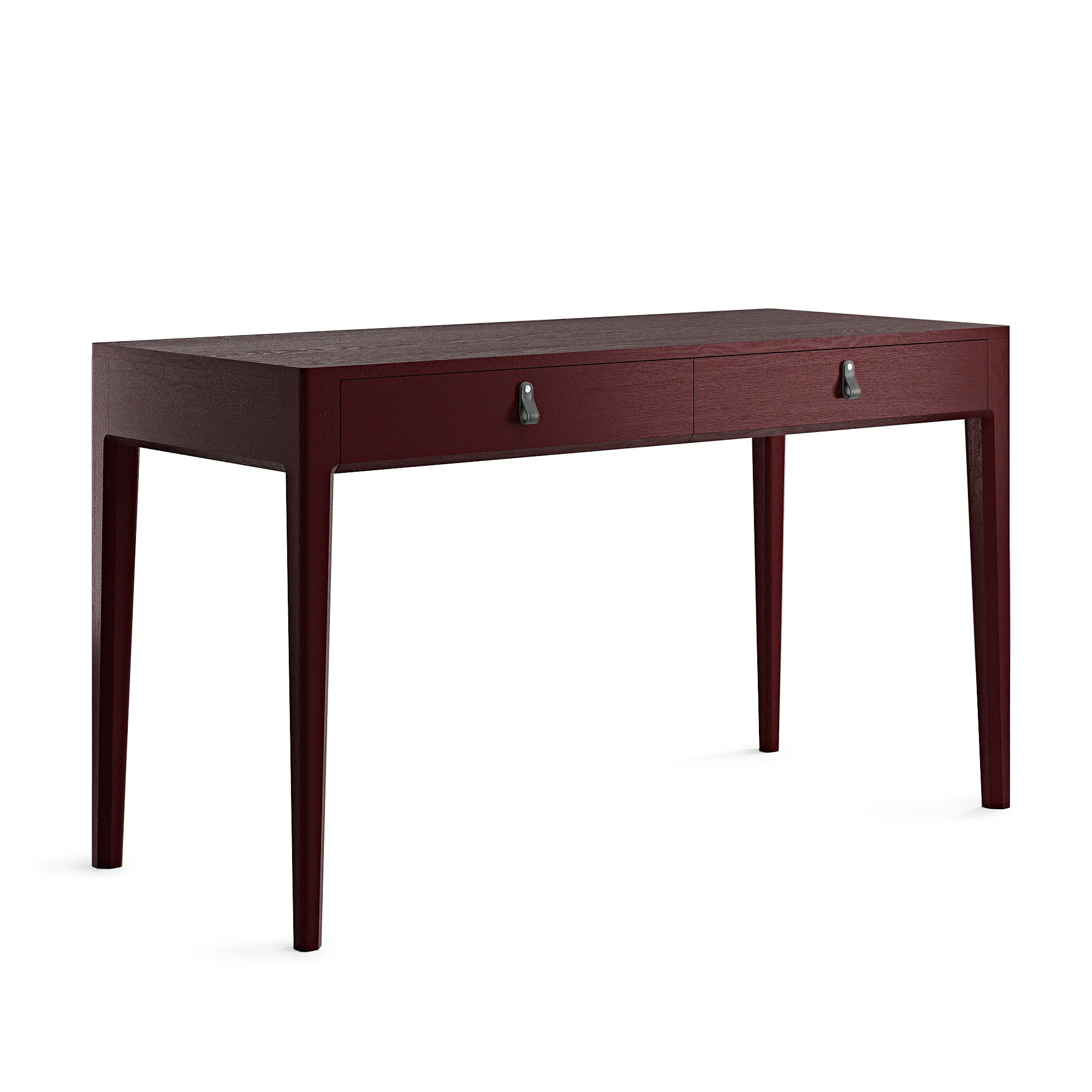 Основательный стол для организации рабочего места. Это стол с правильной прямоугольной формой и двумя вместительными ящиками для бумаг, оригинальными ручками The IDEA из натуральной кожи и неповторимой текстурой дуба, которая просматривается под эмалью.
