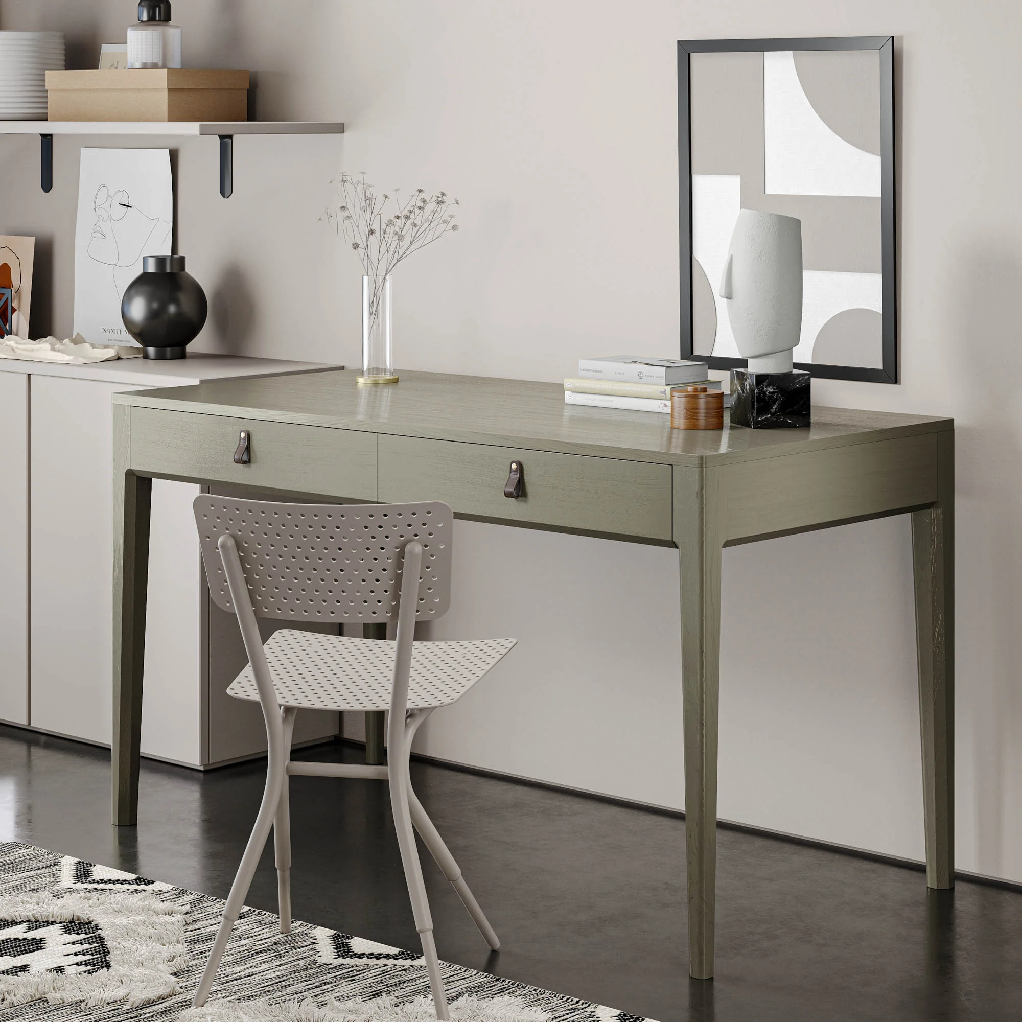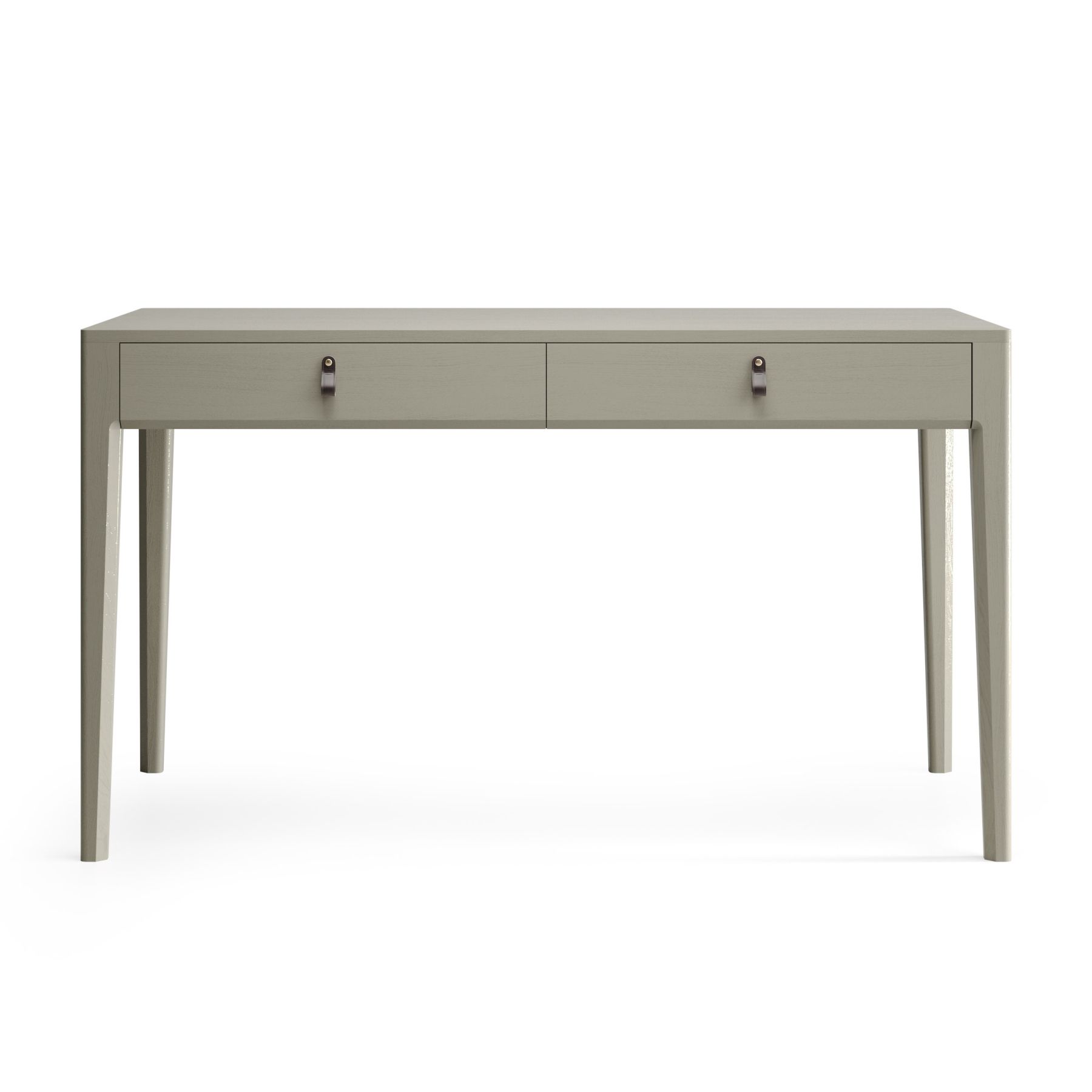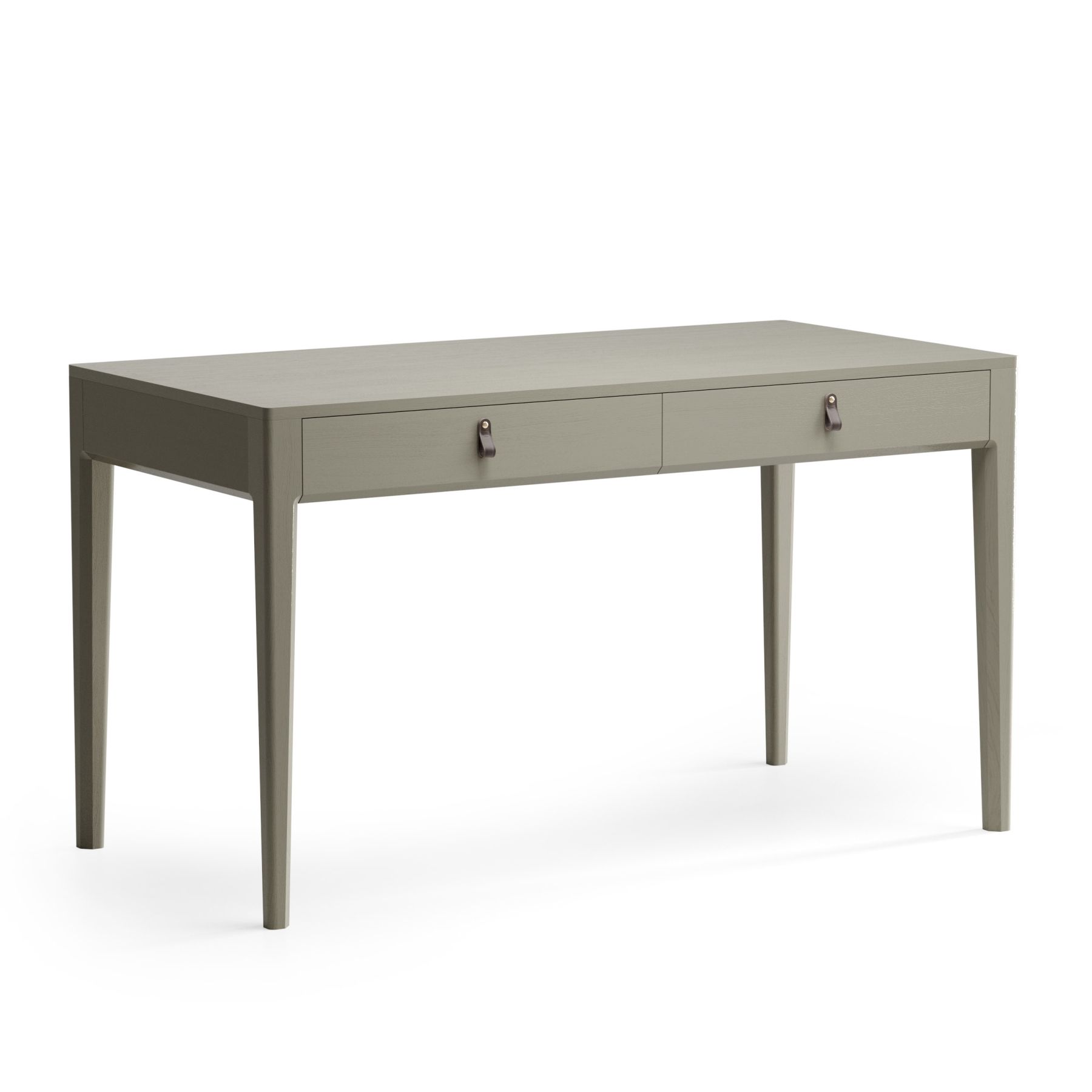 Основательный стол для организации рабочего места. Это стол с правильной прямоугольной формой и двумя вместительными ящиками для бумаг, оригинальными ручками The IDEA из натуральной кожи и неповторимой текстурой дуба, которая просматривается под эмалью.