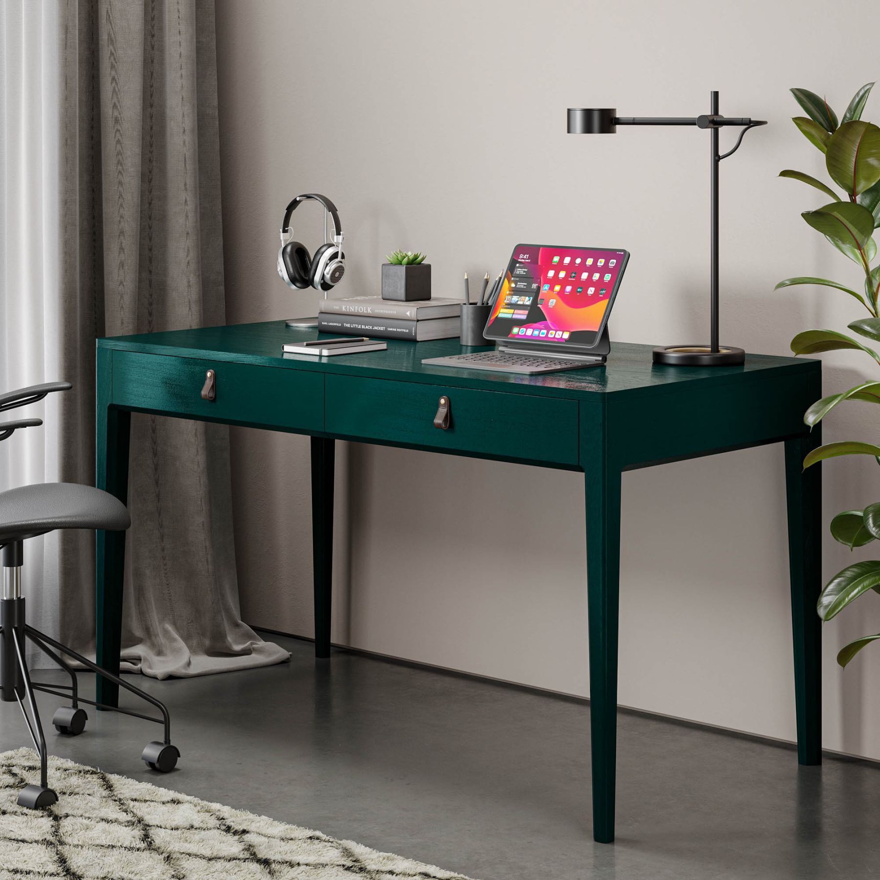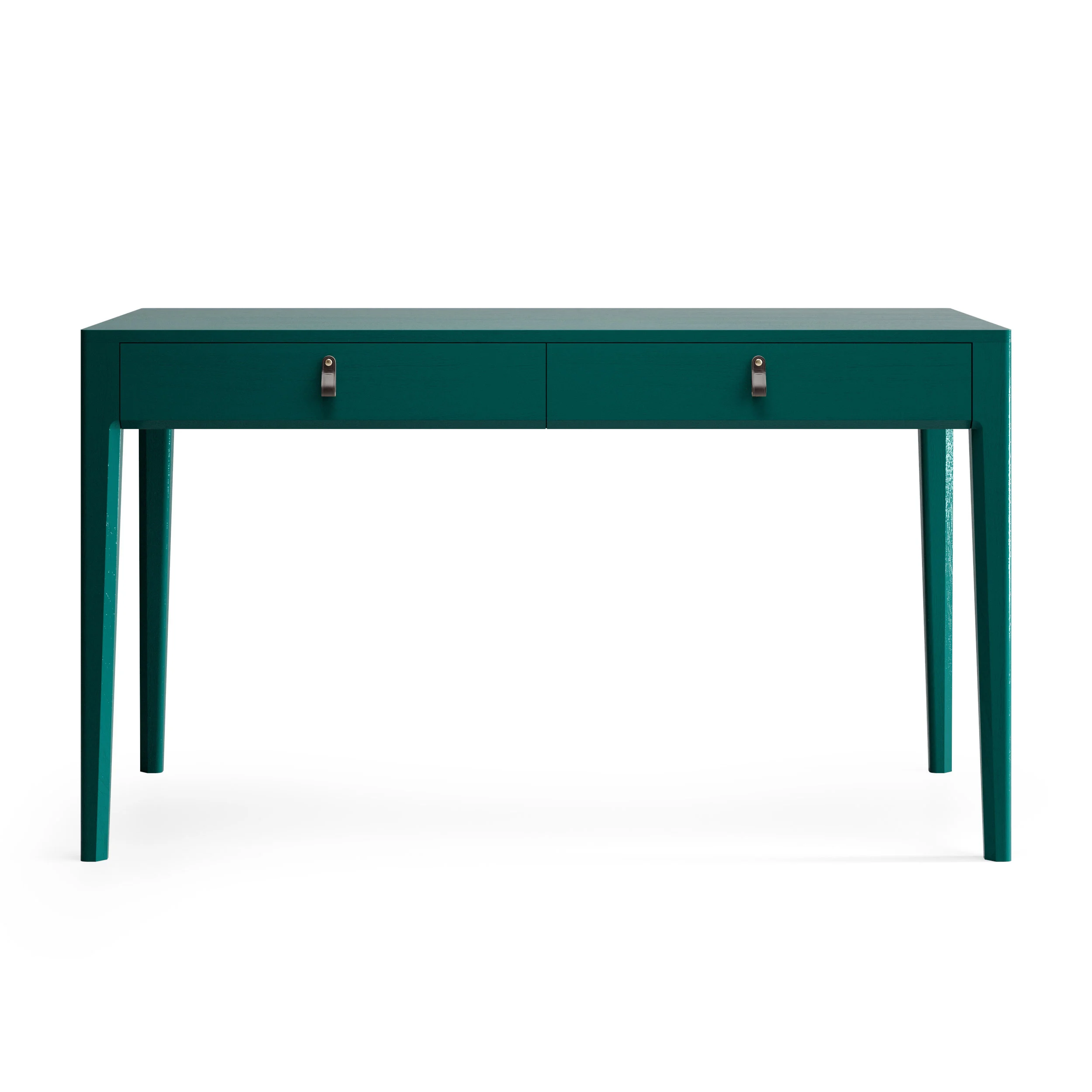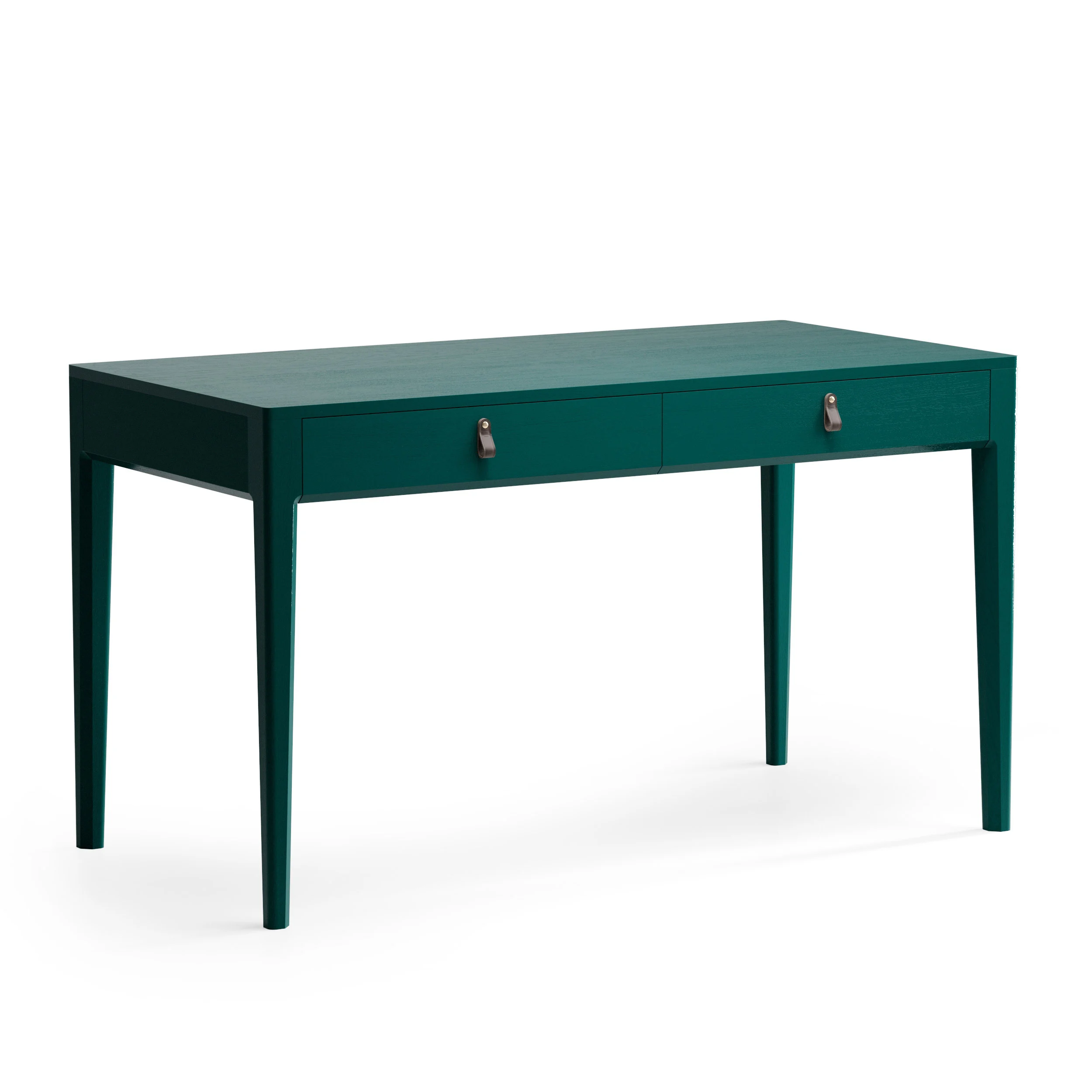 Основательный стол для организации рабочего места. Это стол с правильной прямоугольной формой и двумя вместительными ящиками для бумаг, оригинальными ручками The IDEA из натуральной кожи и неповторимой текстурой дуба, которая просматривается под эмалью.