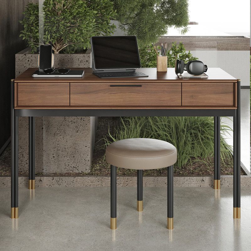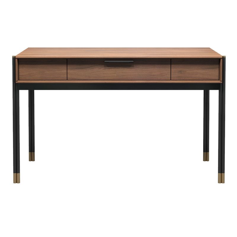 Каркас стола выполнен из высококачественного МДФ. Отделка - натуральный шпон американского ореха. Металлические ножки в матовом черном лаке, детали в цвете латунь. Металлическая ручка в черном матовом лаке.
