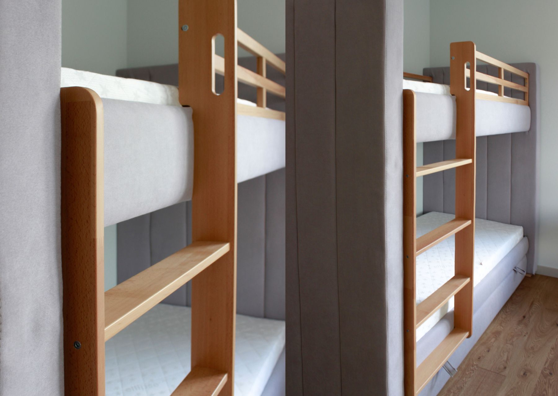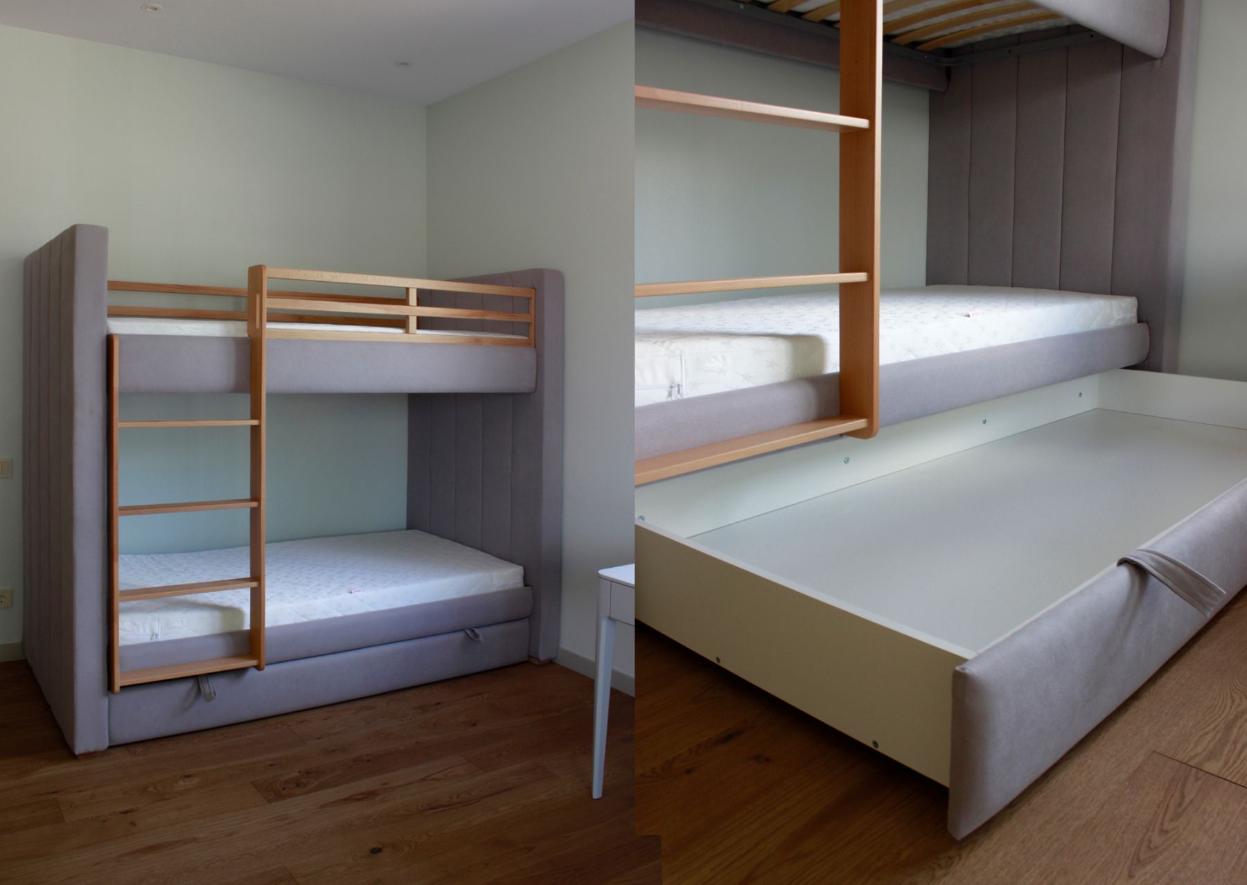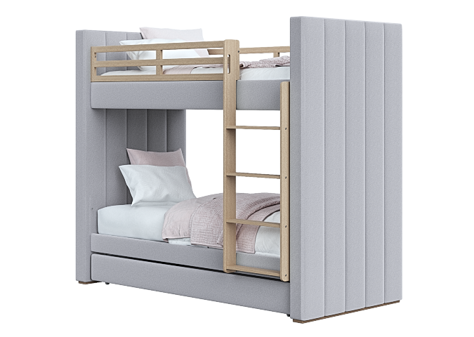 Мягкая уютная двухъярусная кровать Cosy может быть выполнена в различных цветах: бежевый, серый, розовый или голубой.