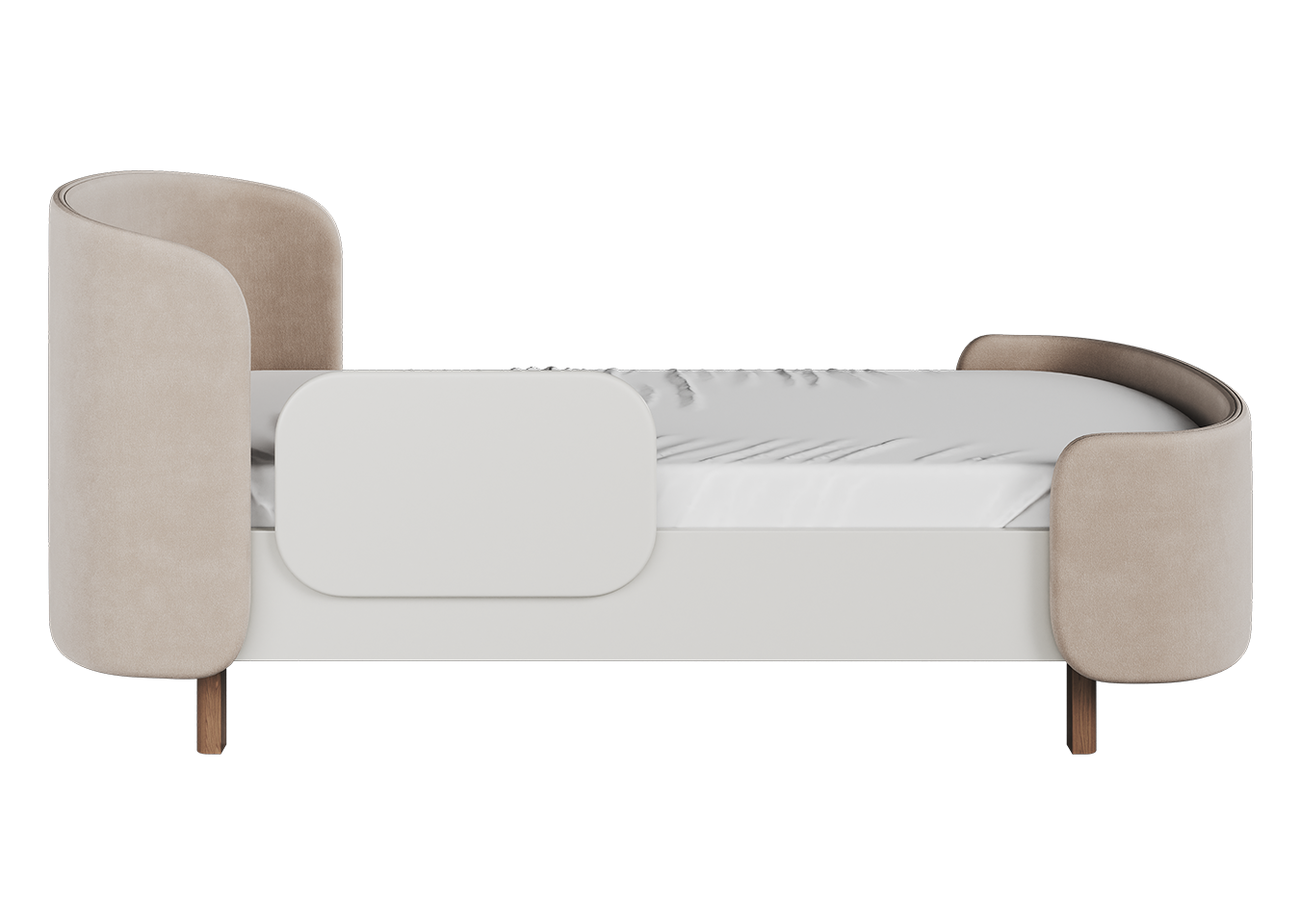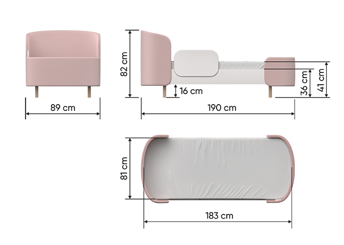 Закруглённые углы и мягкая приятная на ощупь обивка делают кровать уютной и безопасной.