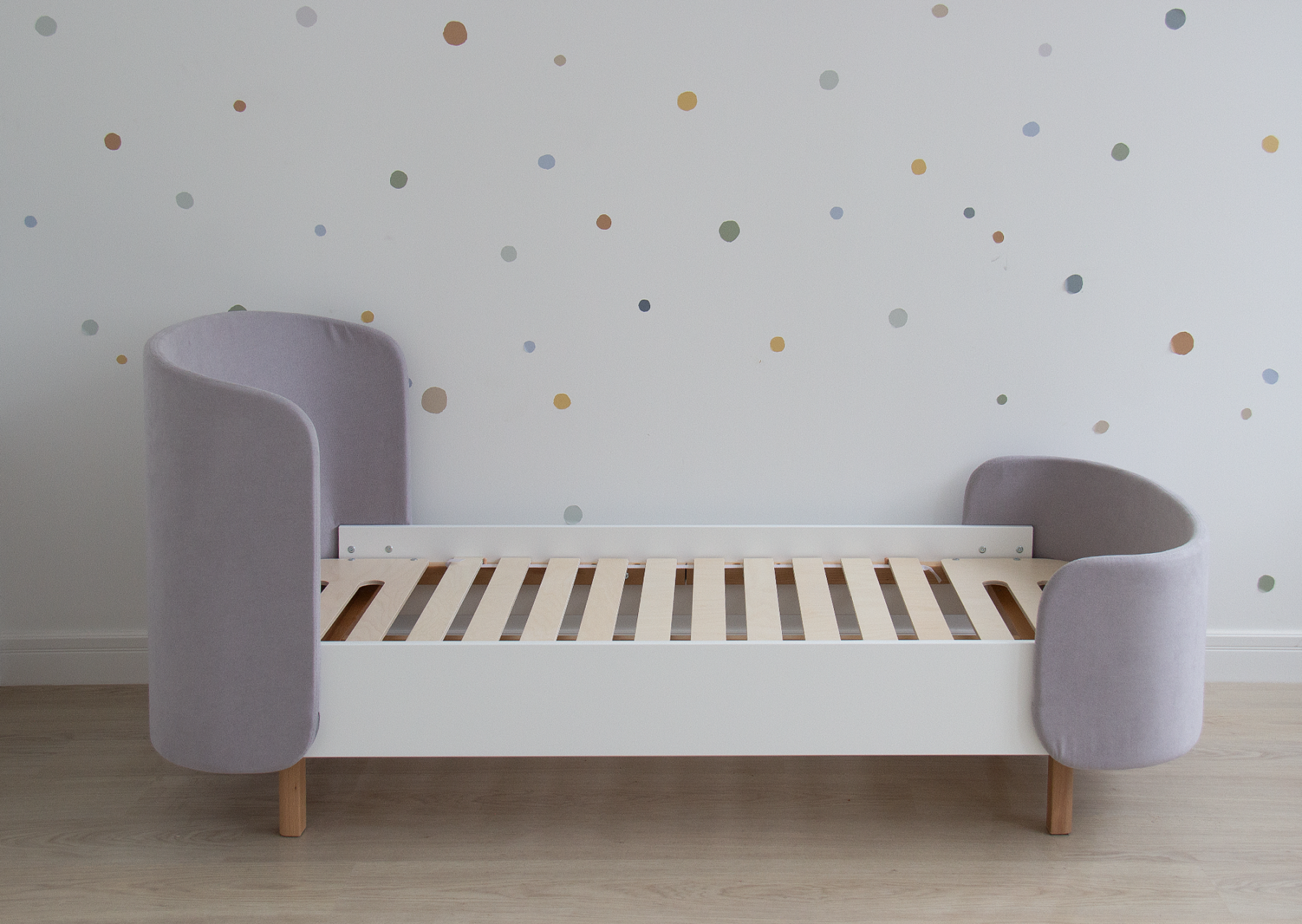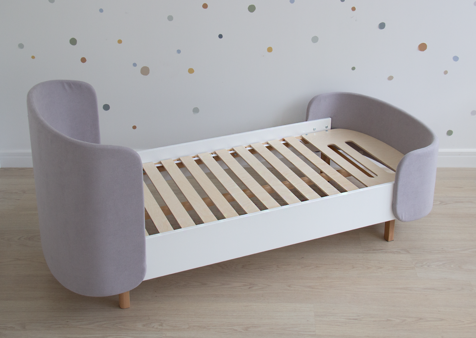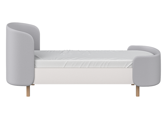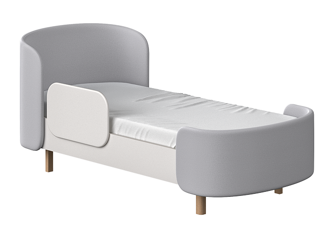 Закруглённые углы и мягкая приятная на ощупь обивка делают кровать уютной и безопасной.