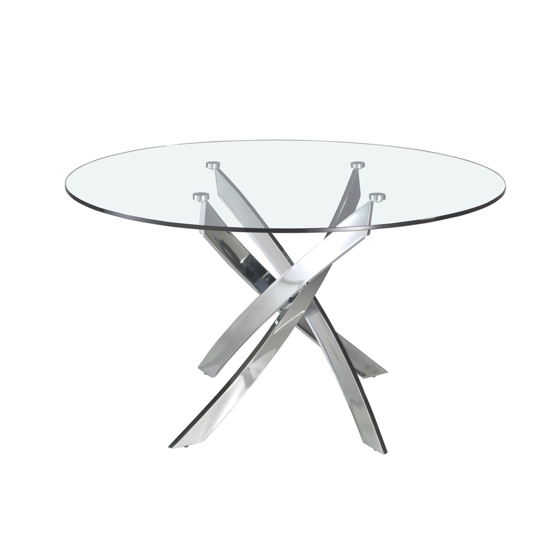 Стол изготовлен из закаленного стекла и металла. Столешница имеет круглую форму, поэтому более безопасна в эксплуатации. Благодаря высокой прочности материала, она не боится ударов твердыми предметами и воздействия высоких температур. Удерживают столешницу четыре ножки, которые изготовлены из хромированной стали. Этот материал обеспечивает высокую стойкость к весовым нагрузкам и не поддается негативному воздействию влаги.