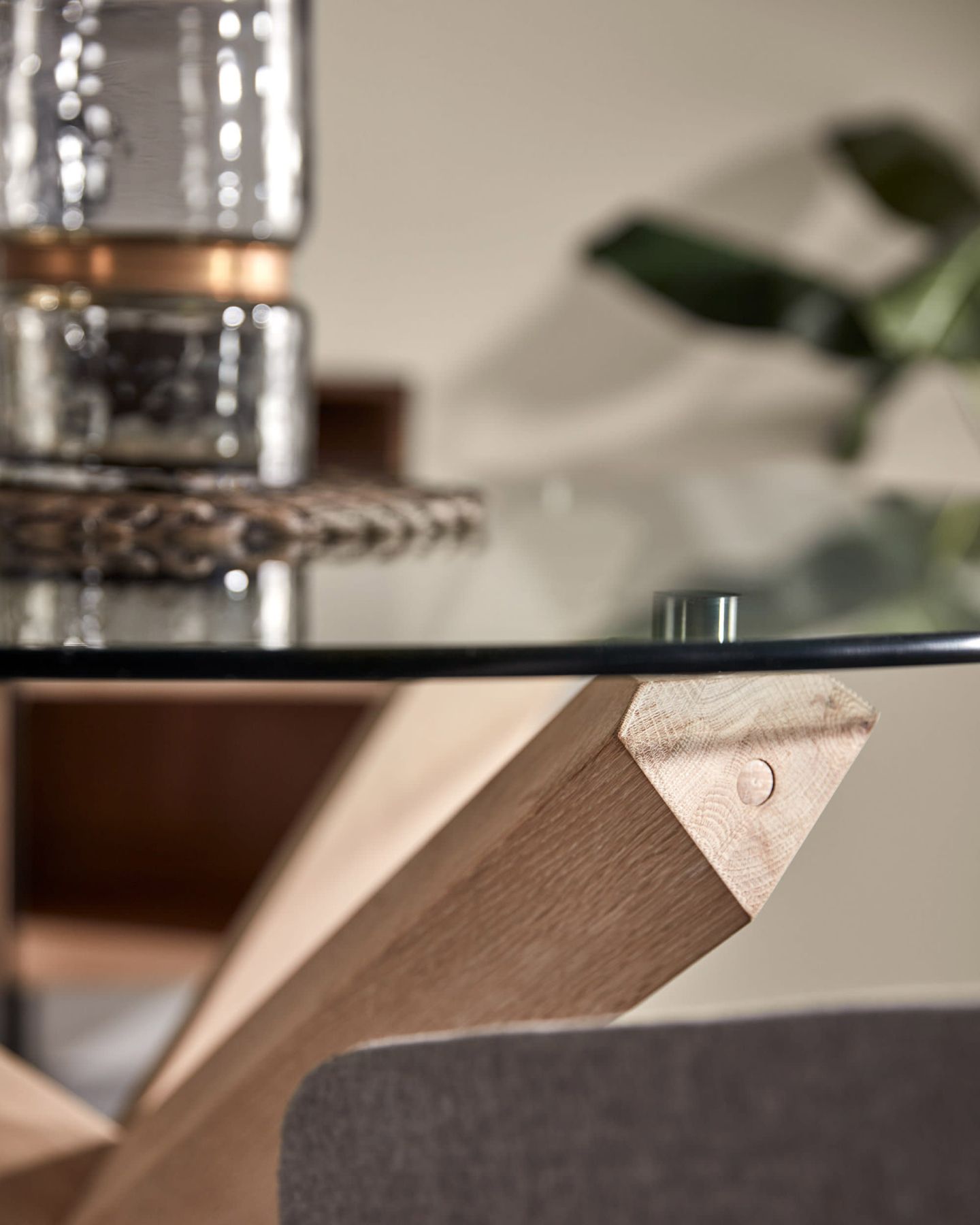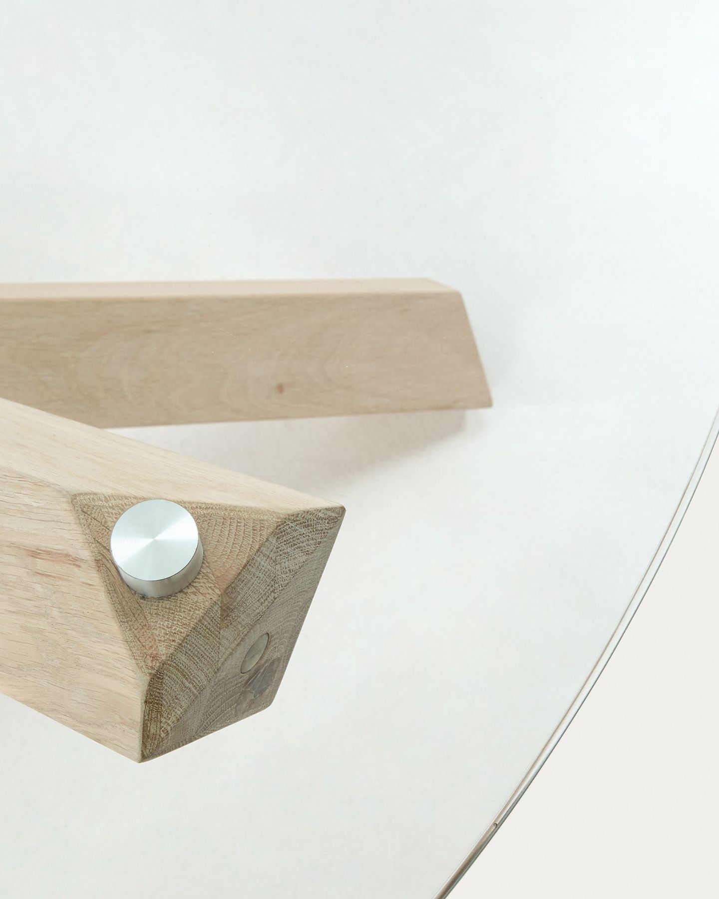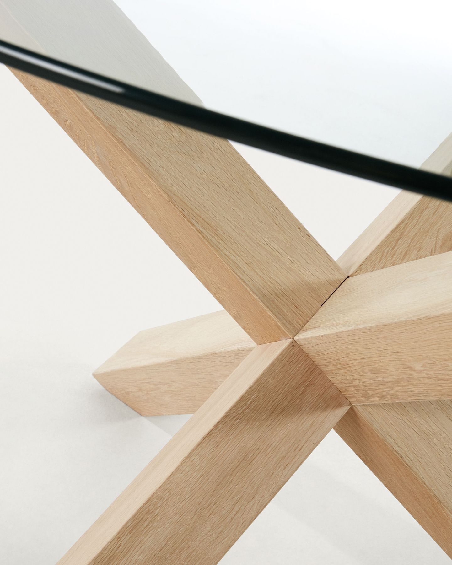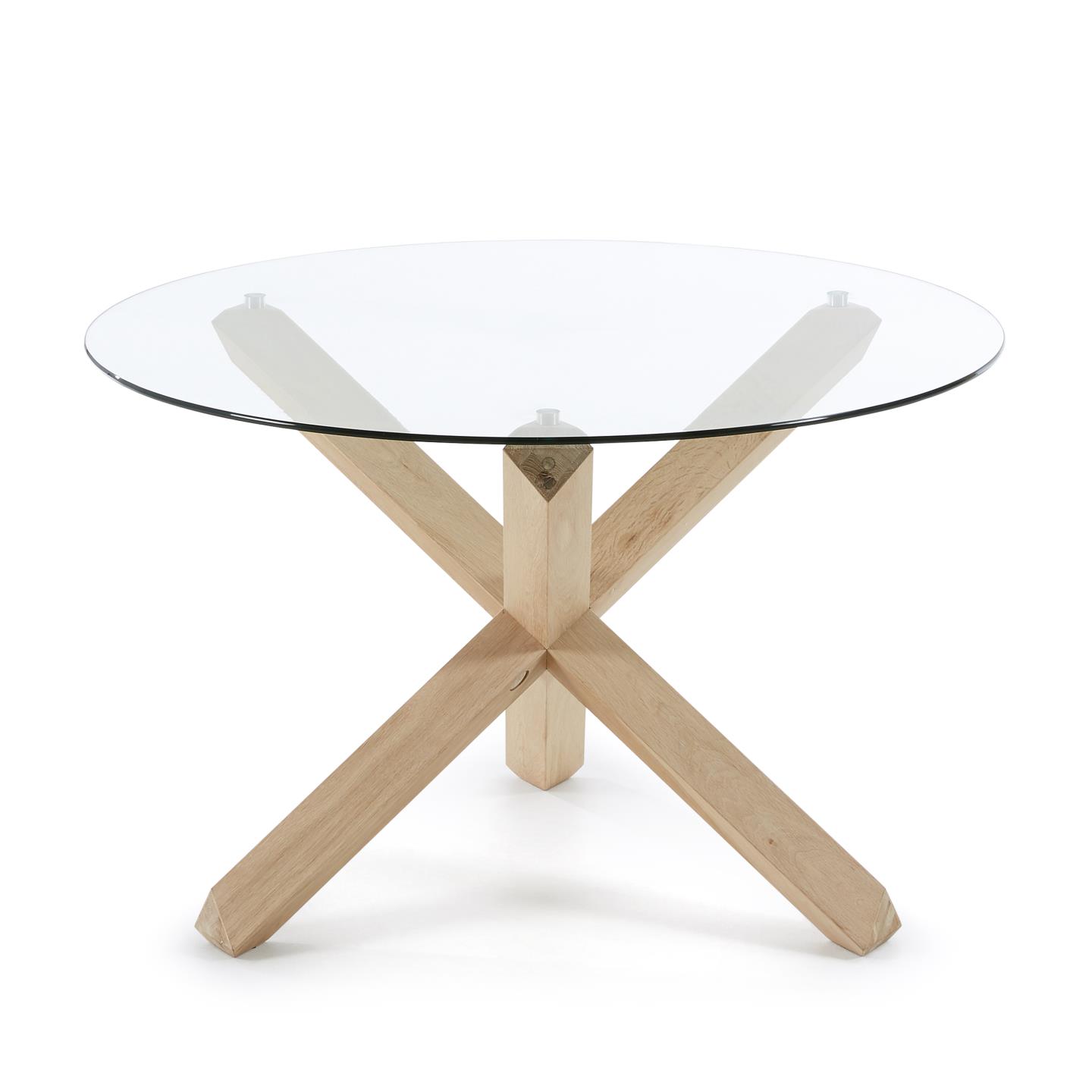 Стол Arendal Ø120 дуб, стекло от фабрики La Forma – дизайн на контрастах для городской квартиры. Стол Arendal никогда не останется без внимания. Особенность его дизайна в том, что лаконичное стекло удерживают деревянные бруски, имеющие совершенно иной «характер». Дружба этих двух материалов в подобном исполнении спорная, но однозначно она цепляет взгляд. Ее безусловно оценят поклонники авангардного минимализма. Стол имеет круглую форму. Столешница сделана из прозрачного ударопрочного стекла толщиной 1,2 см. Удерживает столешницу деревянная опора, которая имеет пятиконечную конструкцию. Она изготовлена из массива дуба, известного своей прочностью и долговечностью. Для защиты дерева от влаги поверхность покрыта бесцветным лаком. Верхняя и нижняя части конструкции симметричны между собой. Благодаря этому обеспечивается равномерное распределение нагрузки, веса стола. Размеры стола: диаметр – 120 см, высота – 77 см. Вес – 30,4 кг. В комплектацию включены крепеж и инструкция. В коллекции обеденных столов La Forma есть аналогичная модель с деревянной столешницей.