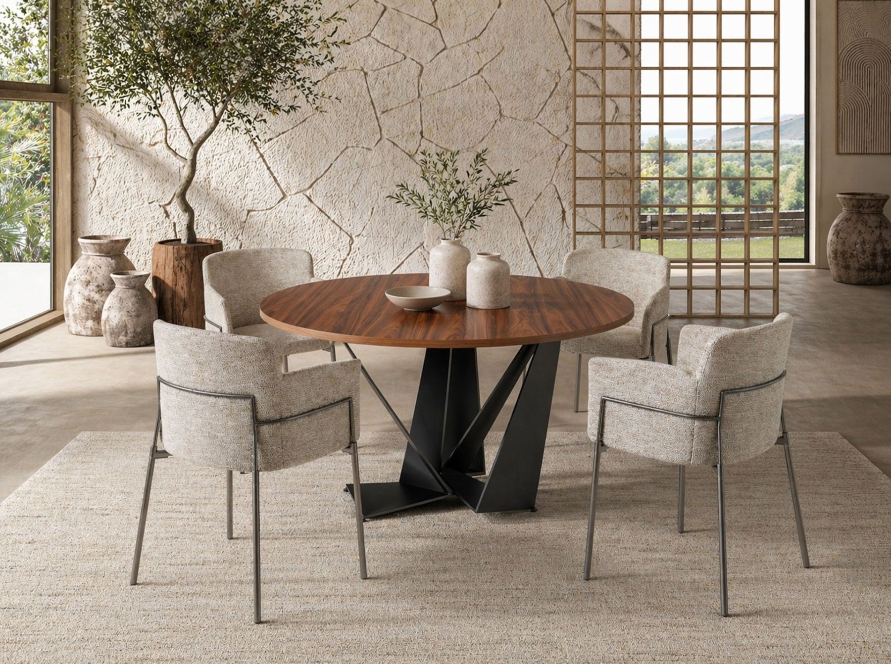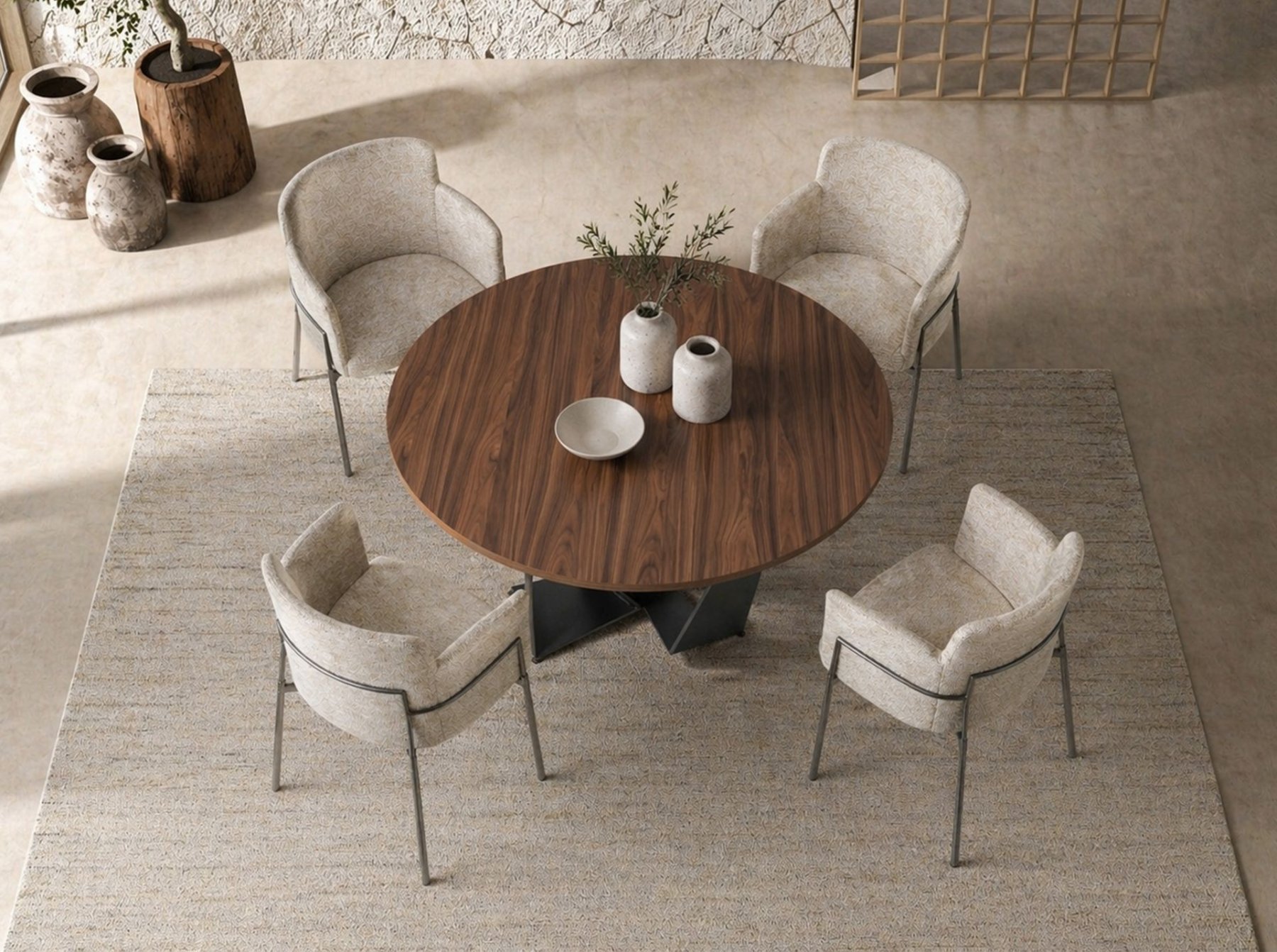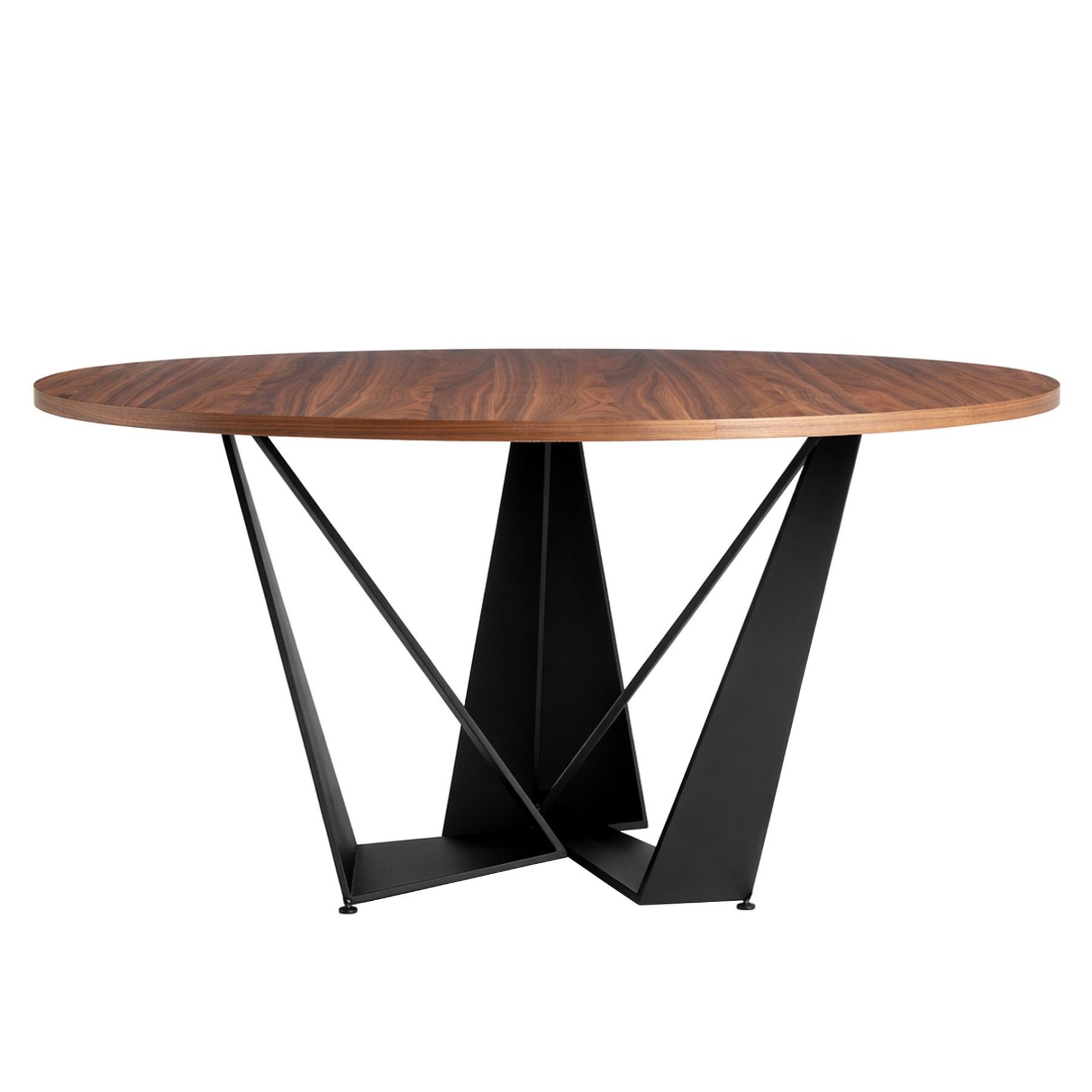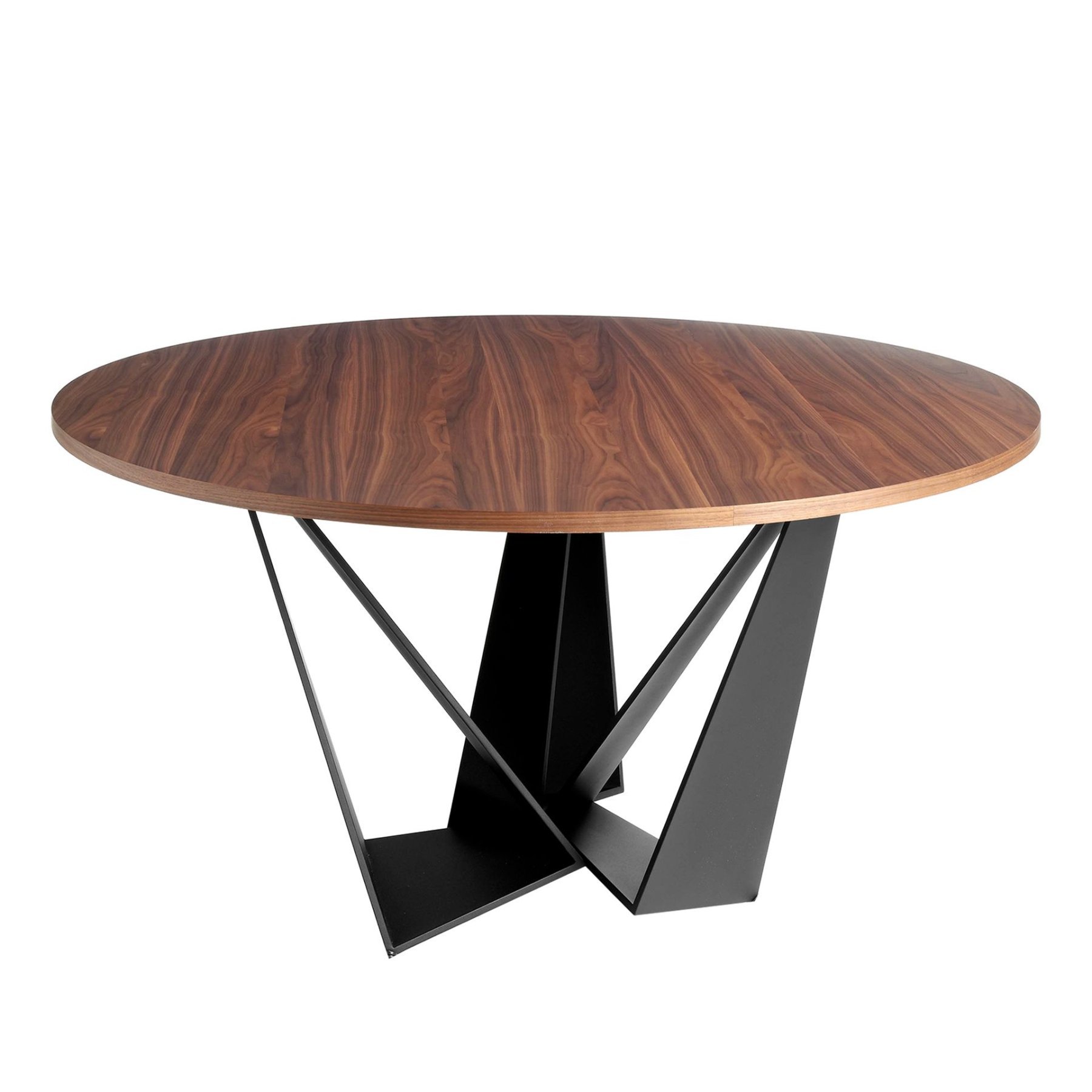Современный круглый обеденный стол с фиксированной столешницей из натурального орехового шпона. Ключевыми элементами, выделяющими его дизайн, являются оригинальные ножки из черной нержавеющей стали.