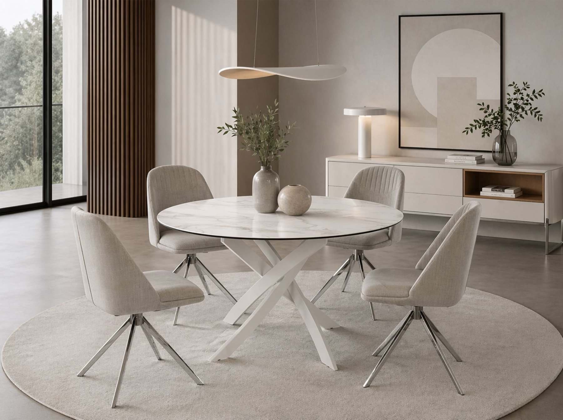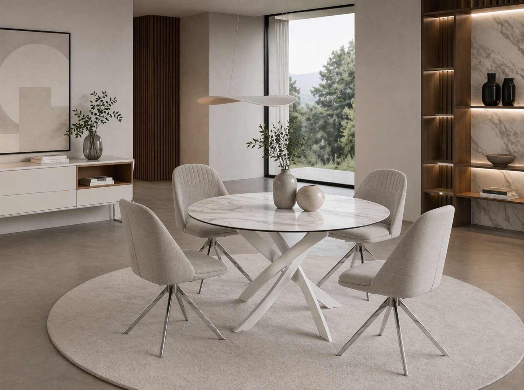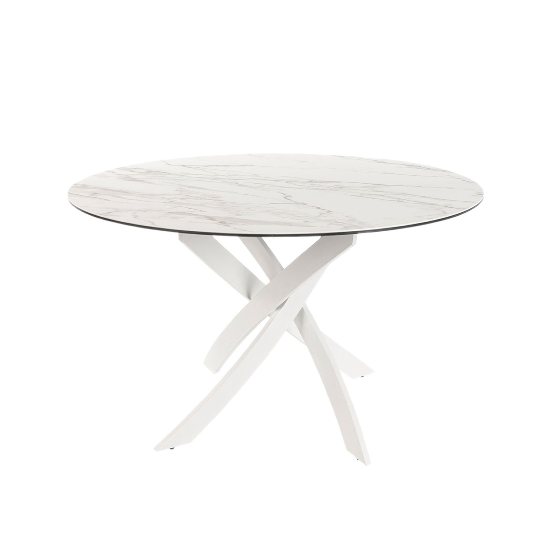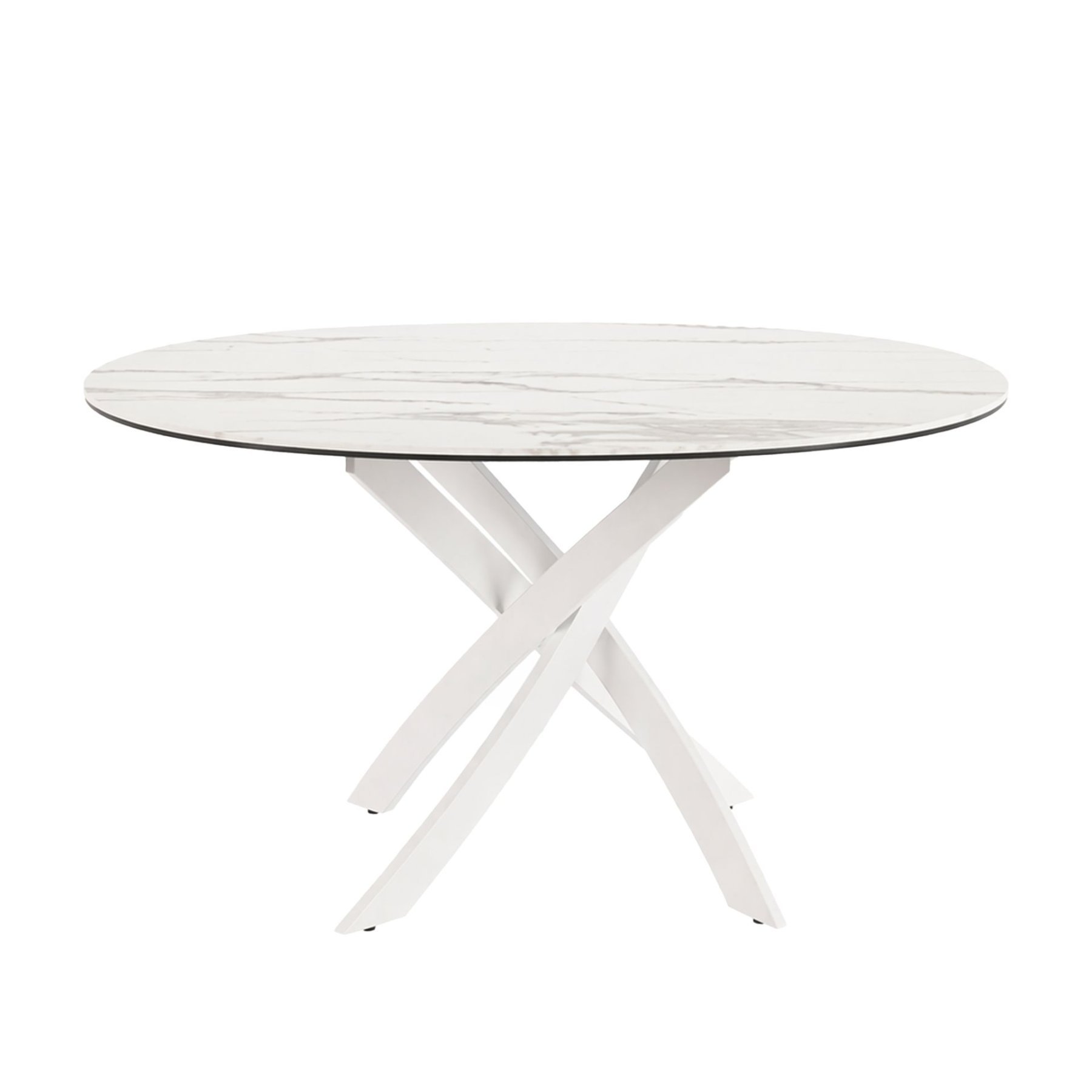 Современный круглый обеденный стол с фиксированной столешницей из белого фарфорового мрамора с серыми прожилками и матовой поверхностью. Ключевыми элементами дизайна являются оригинальные белые стальные ножки.