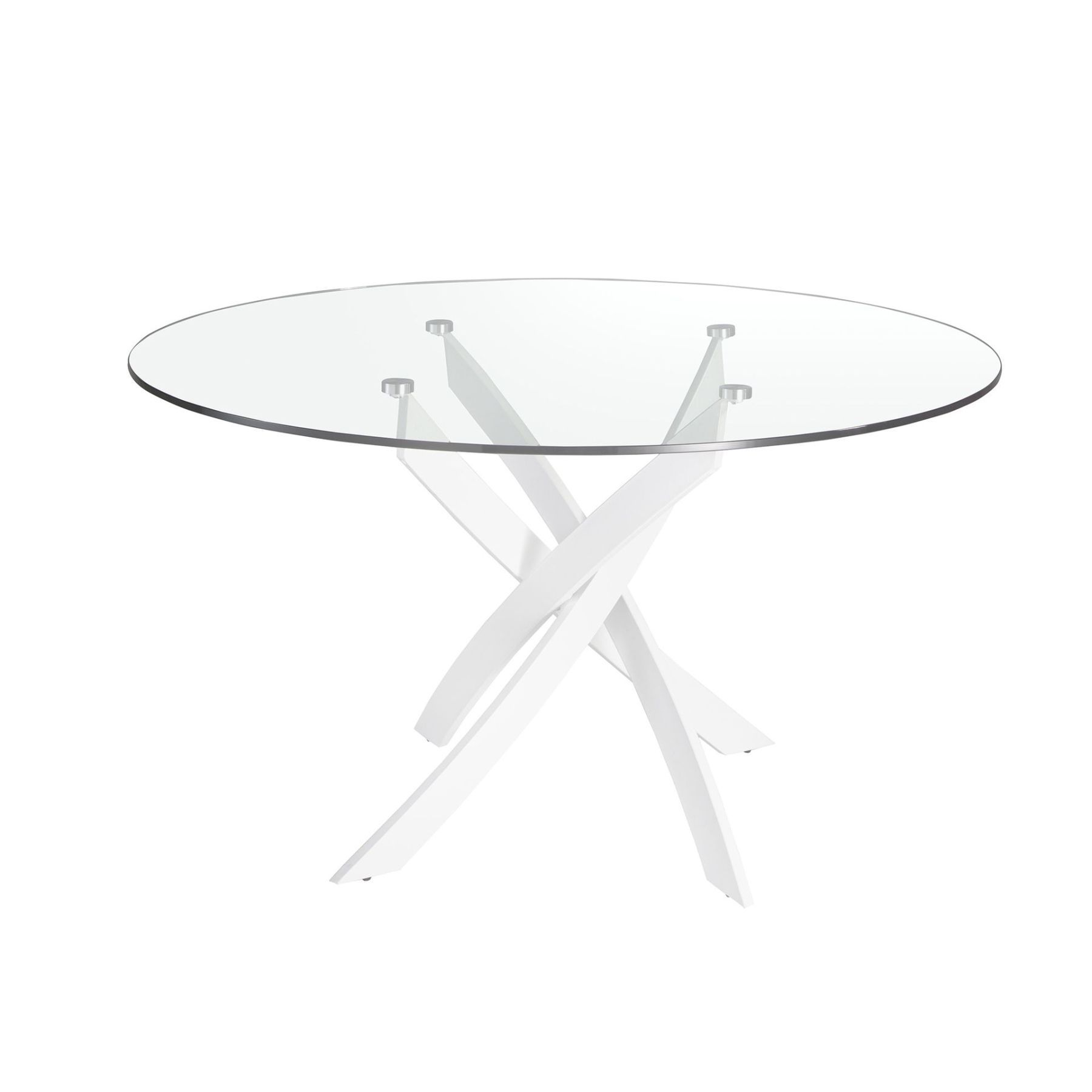 Круглый обеденный стол современного дизайна со столешницей из закаленного стекла. Ключевыми элементами дизайна являются оригинальные стальные ножки, окрашенные в белый цвет.