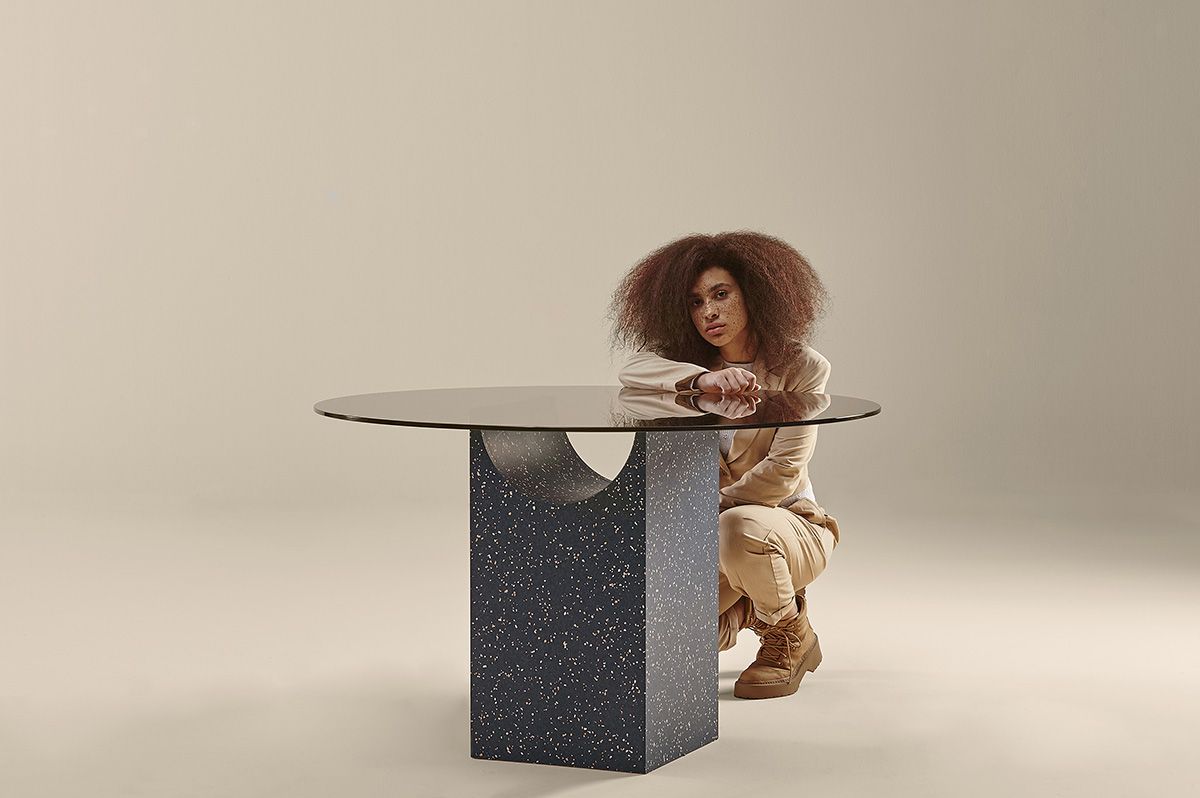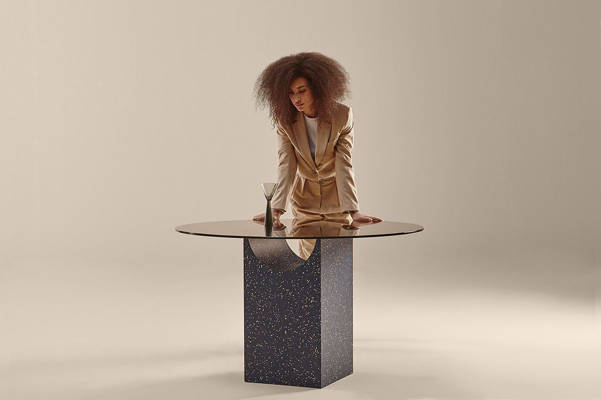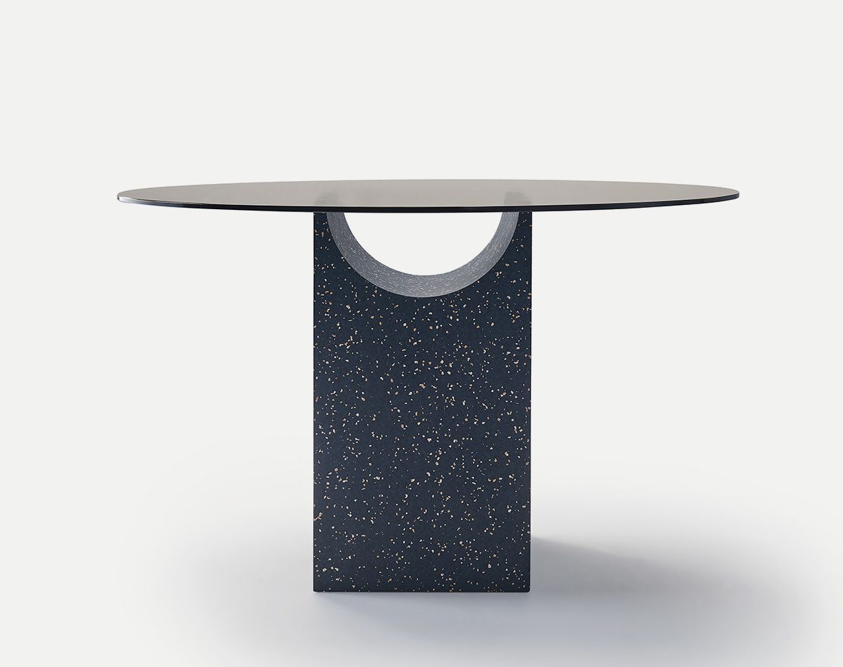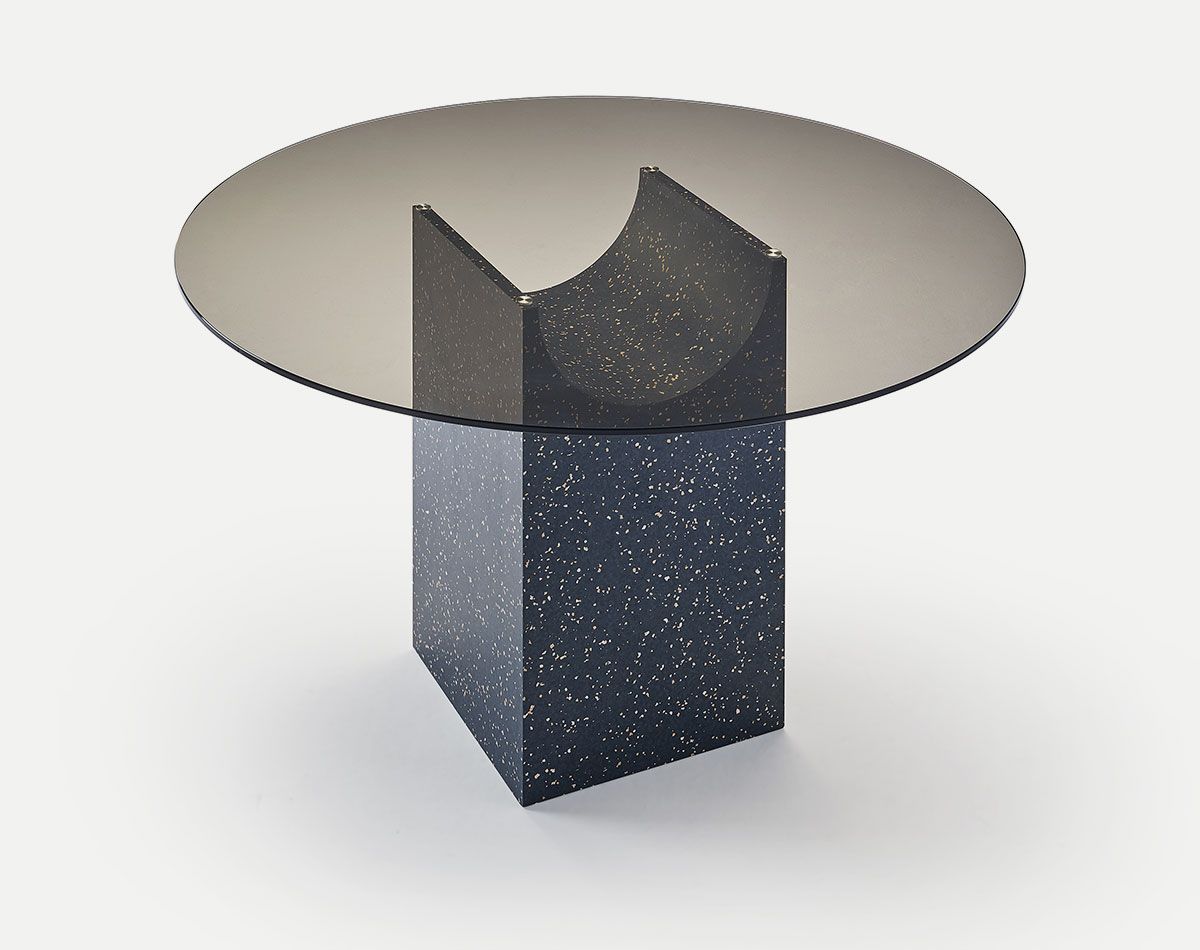 Скульптурное основание образовано прямоугольным блоком, из верхней части которого вычитается цилиндрический участок. Верхняя часть из закаленного стекла деликатно опирается на тонкие линии, которые были обнажены пересечением обеих геометрических фигур. Честная эстетика, которая демонстрирует силу и красоту простыми способами.